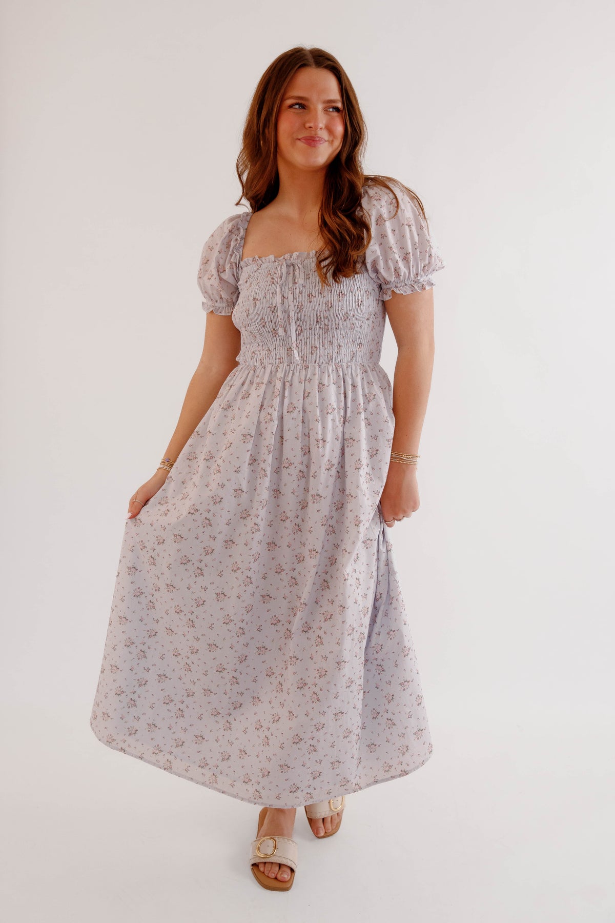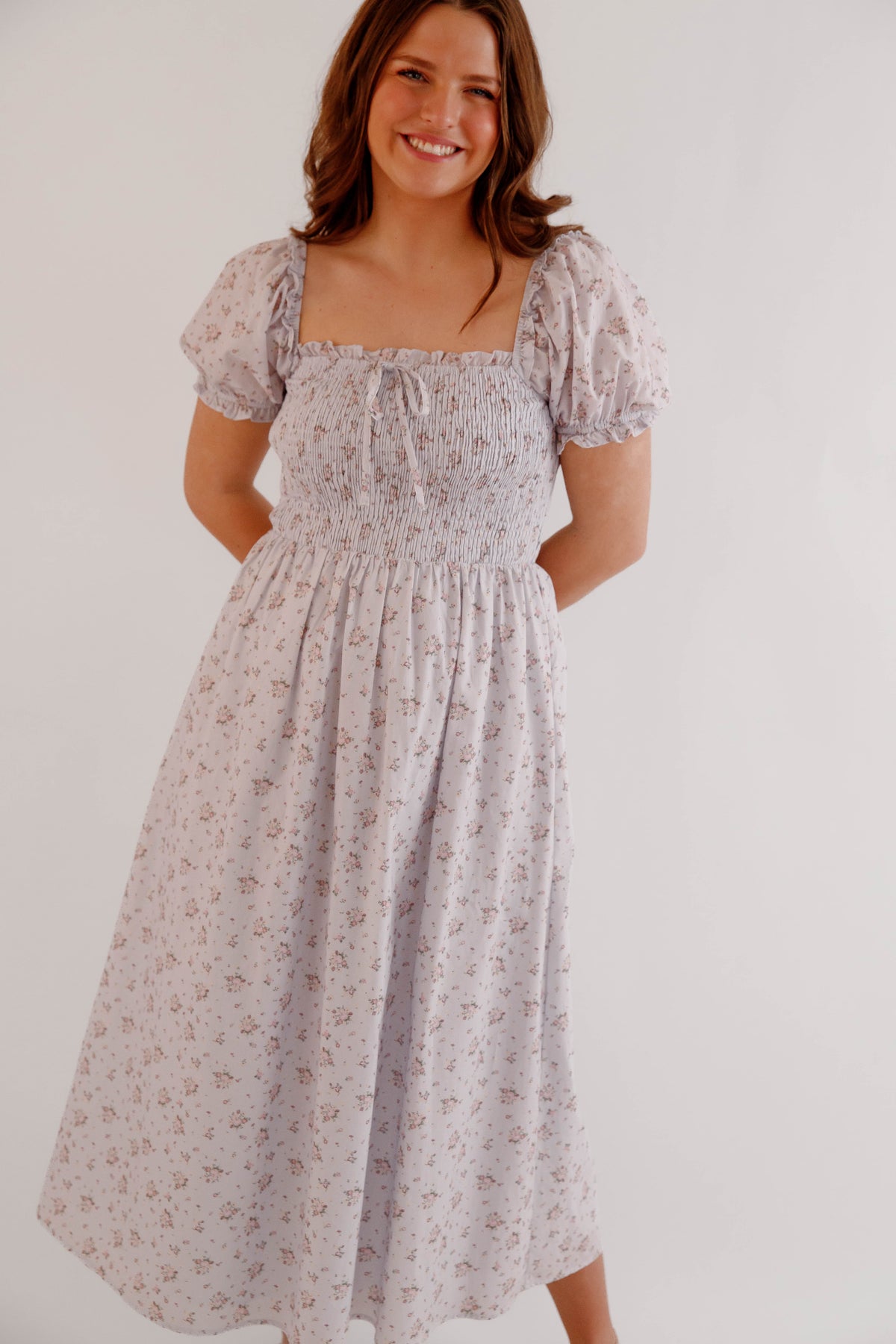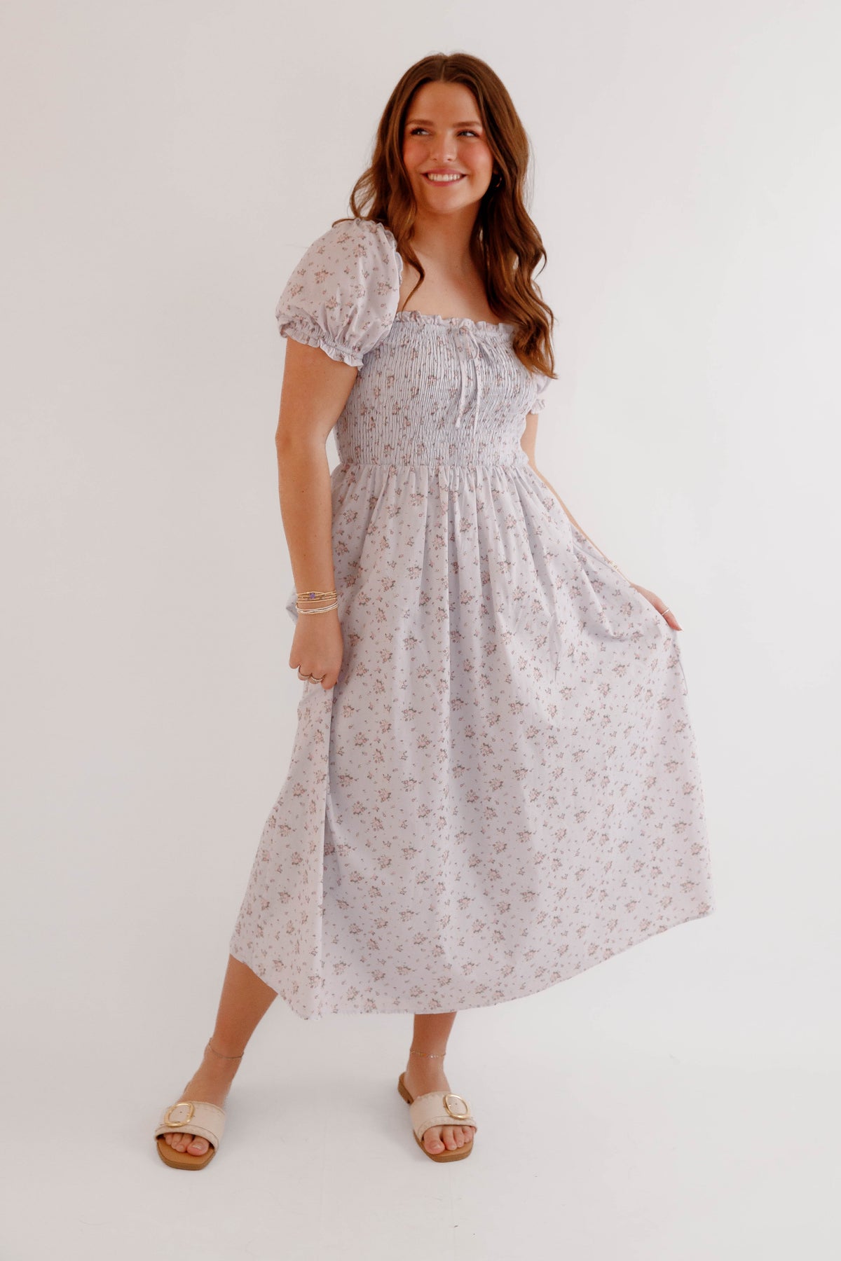 Soft, romantic, and effortlessly feminine, this floral smocked puff sleeve midi dress is a timeless addition to any spring and summer wardrobe. Designed with a beautifully textured smocked bodice, this dress offers a flattering and comfortable fit while highlighting the waist with a softly gathered midi-length skirt that moves beautifully with every step. Delicate puff sleeves and a subtle floral print give this dress a charming cottagecore-inspired aesthetic, perfect for brunch dates, garden parties, weddings, vacations, or everyday feminine styling. The square neckline adds a touch of vintage elegance, while the lightweight fabric keeps the look breathable and easy to wear all season long.