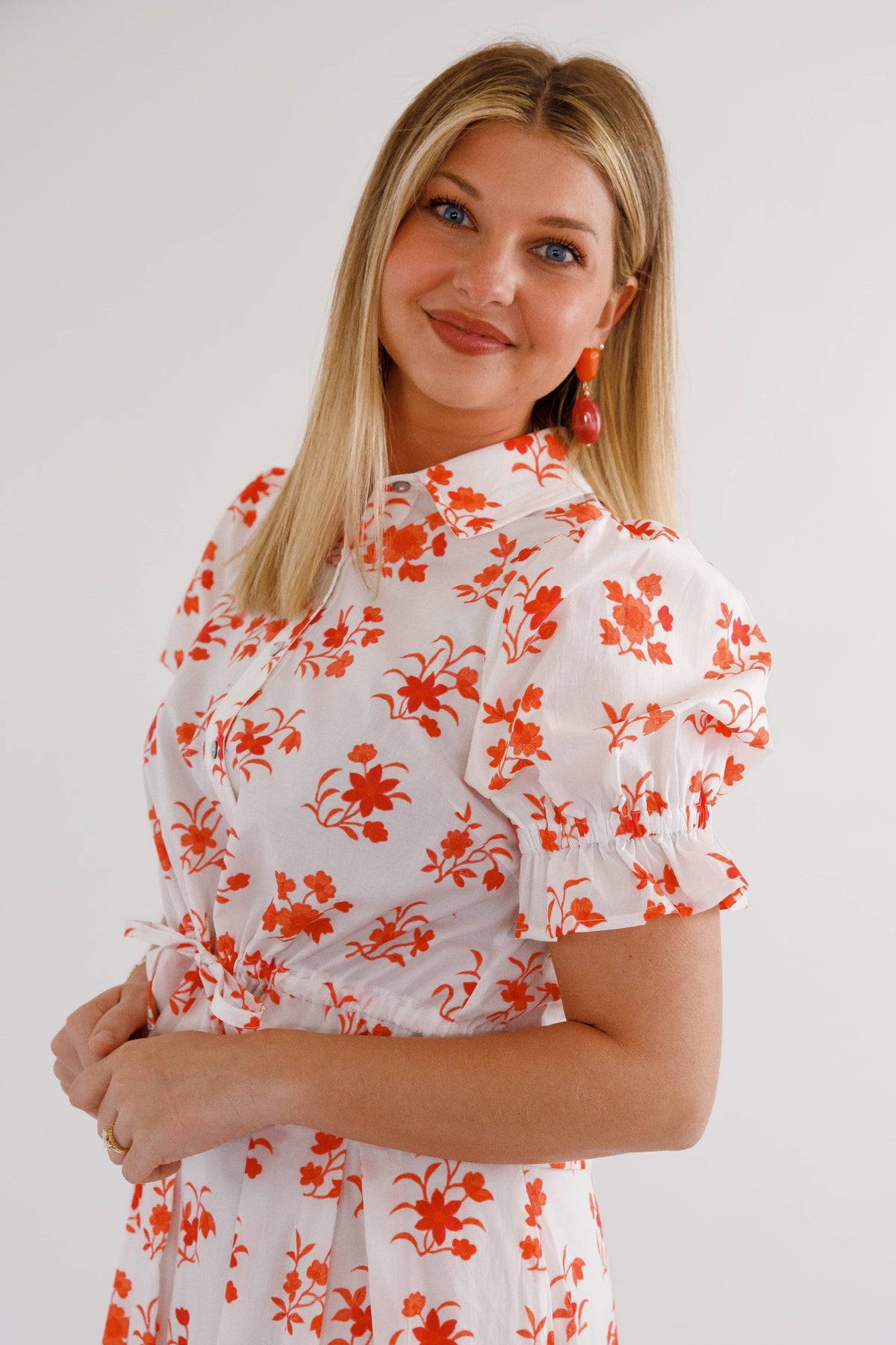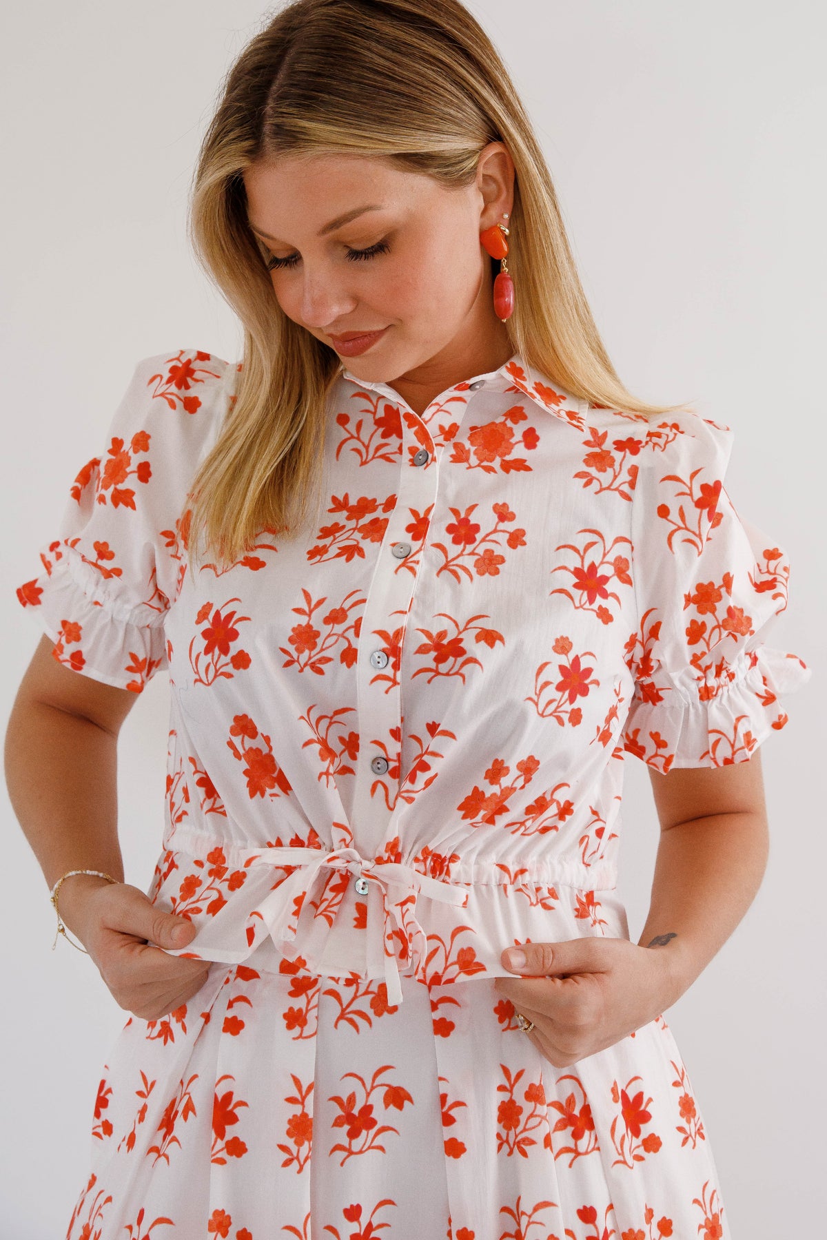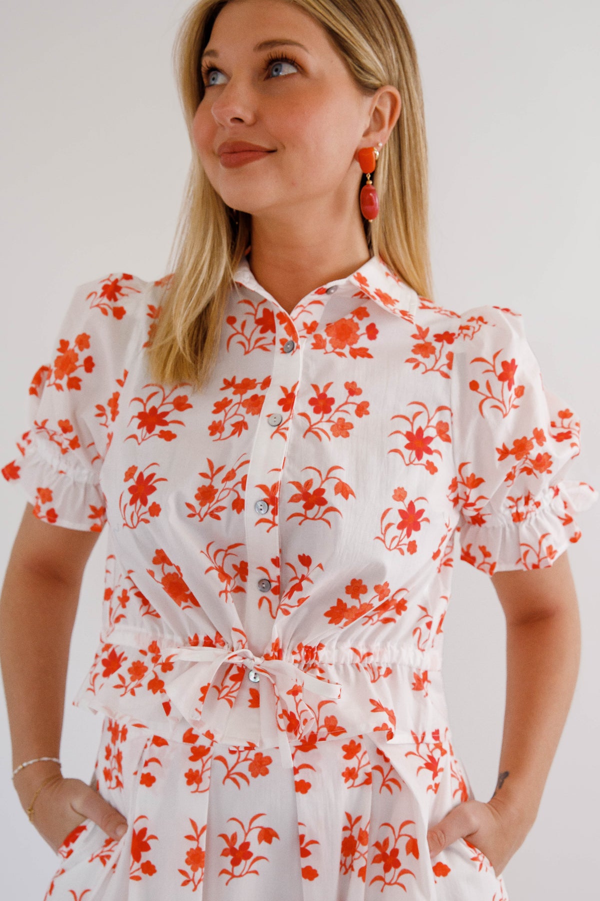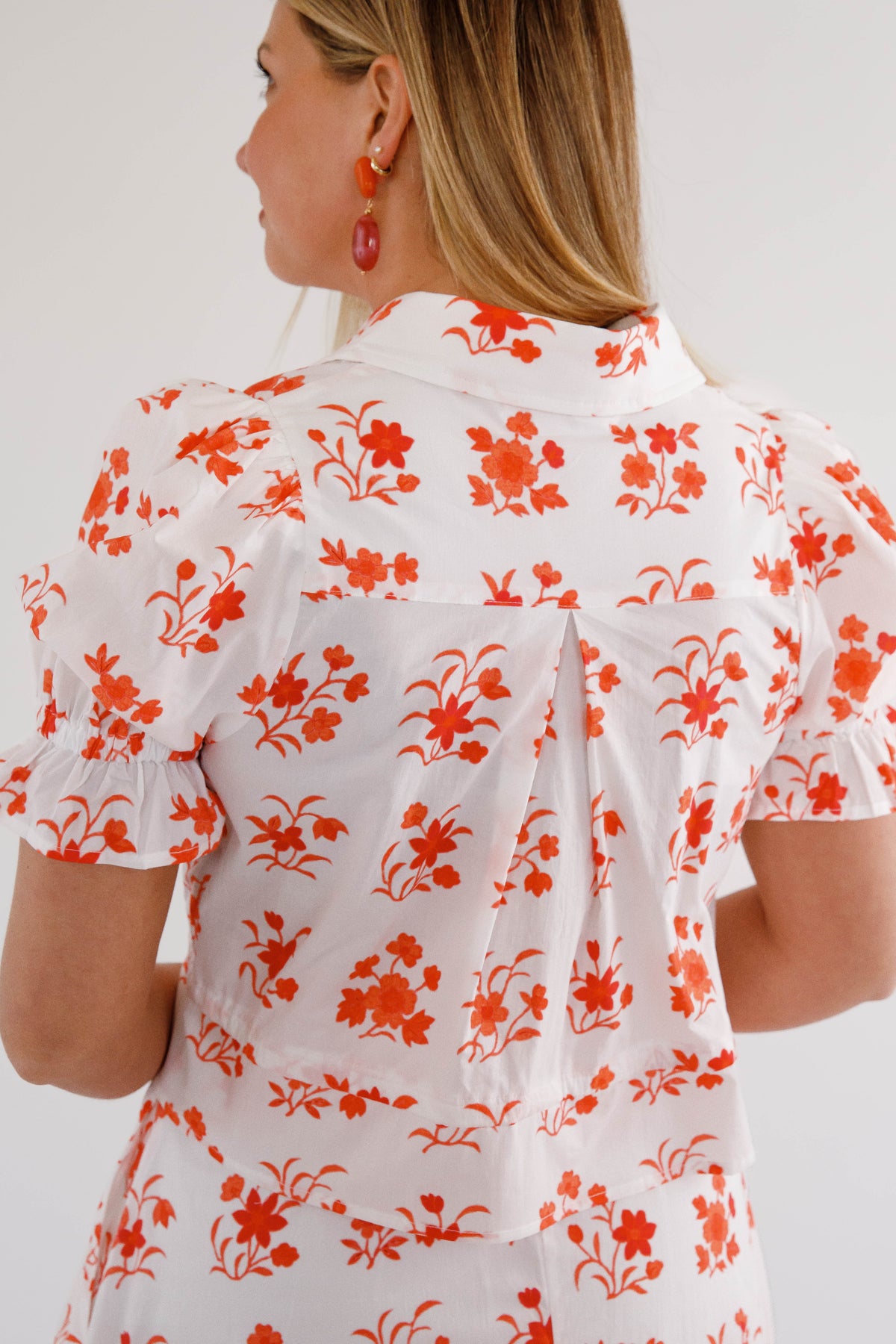 Make a statement with the In The Beginning Top, where botanical beauty meets everyday wearability. The structured collared neckline and front button closure deliver polished sophistication, while the elasticated waist with drawstring tie adapts to your shape for all-day comfort. Playful ruffle trim elevates the puff sleeves, creating dimension and movement. Whether you're heading to brunch or the office, this versatile short sleeve top becomes an instant favorite in your wardrobe rotation. Top can be worn as a separate or paired with the matching skirt.
