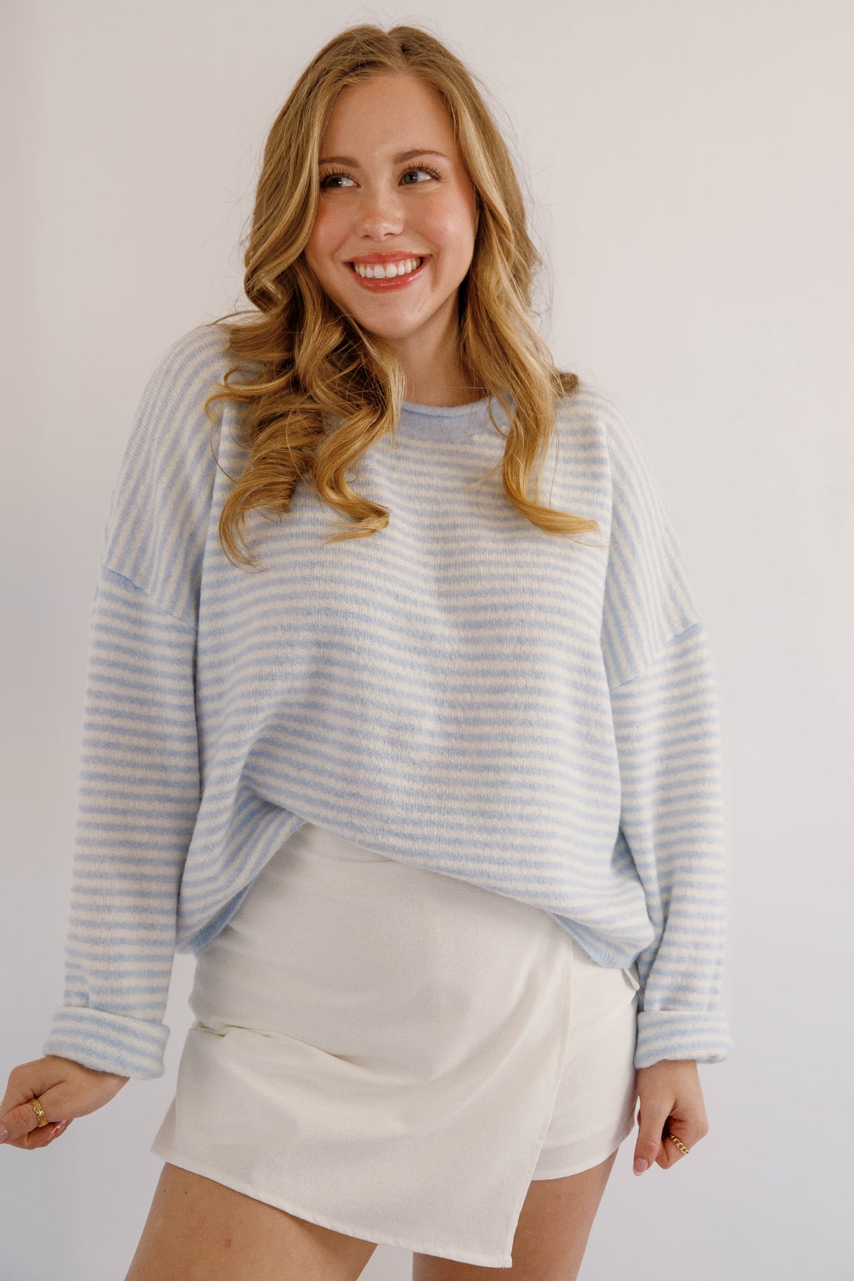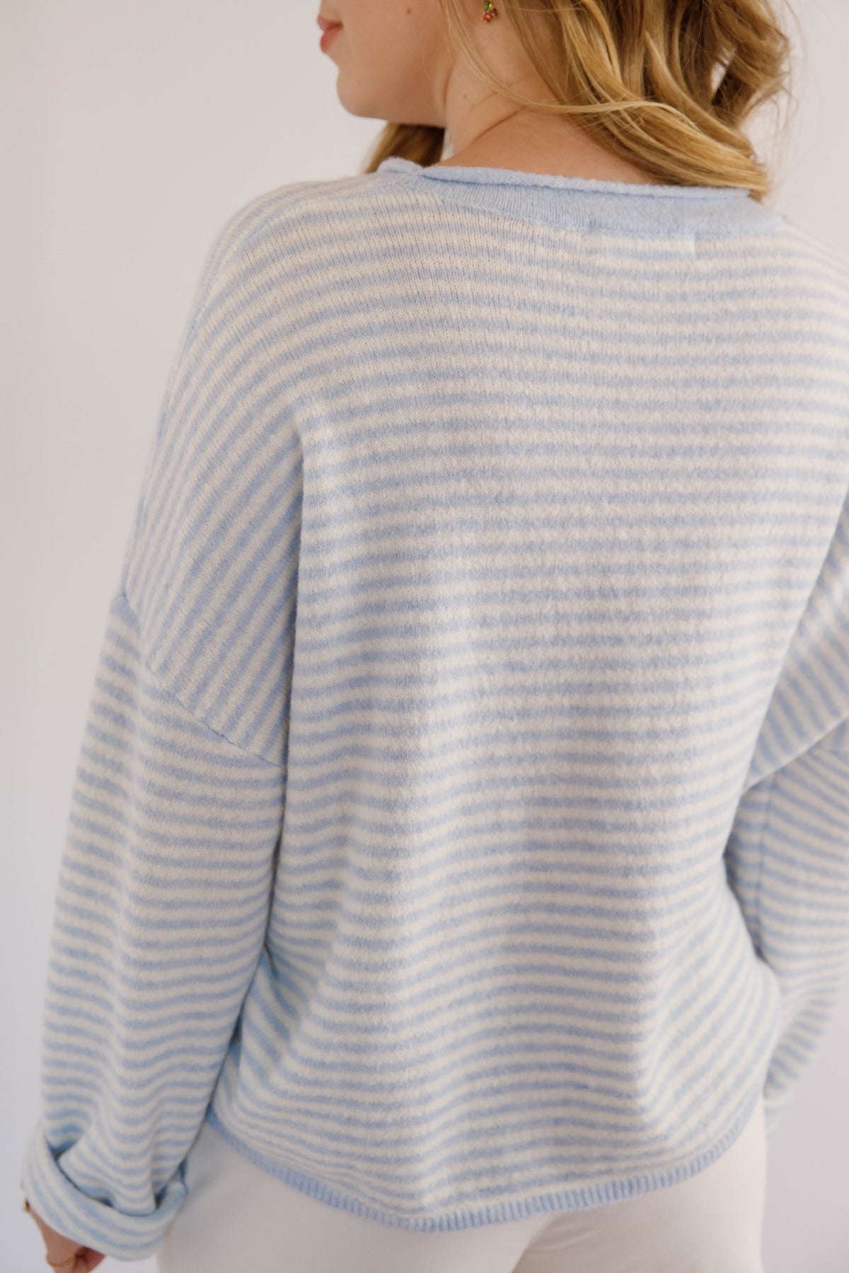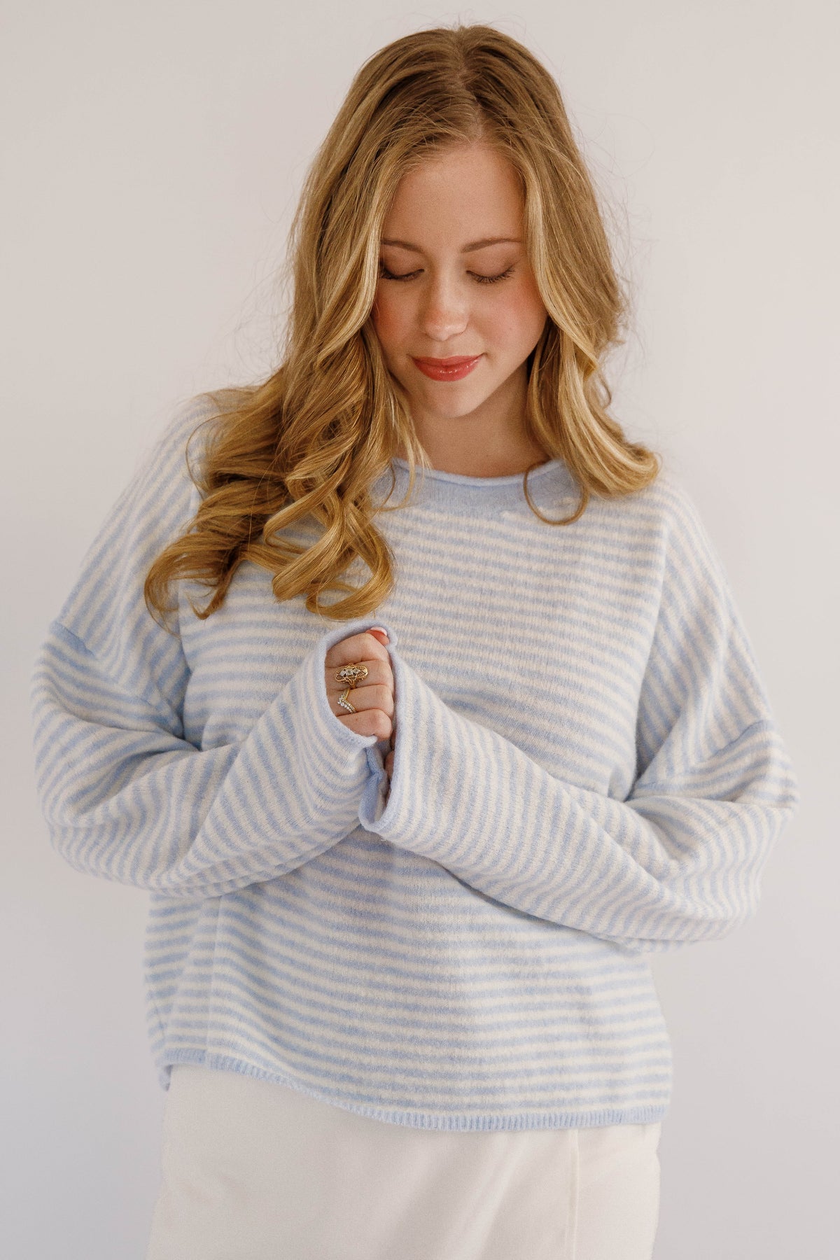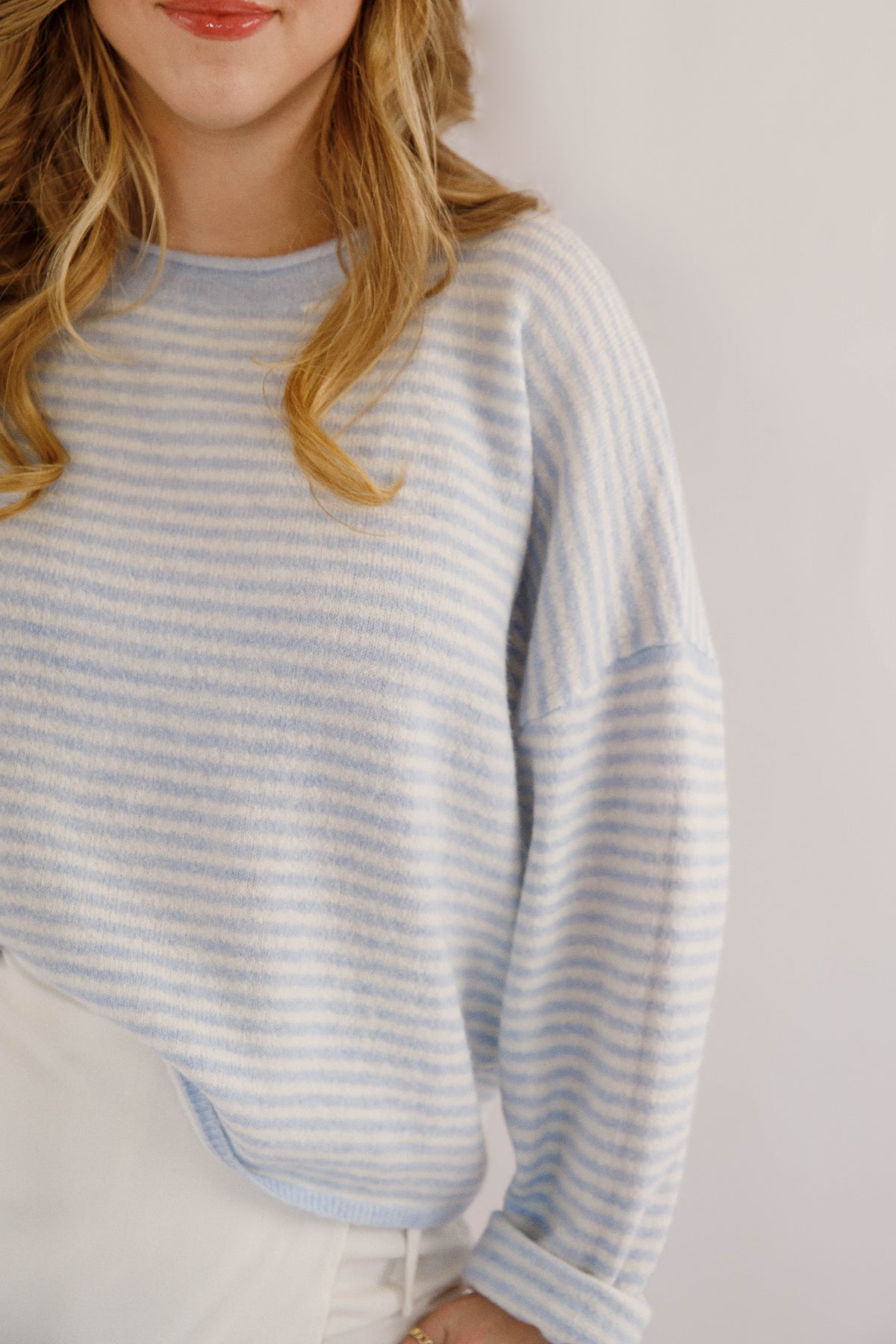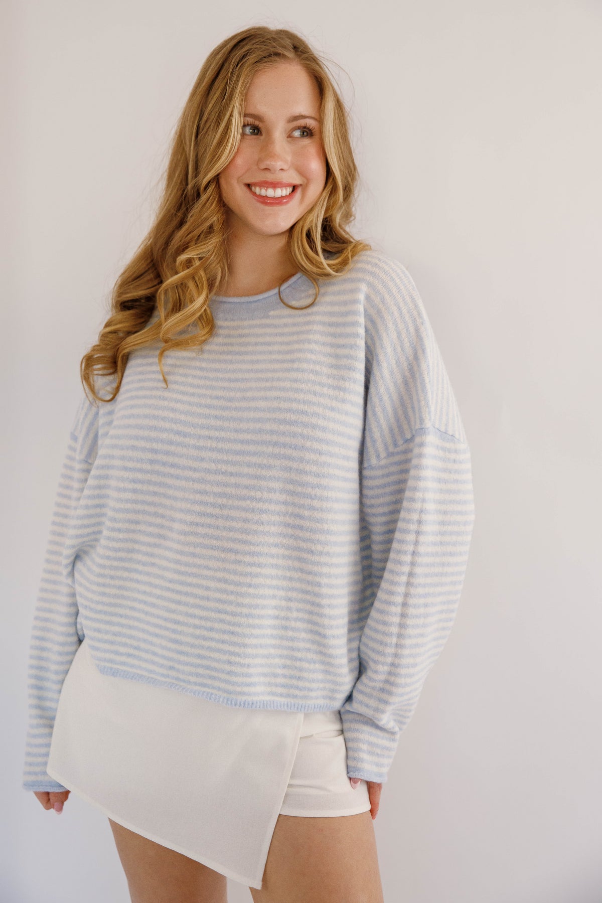 Refresh your wardrobe with this lightweight blue and white striped knitted sweater, designed for effortless everyday style. Crafted from a soft, breathable knit fabric, it offers all-day comfort without feeling heavy — perfect for layering in spring, summer evenings, or mild fall days. Featuring classic blue and white stripes, a relaxed fit, and a timeless crew neckline, this sweater pairs beautifully with jeans, shorts, or any work outfit.