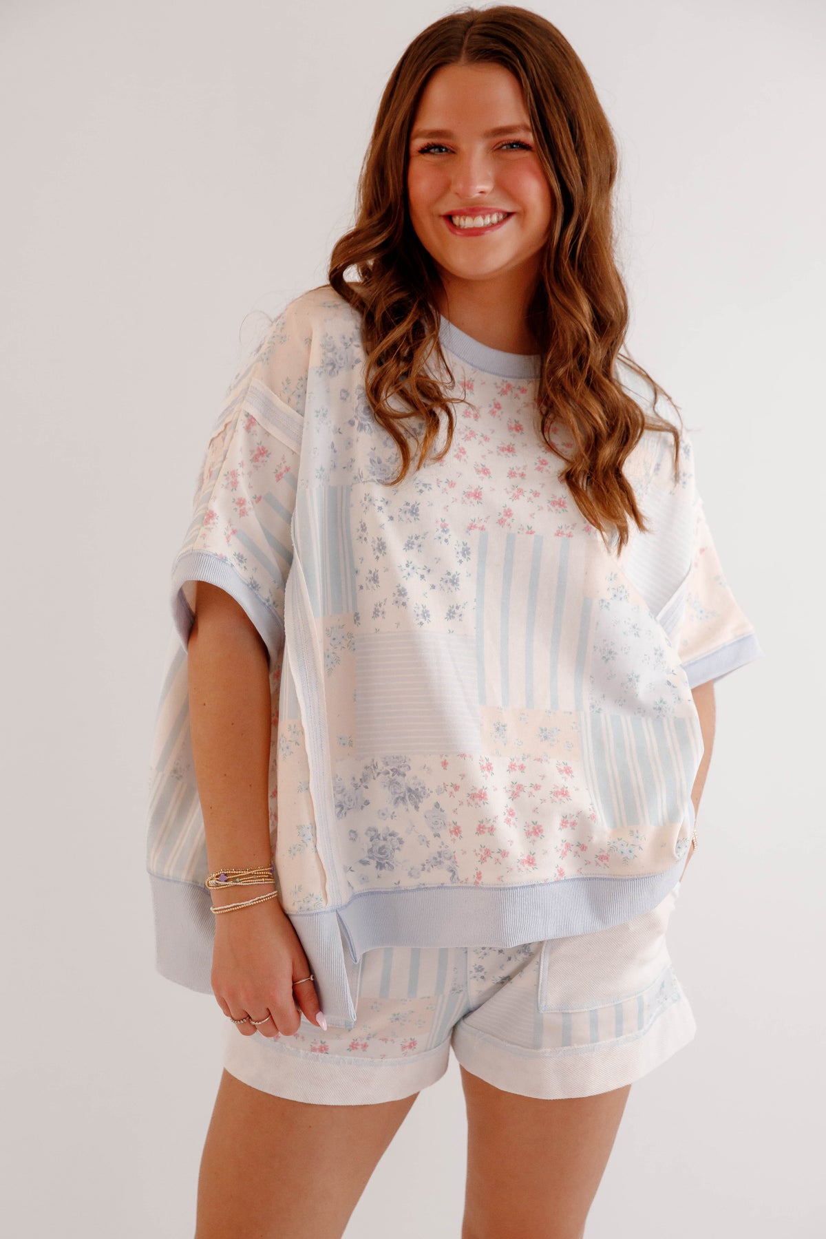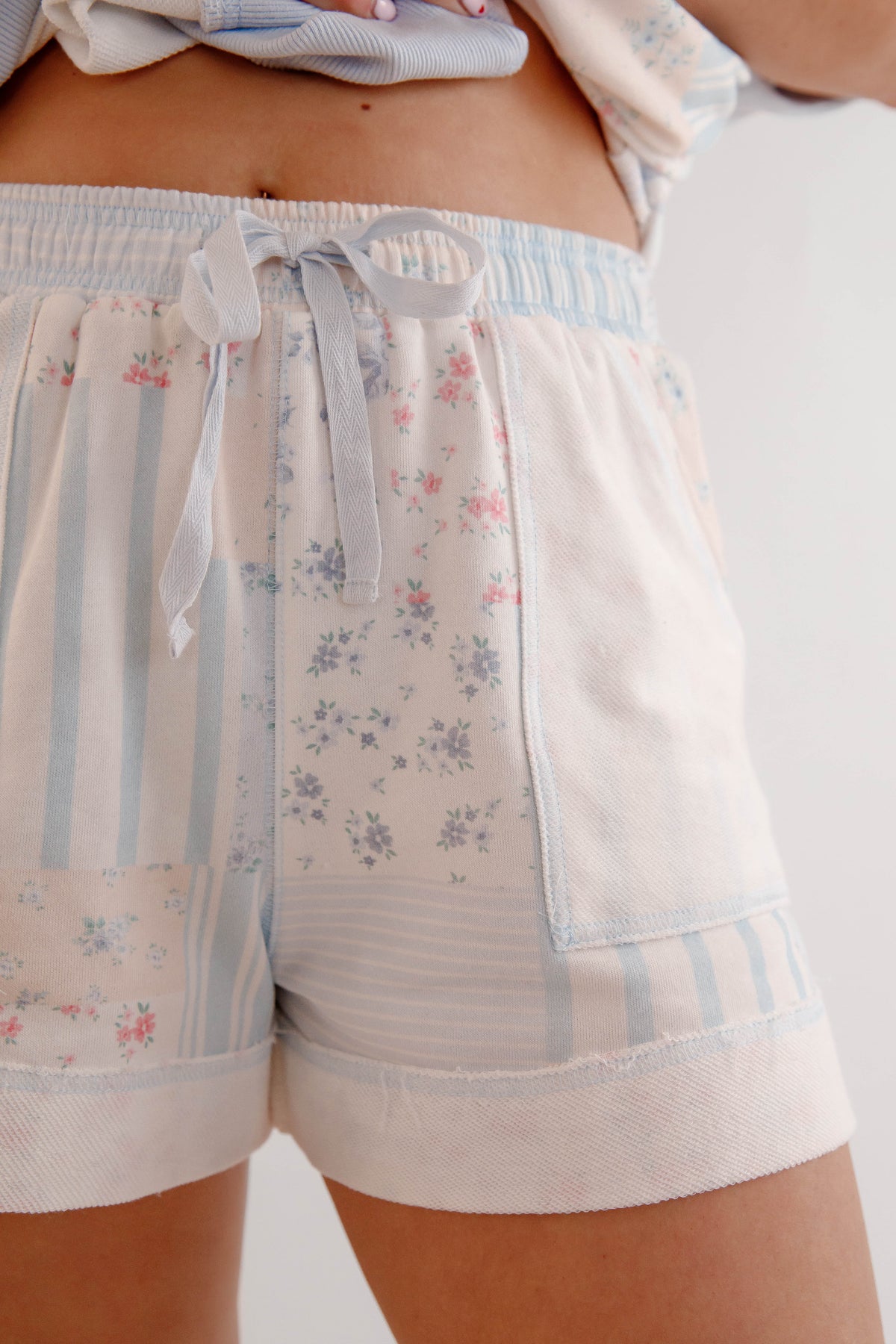 Embrace effortless style with these French terry shorts, featuring a striking stripe and floral patchwork design. The elastic waist offers comfortable everyday wear, while the mixed print pattern adds visual interest to your casual wardrobe.