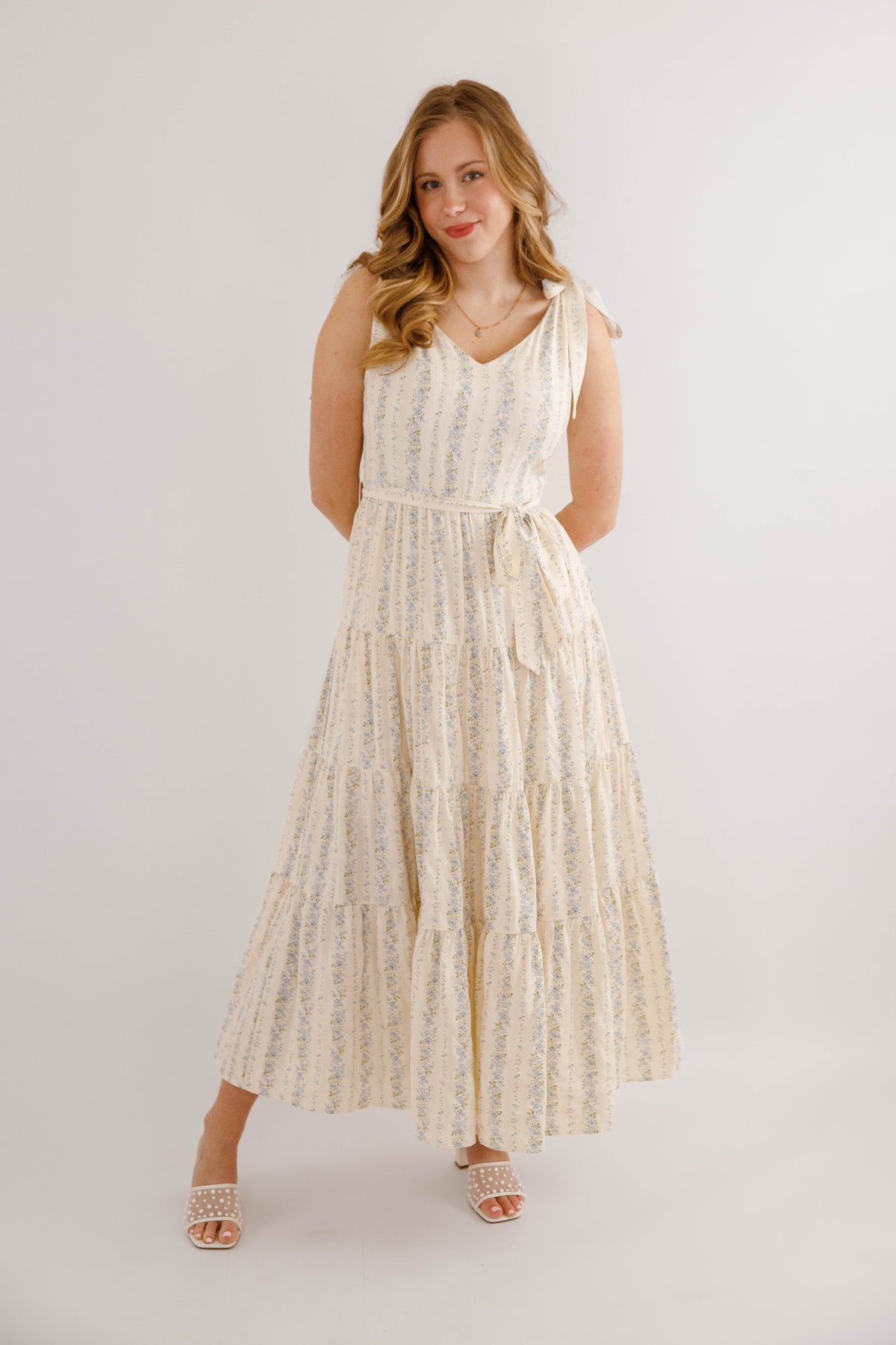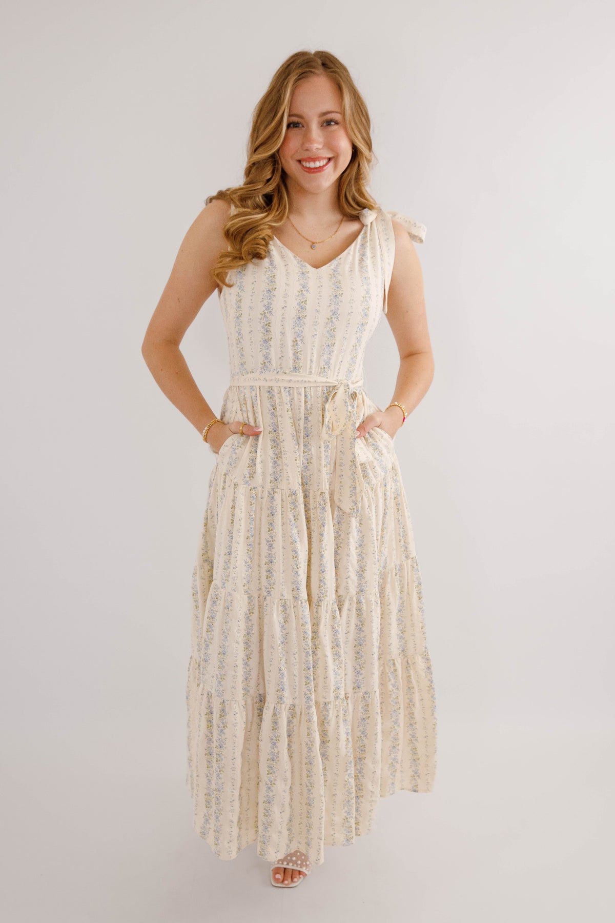 Embrace effortless spring style with this charming blue striped floral maxi dress. Featuring a romantic tiered skirt and adjustable tie straps, it offers a flattering silhouette enhanced by a cinched waist tie. The hidden side zipper ensures a seamless look, while the structured fabric provides a polished finish. Perfect for garden parties, weddings, or casual outings.
