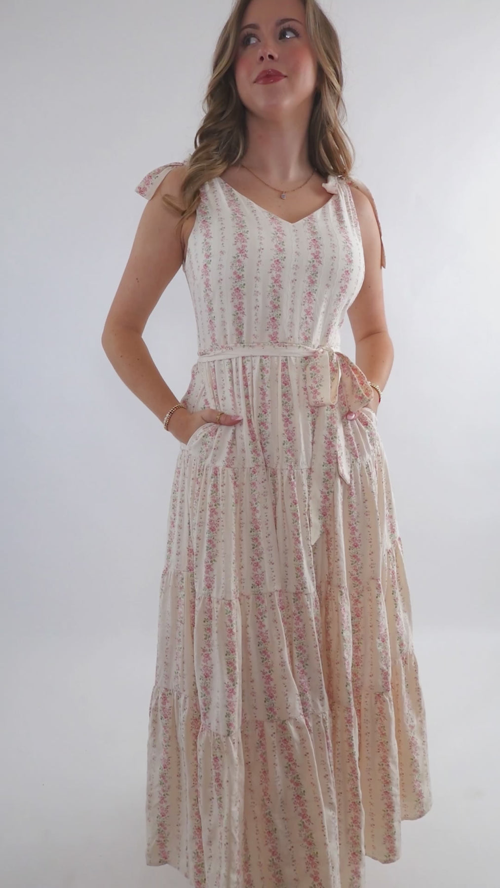 Embrace effortless spring style with this charming pink striped floral maxi dress. Featuring a romantic tiered skirt and adjustable tie straps, it offers a flattering silhouette enhanced by a cinched waist tie. The hidden side zipper ensures a seamless look, while the structured fabric provides a polished finish. Perfect for garden parties, weddings, or casual outings.
