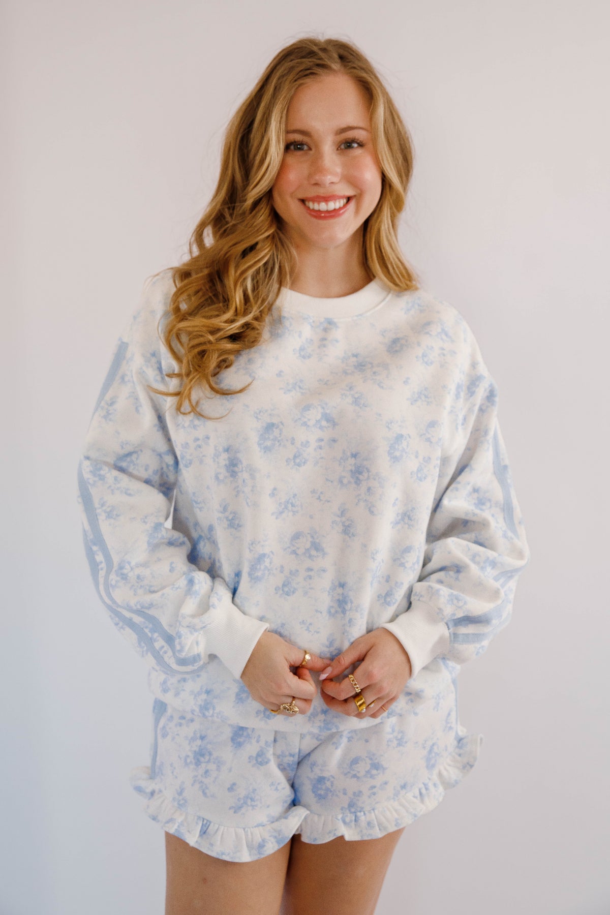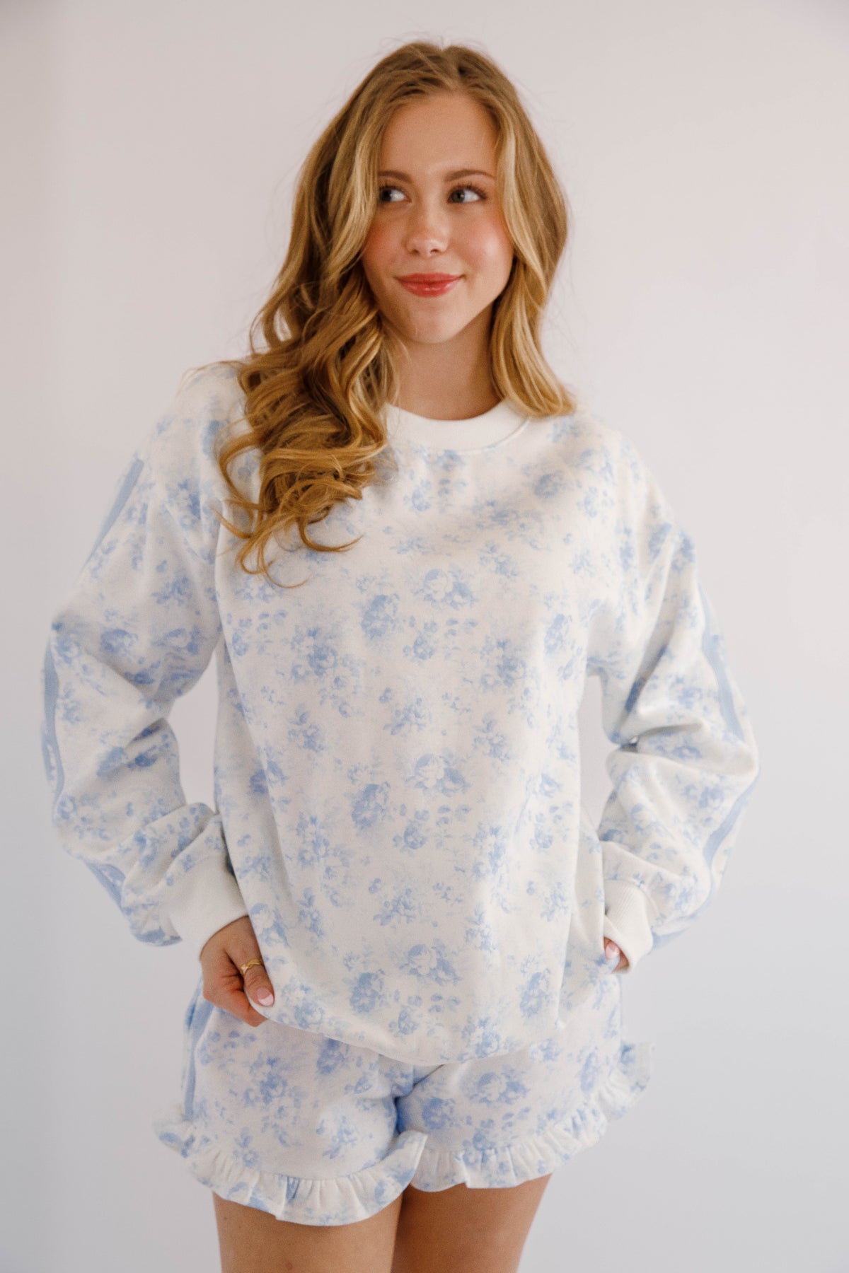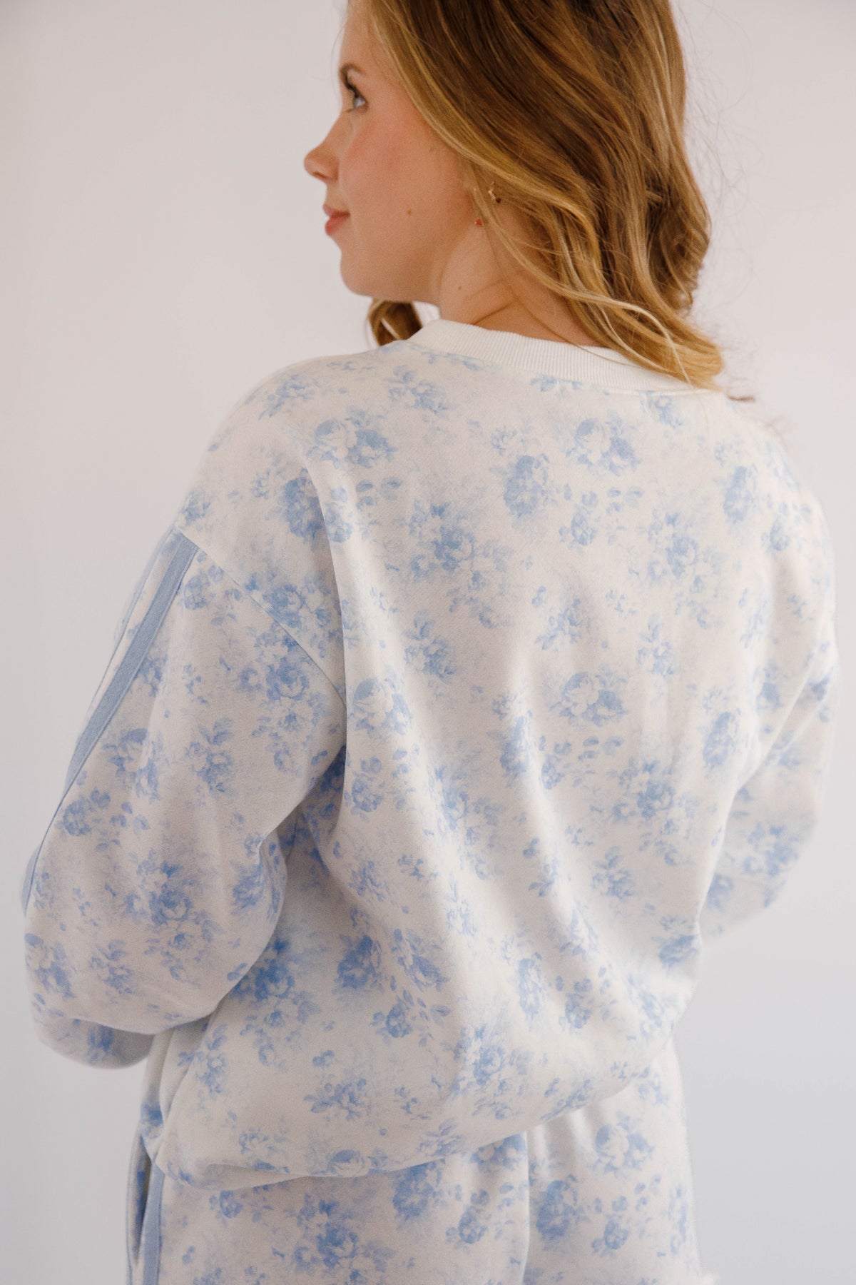 This floral fleece lined pullover is both comfortable and stylish! It features a double tape-line accent along the sleeves, giving the sweatshirt a modern athletic edge that contrasts beautifully with the soft botanical pattern. Finished with a classic crew neckline, ribbed cuffs, and a relaxed silhouette.