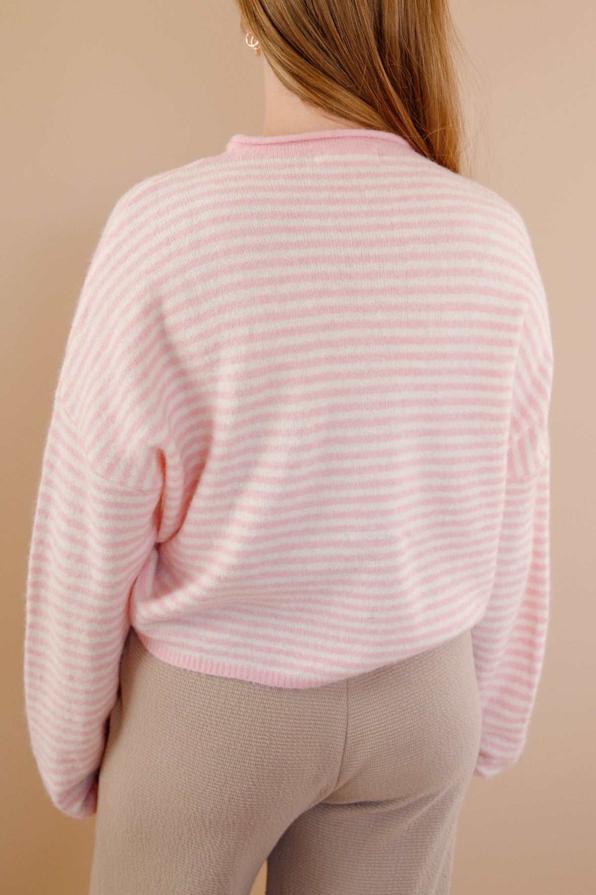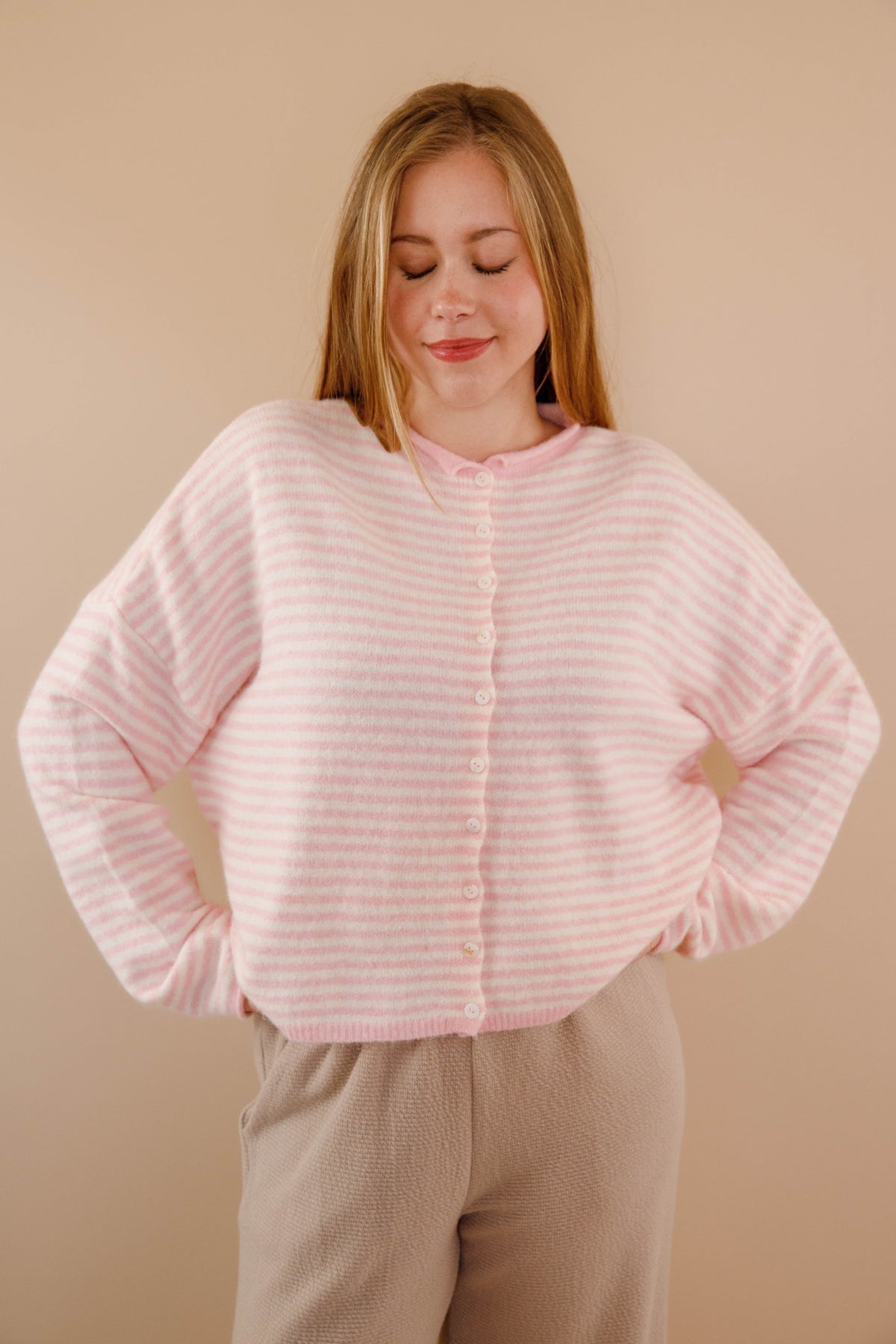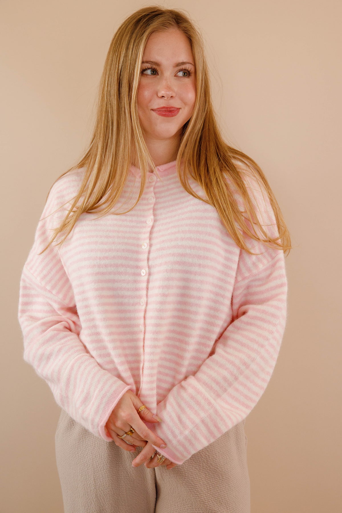 Throw this on with literally everything and watch it become your new closet obsession! Soft as a cloud in crisp white and baby pink stripes, this cardigan delivers that effortless coastal cool-girl vibe we're all chasing. The gorgeous slouch fit pairs perfectly with rolled collar and cuffs, while pearly white buttons add just the right touch of polish. Whether you're dressing up your basics or elevating a casual look, this is the piece that makes every outfit feel intentional and undeniably chic!