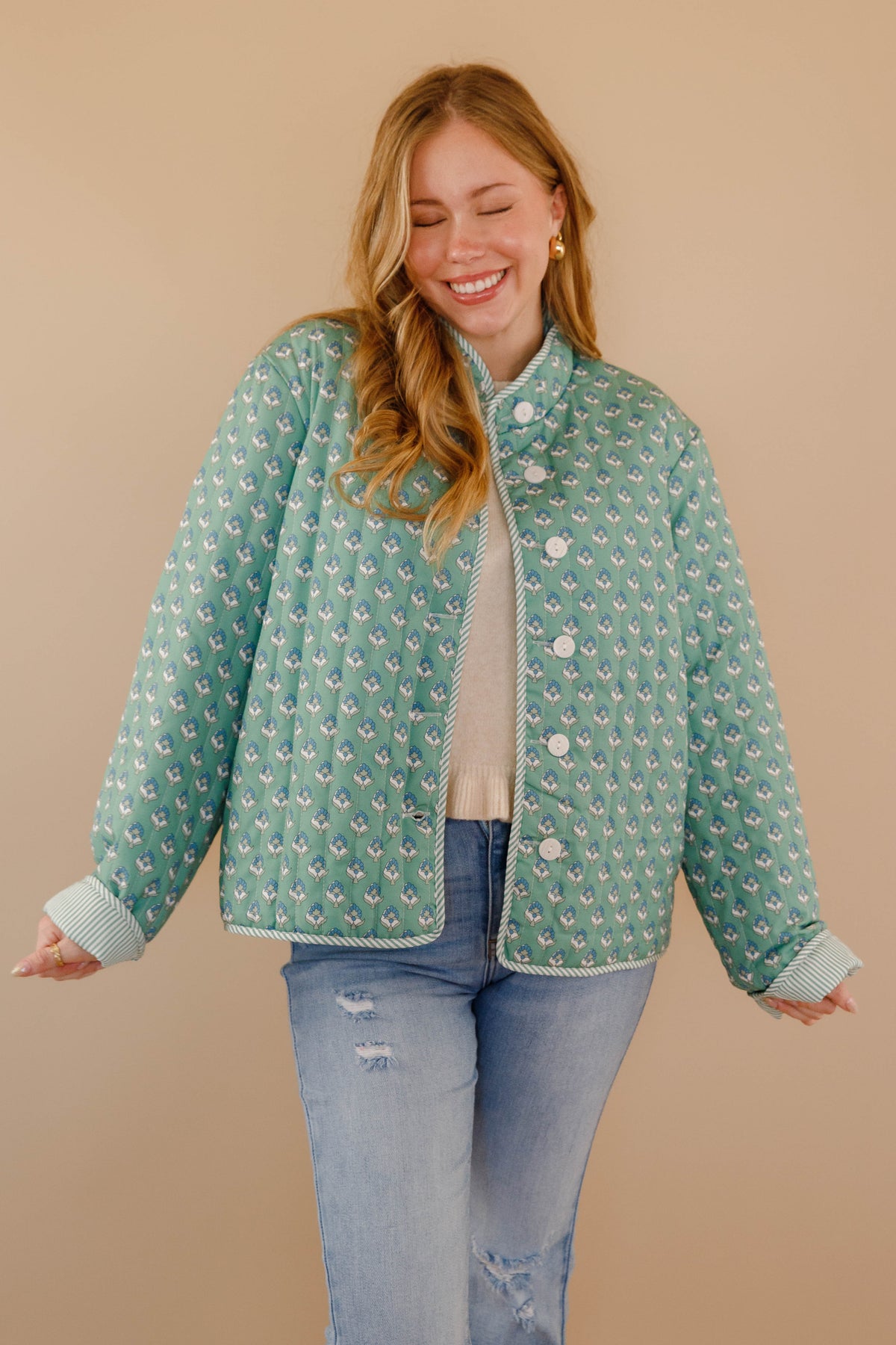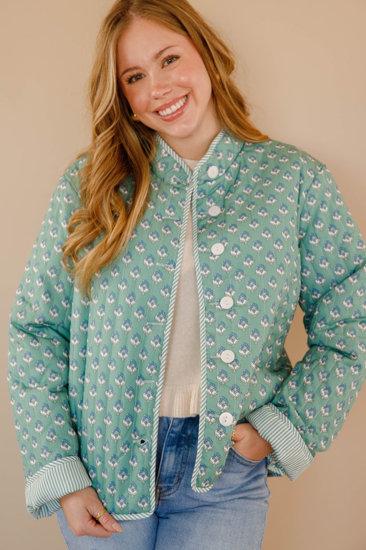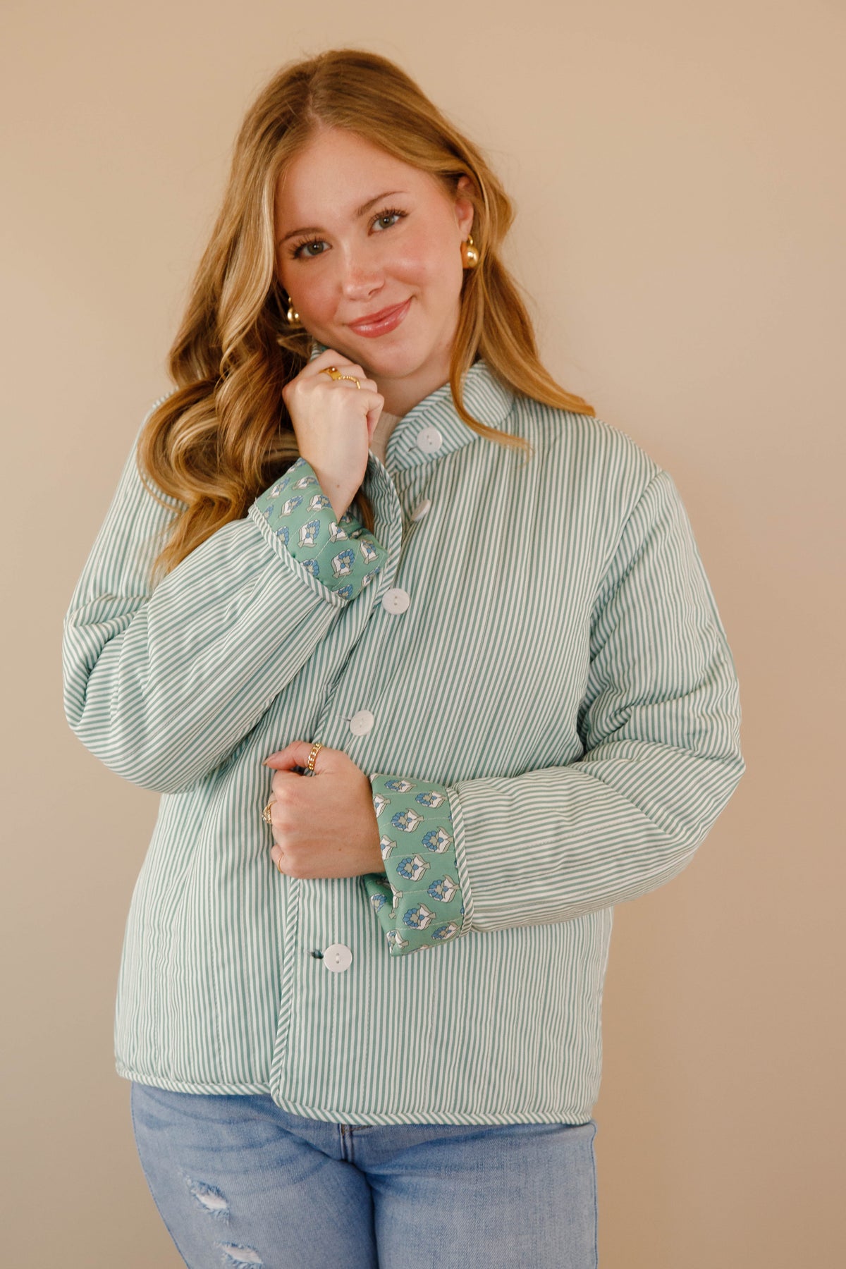 Discover effortless style with our Let Me Explain Reversible Quilted Jacket, where two distinct personalities meet in one refined piece! Flip between a charming green floral design and crisp stripes to match your mood and aesthetic. The generously cut, relaxed silhouette provides comfortable movement while maintaining an elevated look. Quilted throughout for subtle texture and warmth, this jacket is a wardrobe essential for those who appreciate both romantic cottage-core sensibilities and timeless sophistication!