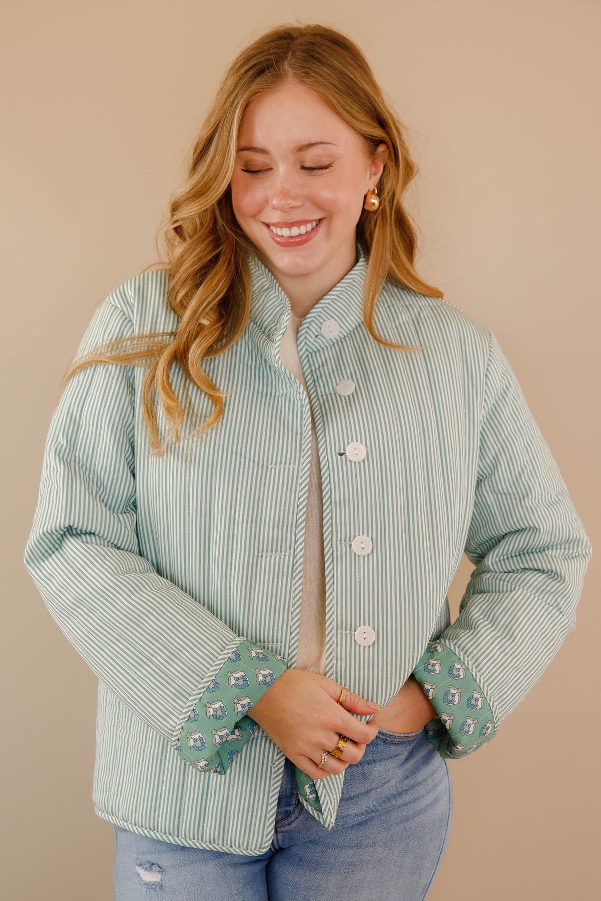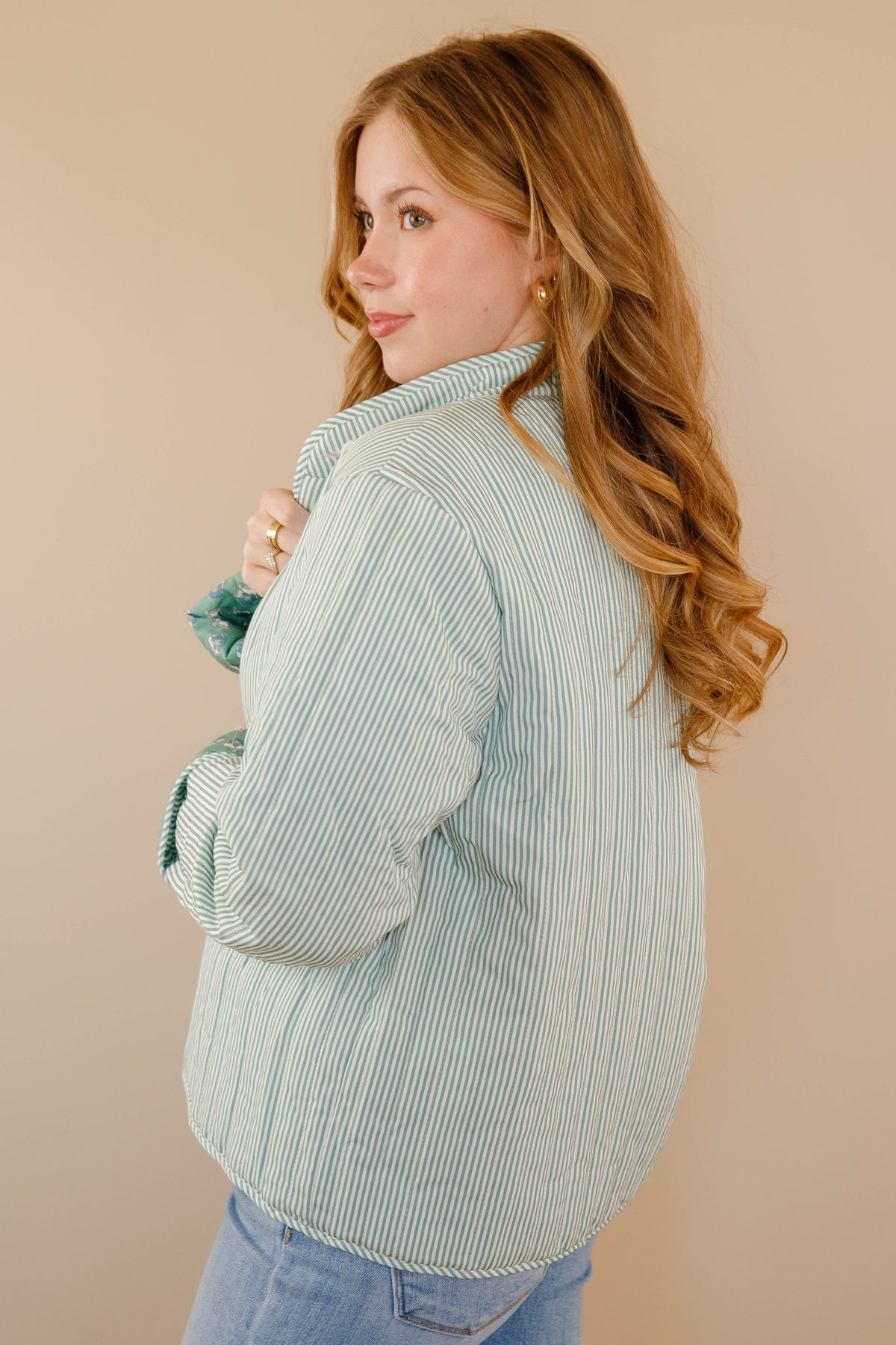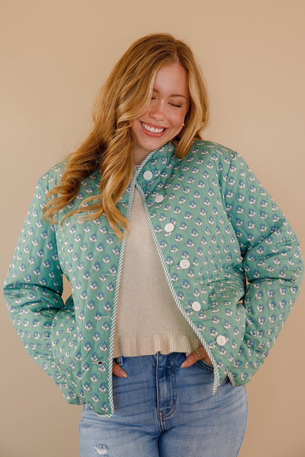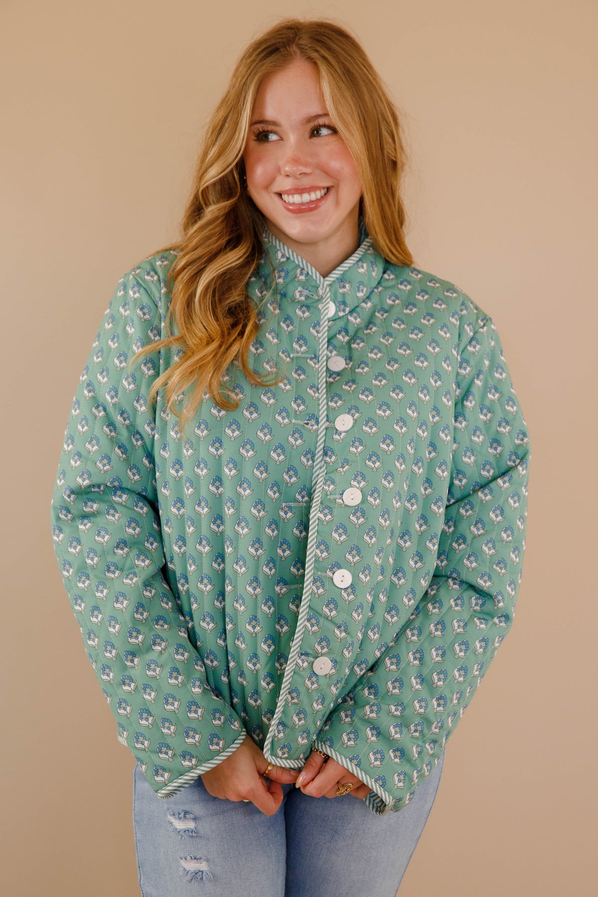 Discover effortless style with our Let Me Explain Reversible Quilted Jacket, where two distinct personalities meet in one refined piece! Flip between a charming green floral design and crisp stripes to match your mood and aesthetic. The generously cut, relaxed silhouette provides comfortable movement while maintaining an elevated look. Quilted throughout for subtle texture and warmth, this jacket is a wardrobe essential for those who appreciate both romantic cottage-core sensibilities and timeless sophistication!