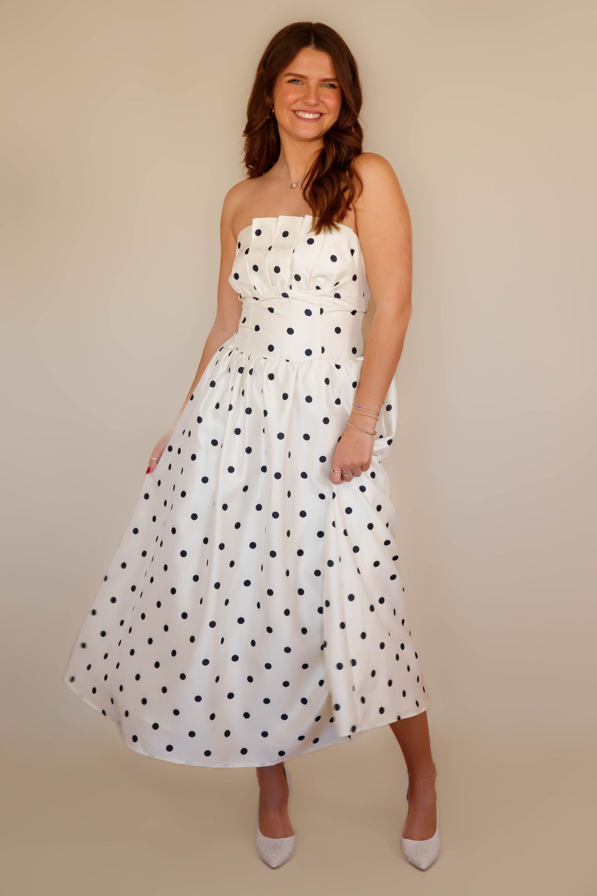 Turn heads in the Out of Reach Midi Dress, where retro charm meets modern sophistication! The classic polka dot pattern pairs beautifully with a strapless silhouette that exudes confidence and elegance. Structural pleating at the bodice creates flattering dimension, while the cinched waist accentuates your curves before the skirt cascades into a romantic full volume. The invisible back zip ensures a seamless, polished look, and the complete lining provides comfort and coverage all day long. Whether you're attending a wedding, brunch, or special event, this versatile midi dress delivers effortless style that keeps you feeling poised and put-together!