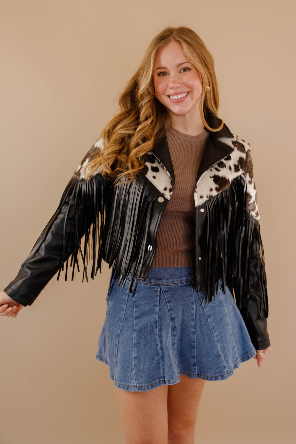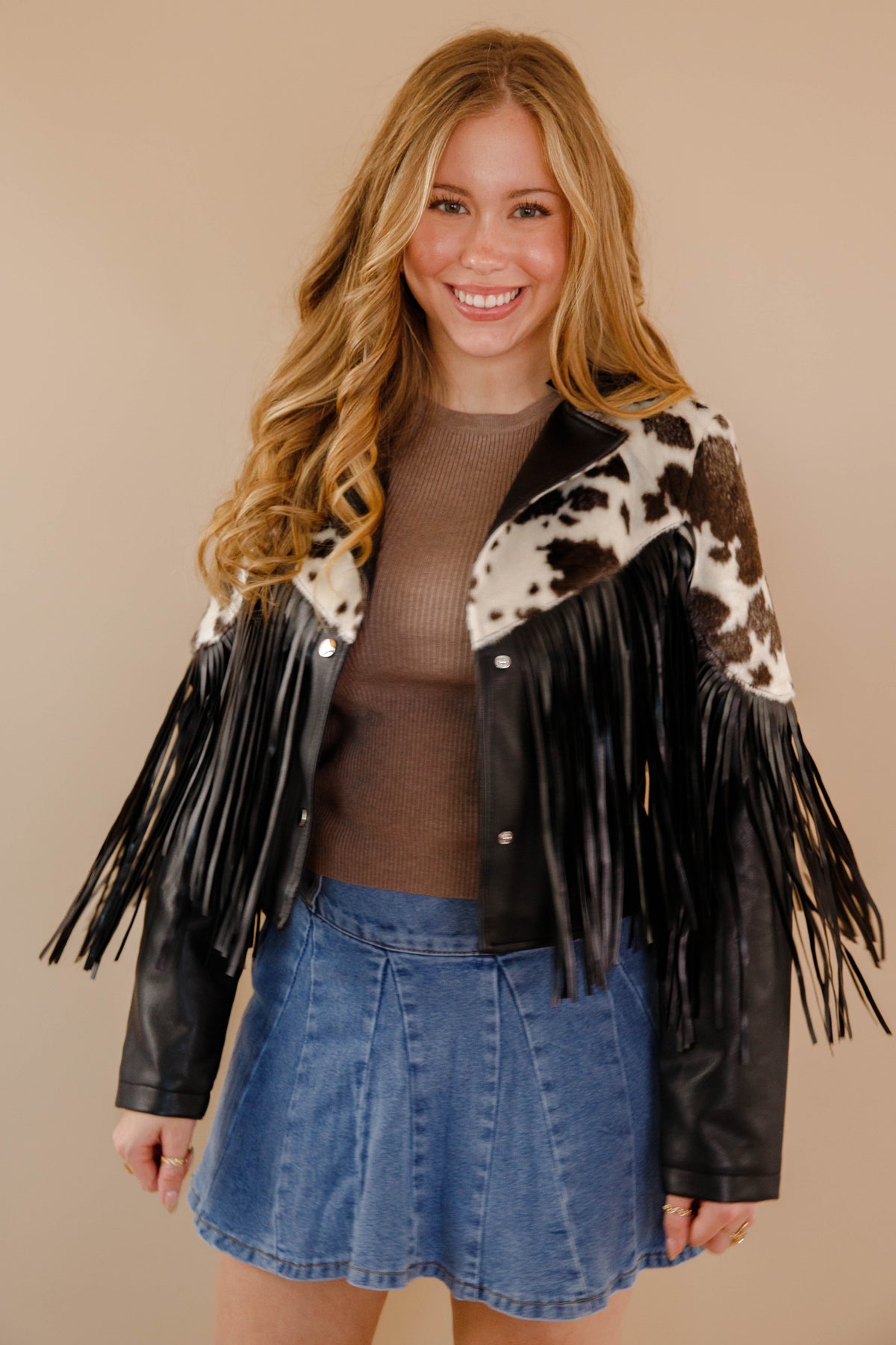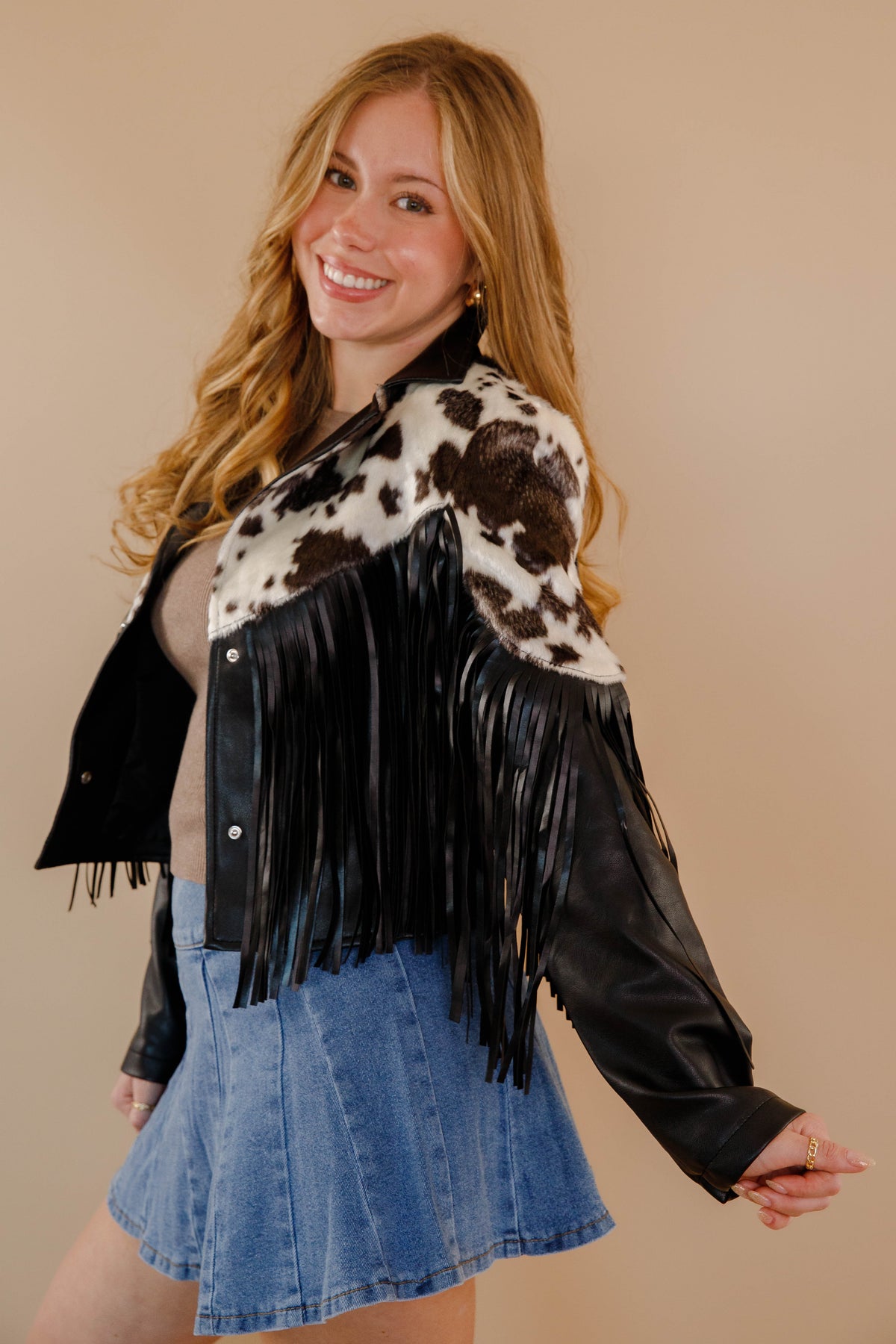 Make a bold statement with this striking faux leather cropped jacket that perfectly captures Western edge. Featuring snap button closure for easy styling, the design showcases dramatic fringe detailing across the front, sleeves, and back for movement and attitude. Rich brown and ivory cowhide panels accent the upper front and back, adding authentic texture and visual interest. The trendy Western aesthetic makes this piece an instant wardrobe essential for anyone craving that effortless cowgirl vibe. Versatile enough to elevate casual outfits or complete your rodeo-ready look!