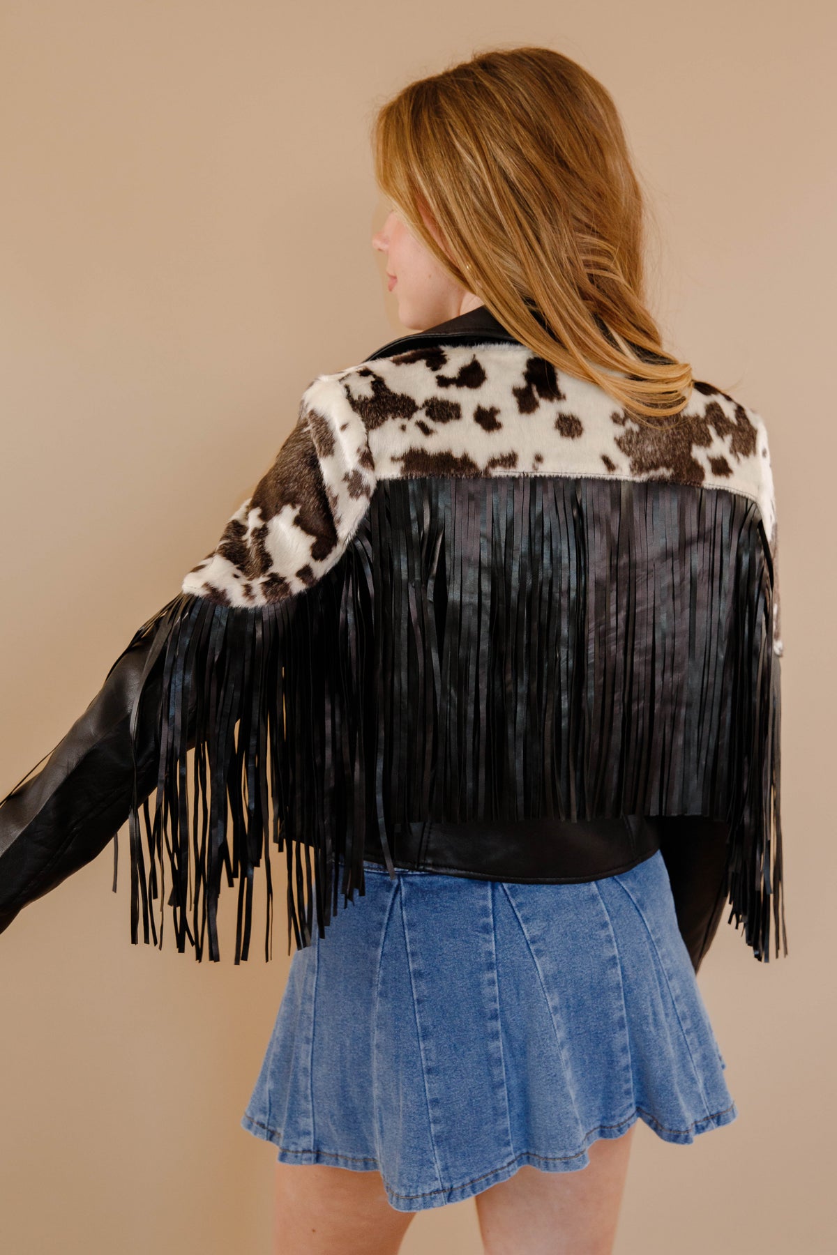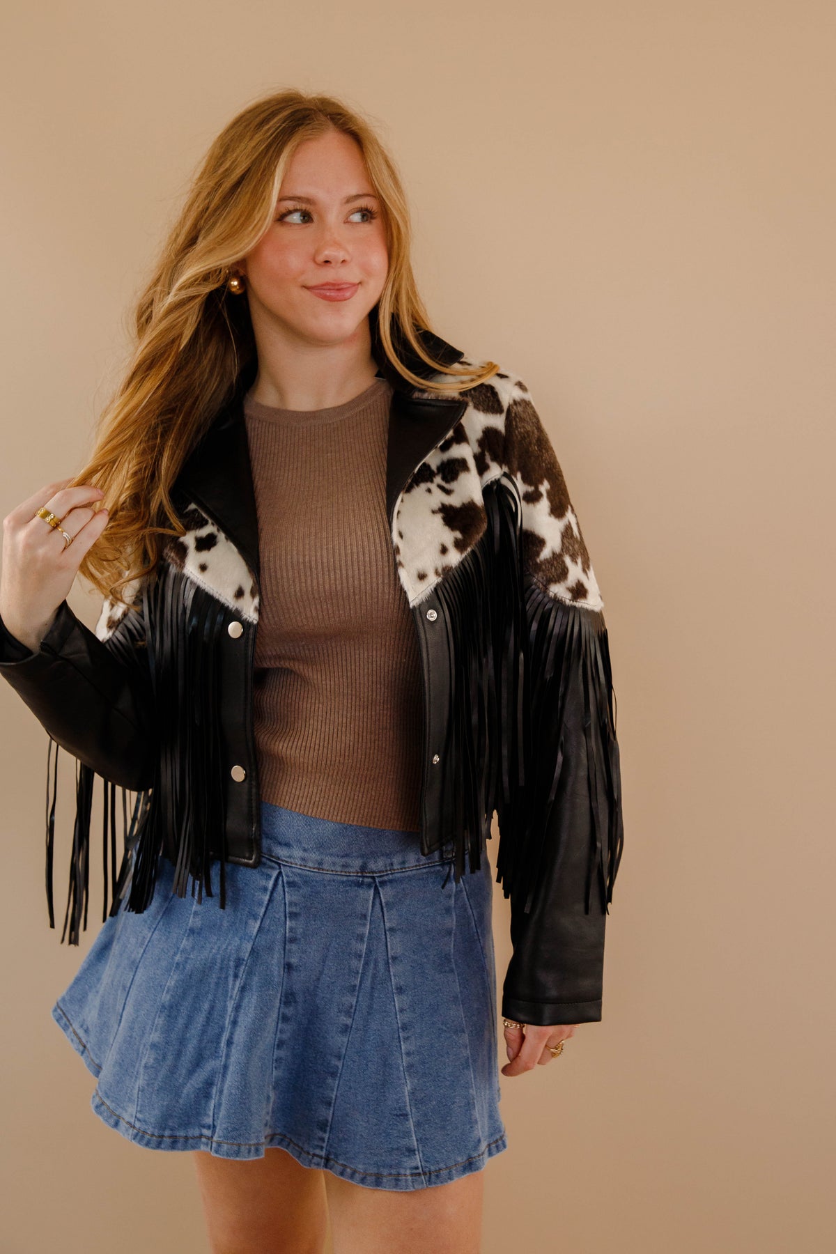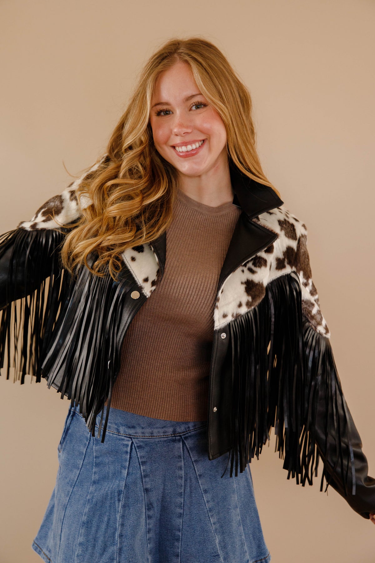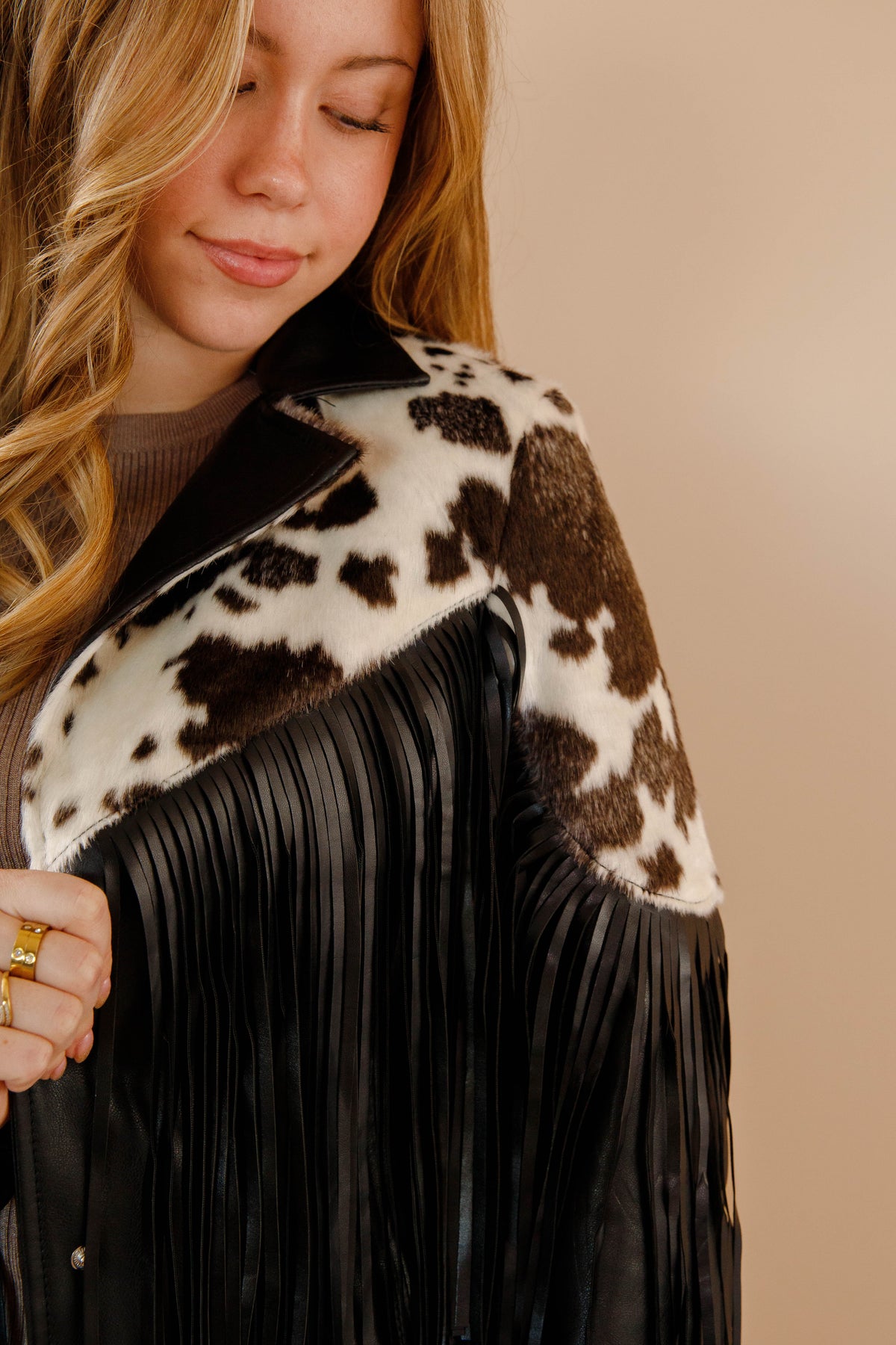 Make a bold statement with this striking faux leather cropped jacket that perfectly captures Western edge. Featuring snap button closure for easy styling, the design showcases dramatic fringe detailing across the front, sleeves, and back for movement and attitude. Rich brown and ivory cowhide panels accent the upper front and back, adding authentic texture and visual interest. The trendy Western aesthetic makes this piece an instant wardrobe essential for anyone craving that effortless cowgirl vibe. Versatile enough to elevate casual outfits or complete your rodeo-ready look!