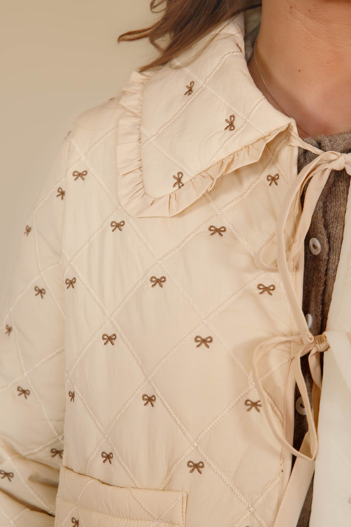 Step into understated luxury with this exquisite quilted jacket that captures the essence of refined femininity! Every detail—from the intricate bow embroidery to the delicate ruffle-trim collar—has been thoughtfully designed to elevate your everyday style. The tie-front closure provides a customizable fit that flatters every figure, while the sumptuous camel and cream color-way pairs beautifully with virtually any ensemble. Whether you're layering for warmth or adding dimension to your look, this jacket delivers the perfect blend of coziness and sophistication!