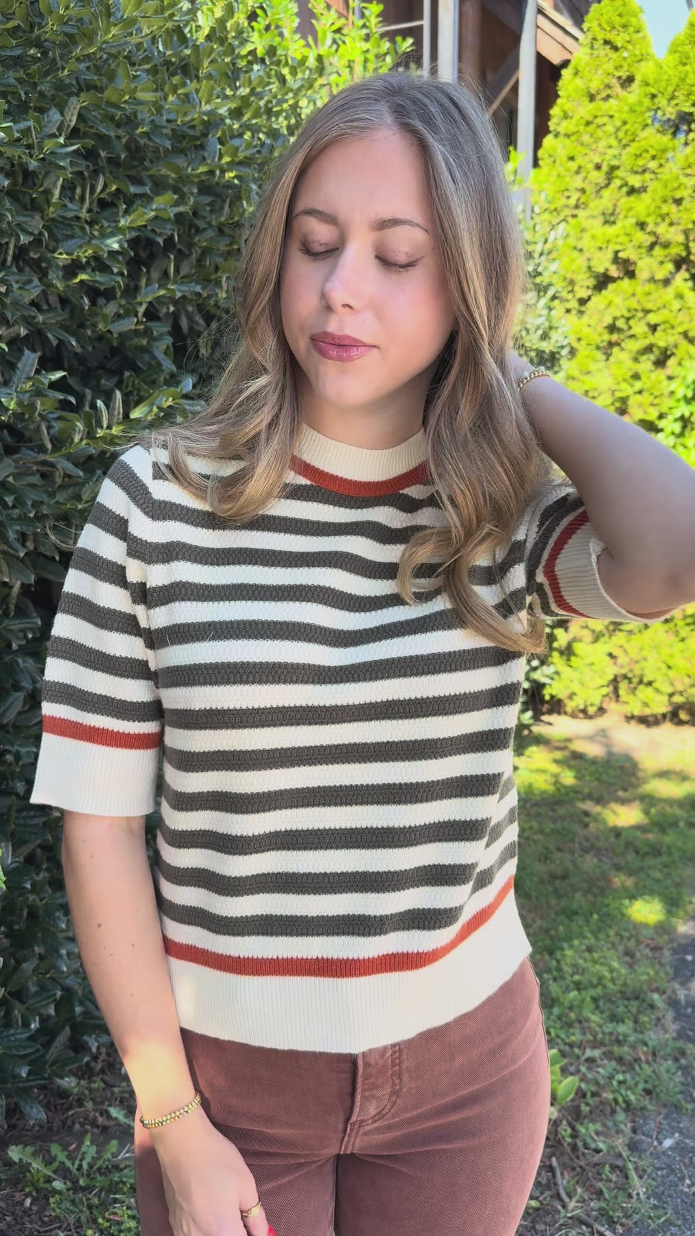 Experience cozy elegance with The Leaves Start to Fall Sweater, a short sleeve knitted top designed for comfort and style. Its ultra-soft fabric gently embraces your skin, while the classic striped pattern and round neck add timeless charm. Perfect for layering or wearing alone, this sweater effortlessly elevates your everyday wardrobe with a touch of warmth and sophistication.