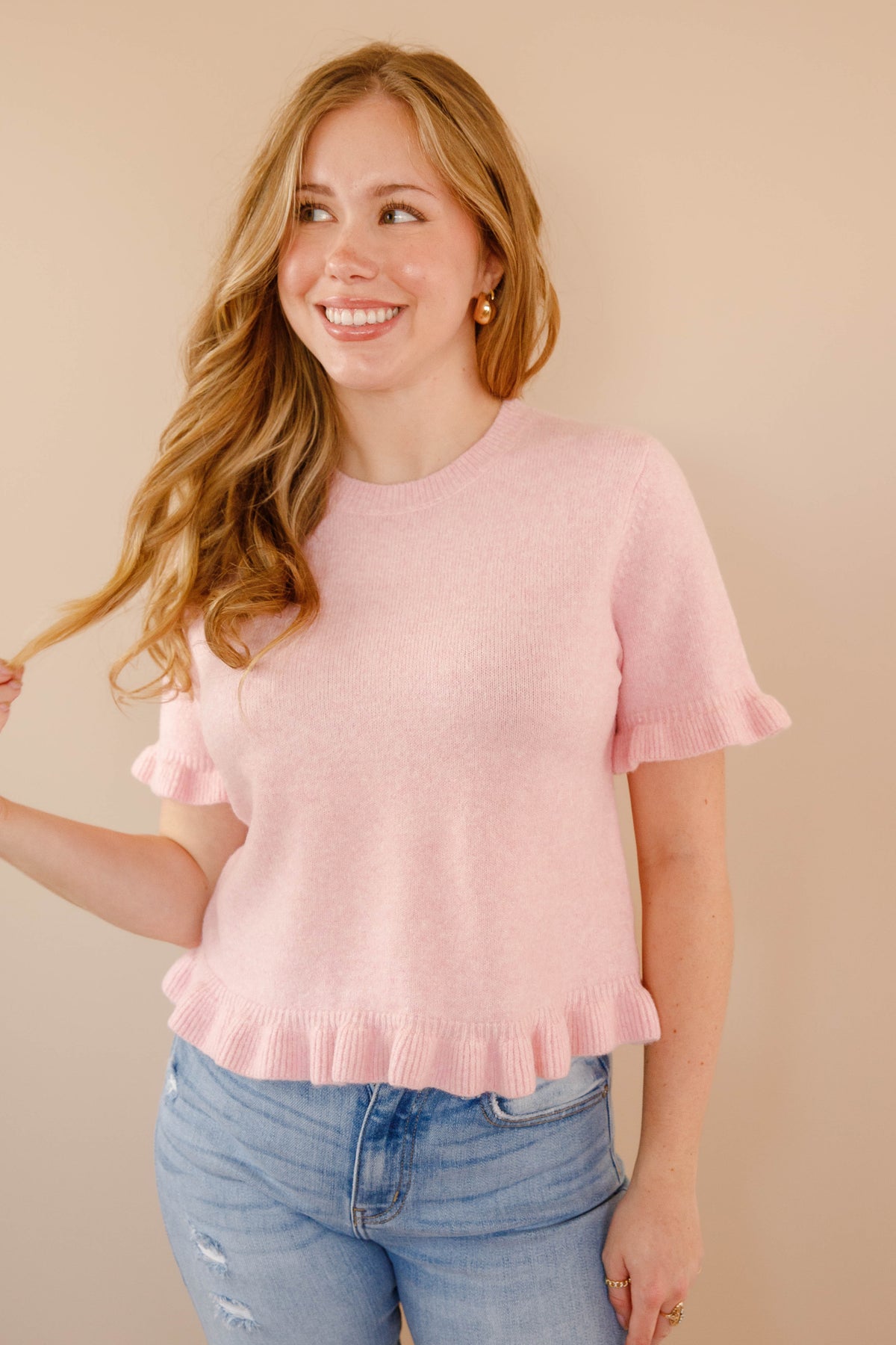 Effortlessly chic and undeniably versatile, this lightweight knit sweater brings understated elegance to your spring wardrobe. The relaxed fit skims the waist while delicate ruffle detailing at the hem and sleeves adds a refined feminine touch. A ribbed crew neckline provides a polished foundation for layering under blazers or styling solo with your favorite denim. Crafted from a soft, gentle fabric that feels as good as it looks, this pullover essential transitions seamlessly from casual days to more composed occasions.