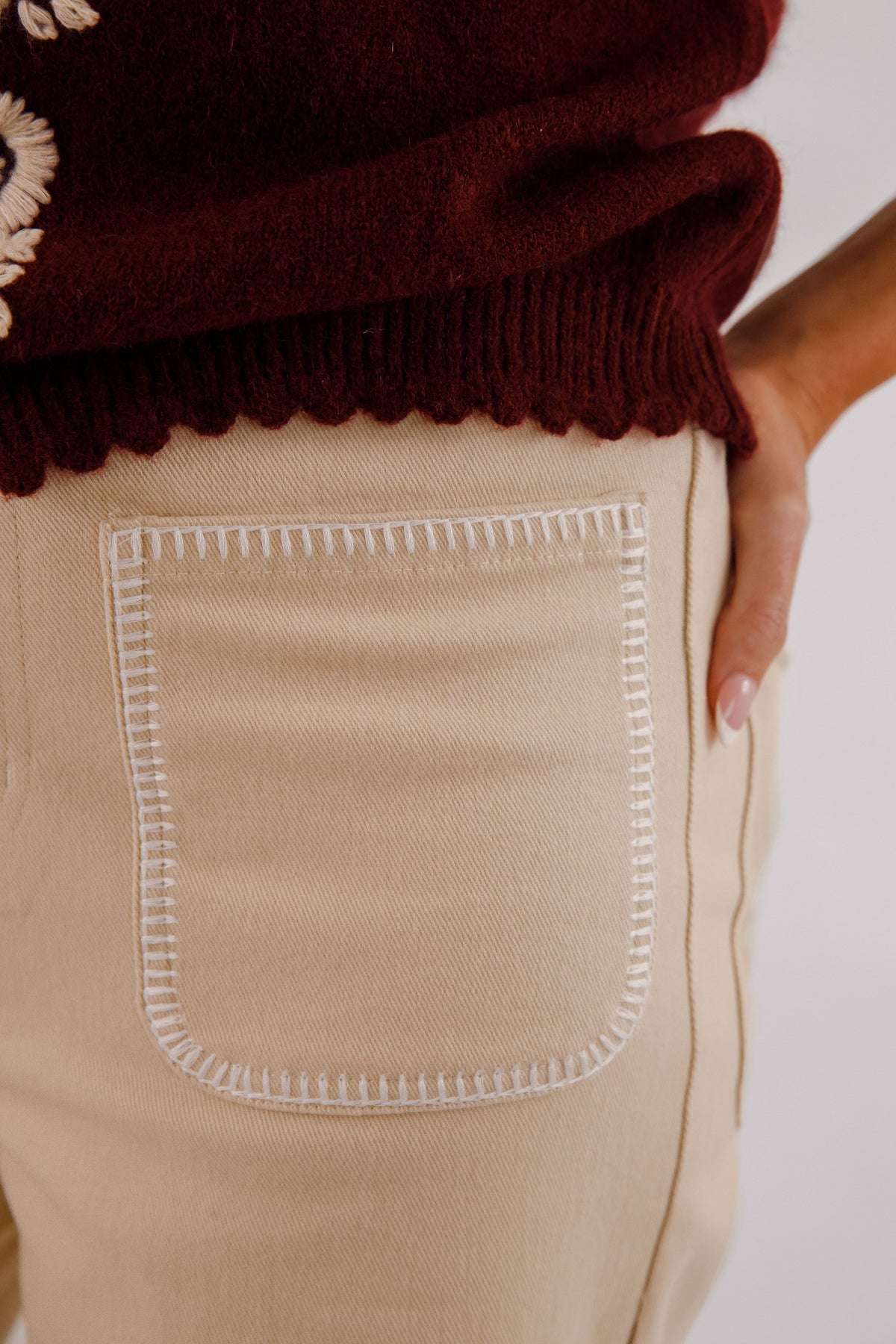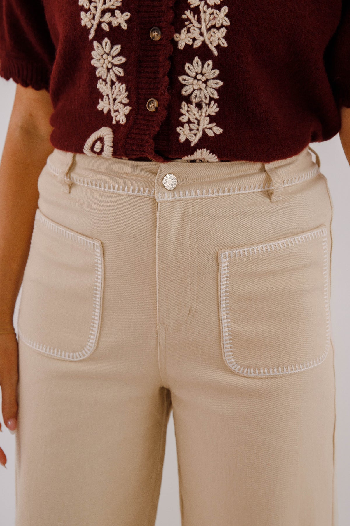 Elevate your everyday style with the Say What You Will Wide Leg Denim in a versatile ecru shade. Designed with a high-rise waist and belt loops, these jeans offer a flattering fit that enhances your natural silhouette. Functional front and back patch pockets add practicality, while the classic button and zipper closure ensures easy wear. Finished with distinctive white whipstitch trim, they bring subtle detail that sets you apart. Perfectly tailored to give you steady confidence, these jeans fit effortlessly into any moment.