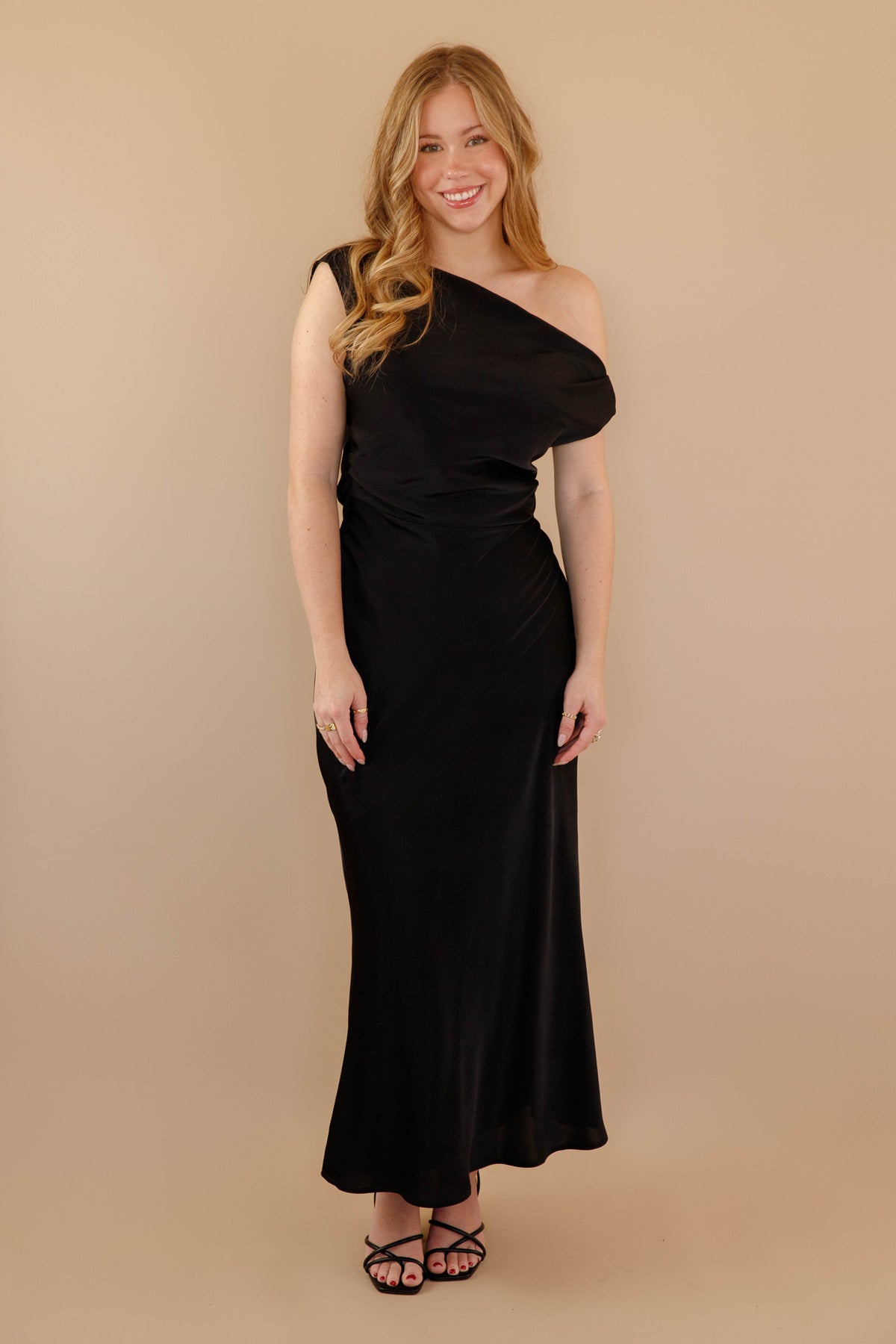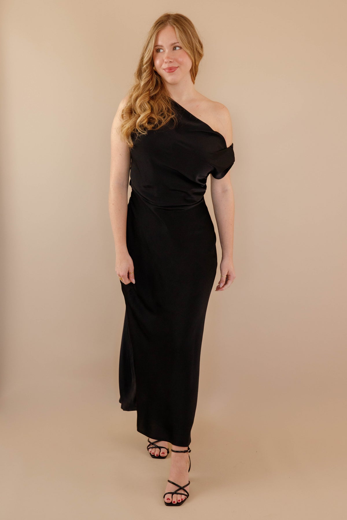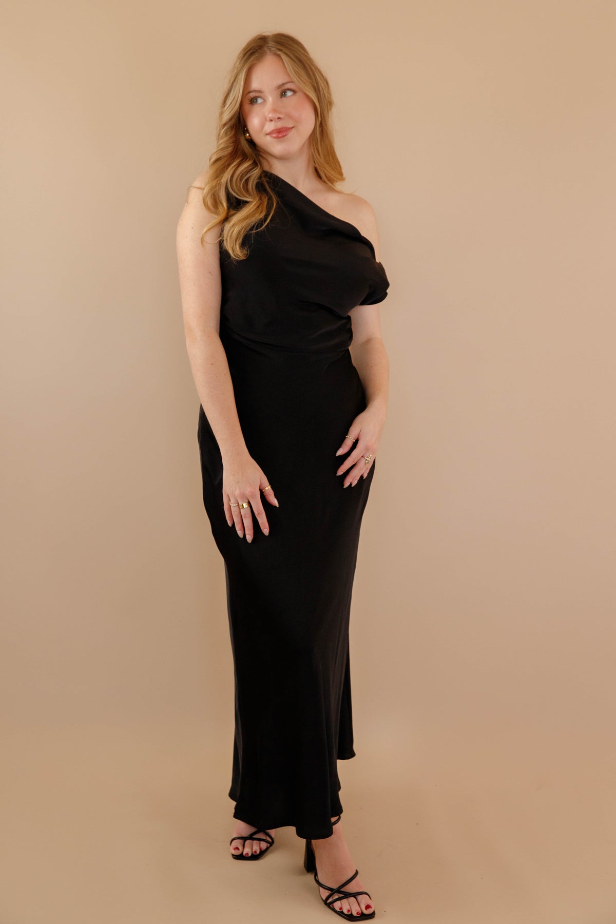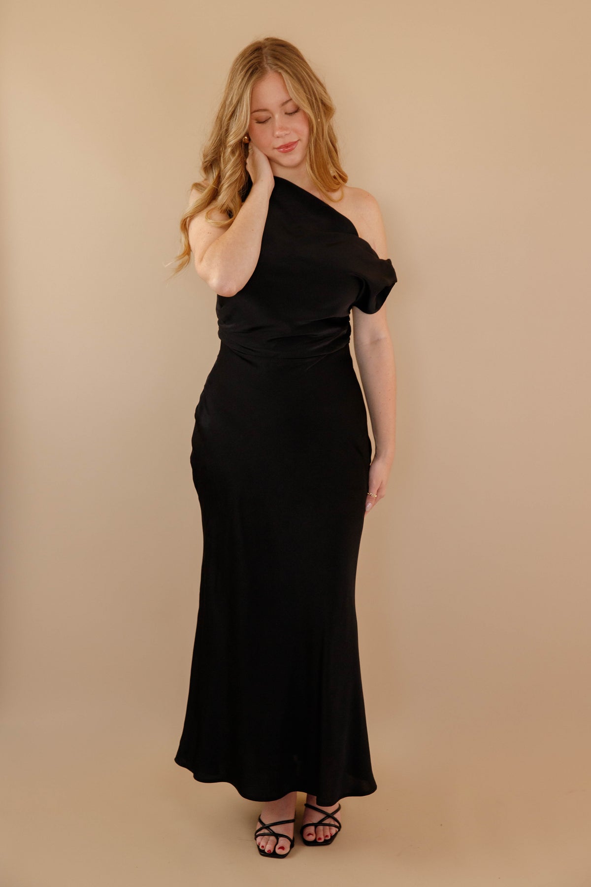Make an unforgettable impression in this refined satin maxi dress, where modern design meets romantic allure. The graceful one-shoulder neckline flows into an elegantly draped silhouette, while subtle shirring at the waist defines your figure with understated sophistication. A discreet side zipper provides effortless wear. Crafted in luxurious satin, this versatile piece transitions seamlessly from wedding celebrations to intimate dinners and upscale cocktail events. Its timeless appeal ensures you'll reach for it season after season, always feeling poised and captivating.