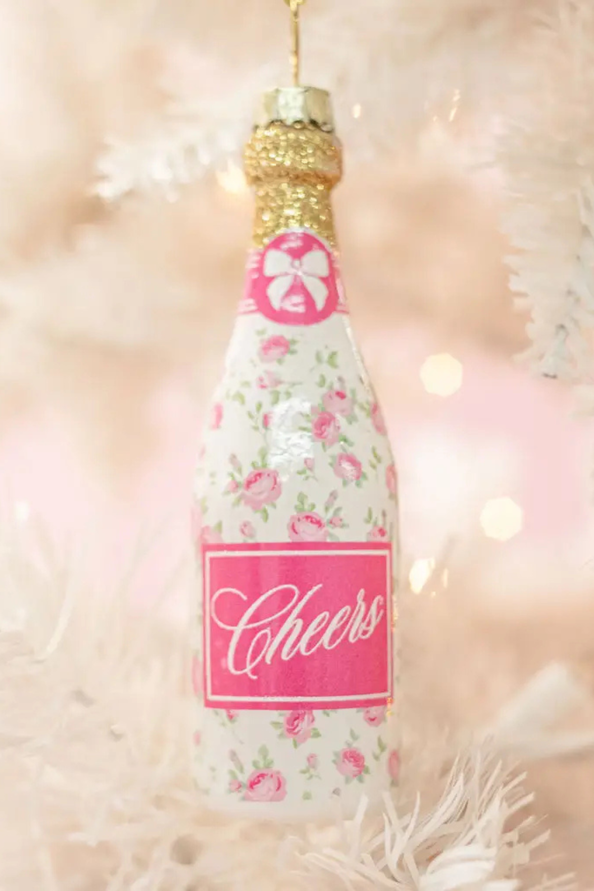Cheers to the cutest ornament on the tree! Our Champagne Christmas Ornament features a champagne bottle wrapped in dainty pink roses, topped with gold glitter "bubbly" and finished with a bright pink "Cheers" label. It’s the perfect pop of sparkle for celebrating the season in style. Ideal for gifting your girls, toasting new beginnings, or decking out a pinkmas tree with a little bubbly flair!