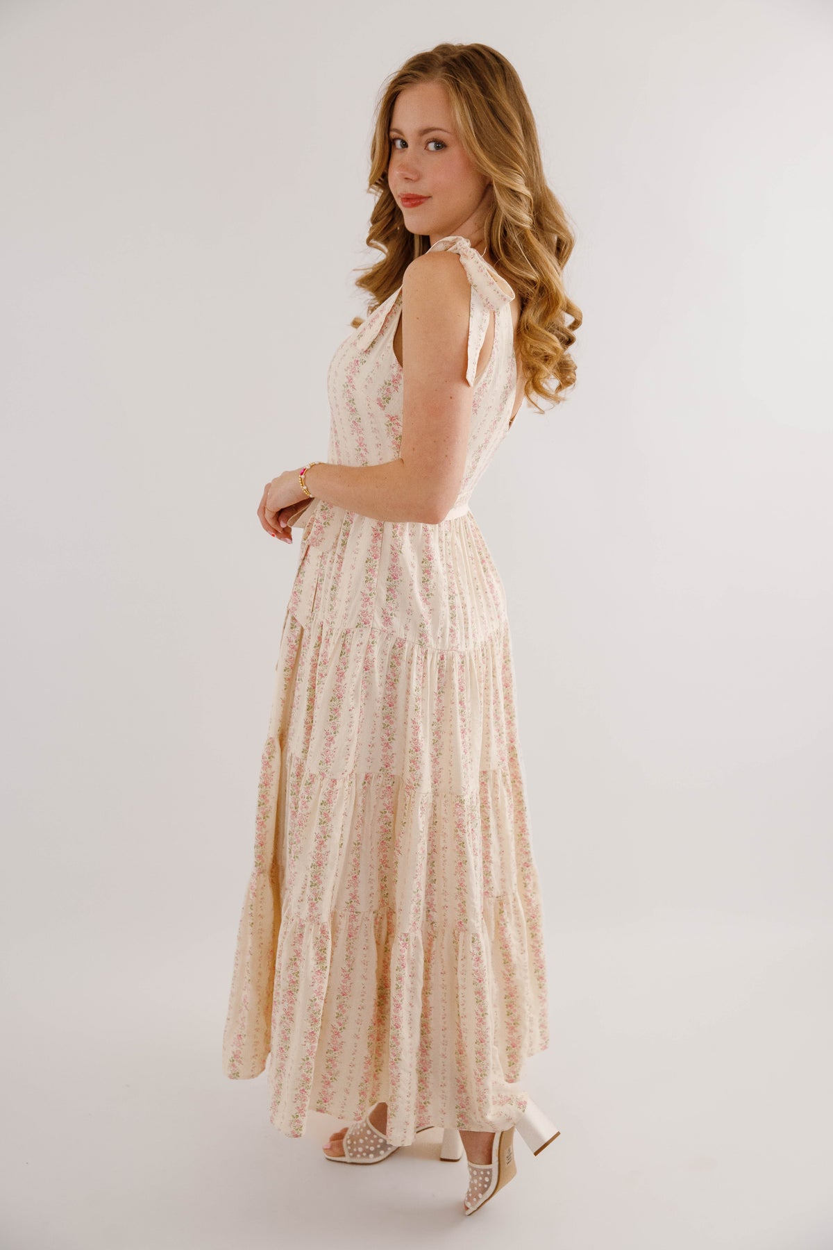 Embrace effortless spring style with this charming pink striped floral maxi dress. Featuring a romantic tiered skirt and adjustable tie straps, it offers a flattering silhouette enhanced by a cinched waist tie. The hidden side zipper ensures a seamless look, while the structured fabric provides a polished finish. Perfect for garden parties, weddings, or casual outings.