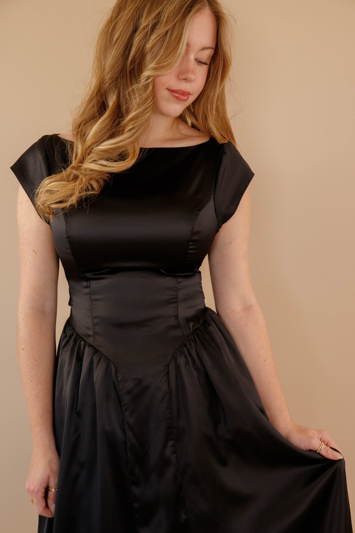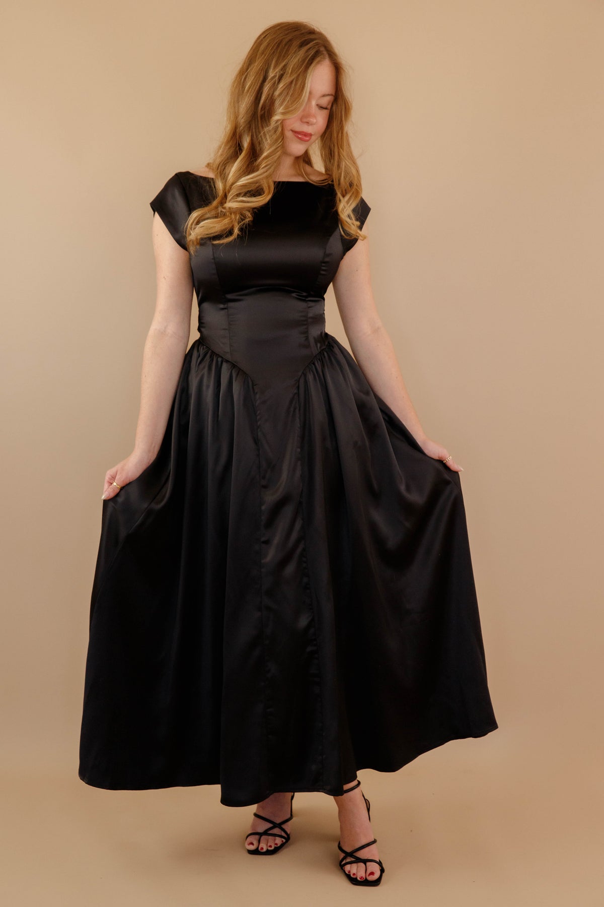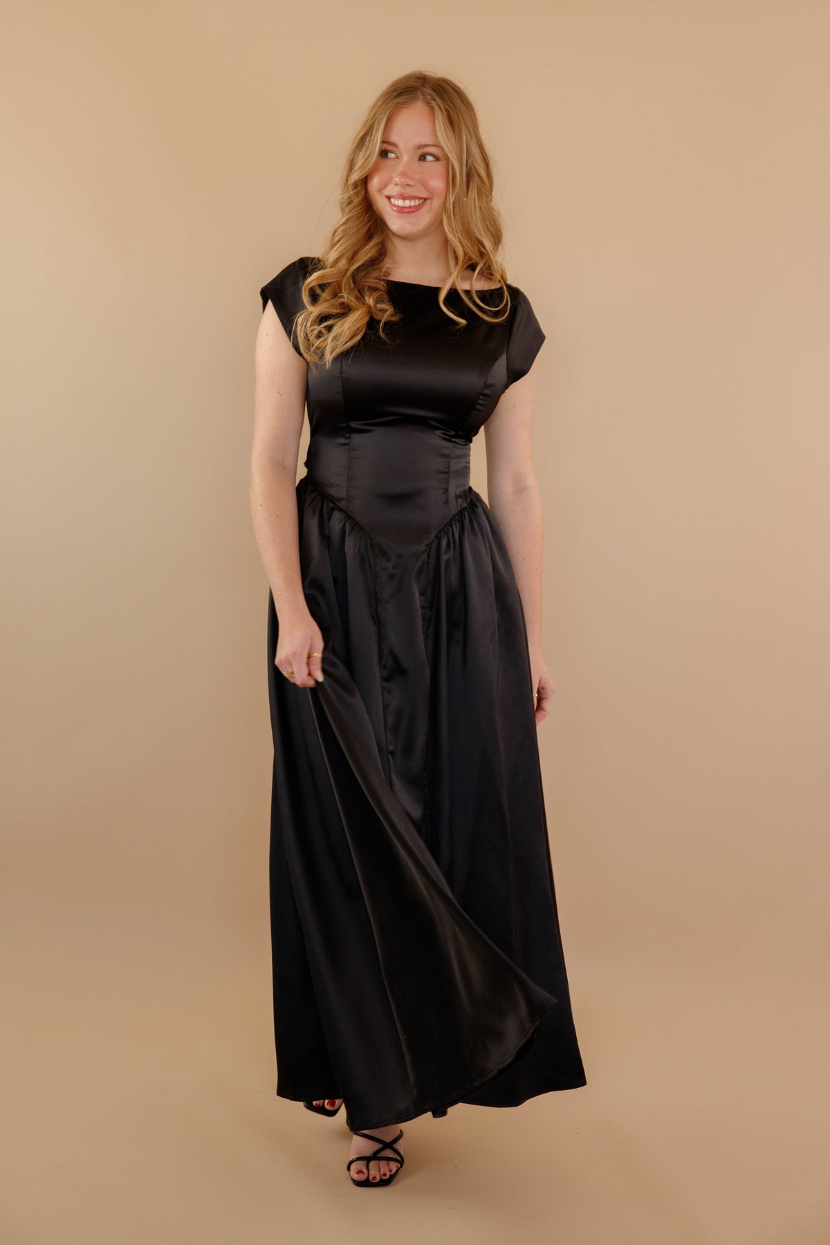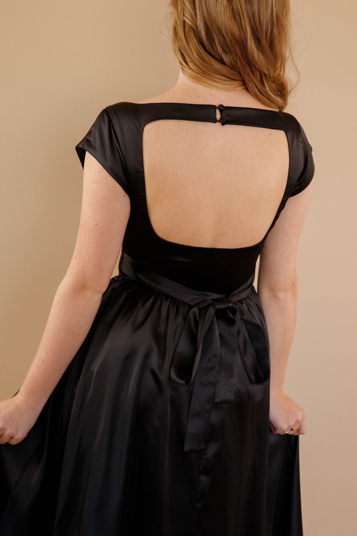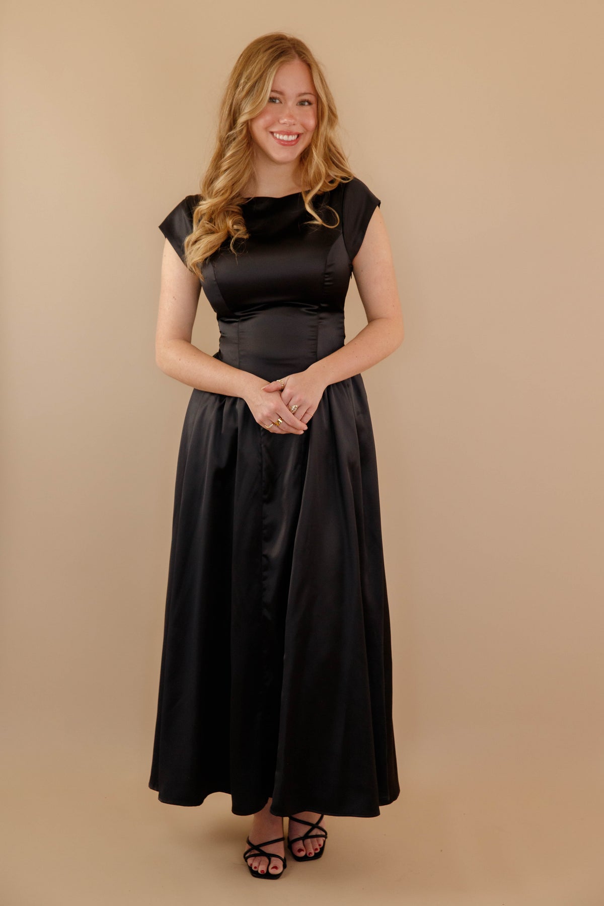 Experience understated luxury in this exquisite satin maxi dress, where refined details create an unforgettable impression. The graceful boat neckline and cap sleeves offer classic elegance, while the striking open square back—finished with an artful self-bow tie—adds contemporary allure. Gentle gathering through the bodice flatters your figure, and the invisible back zipper provides a seamless silhouette. Ideal for galas, cocktail events, or upscale occasions, this dress embodies timeless sophistication with a modern edge.