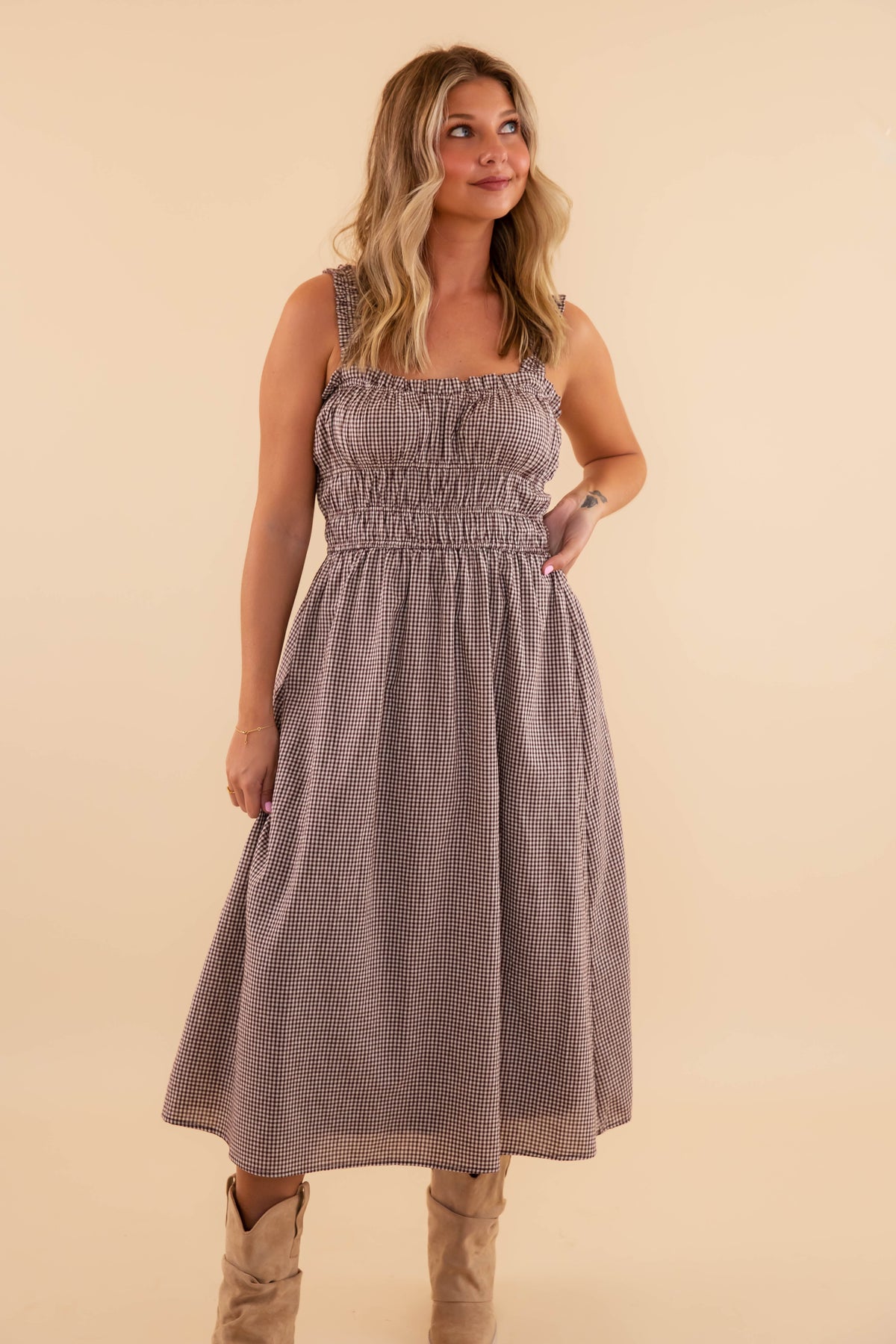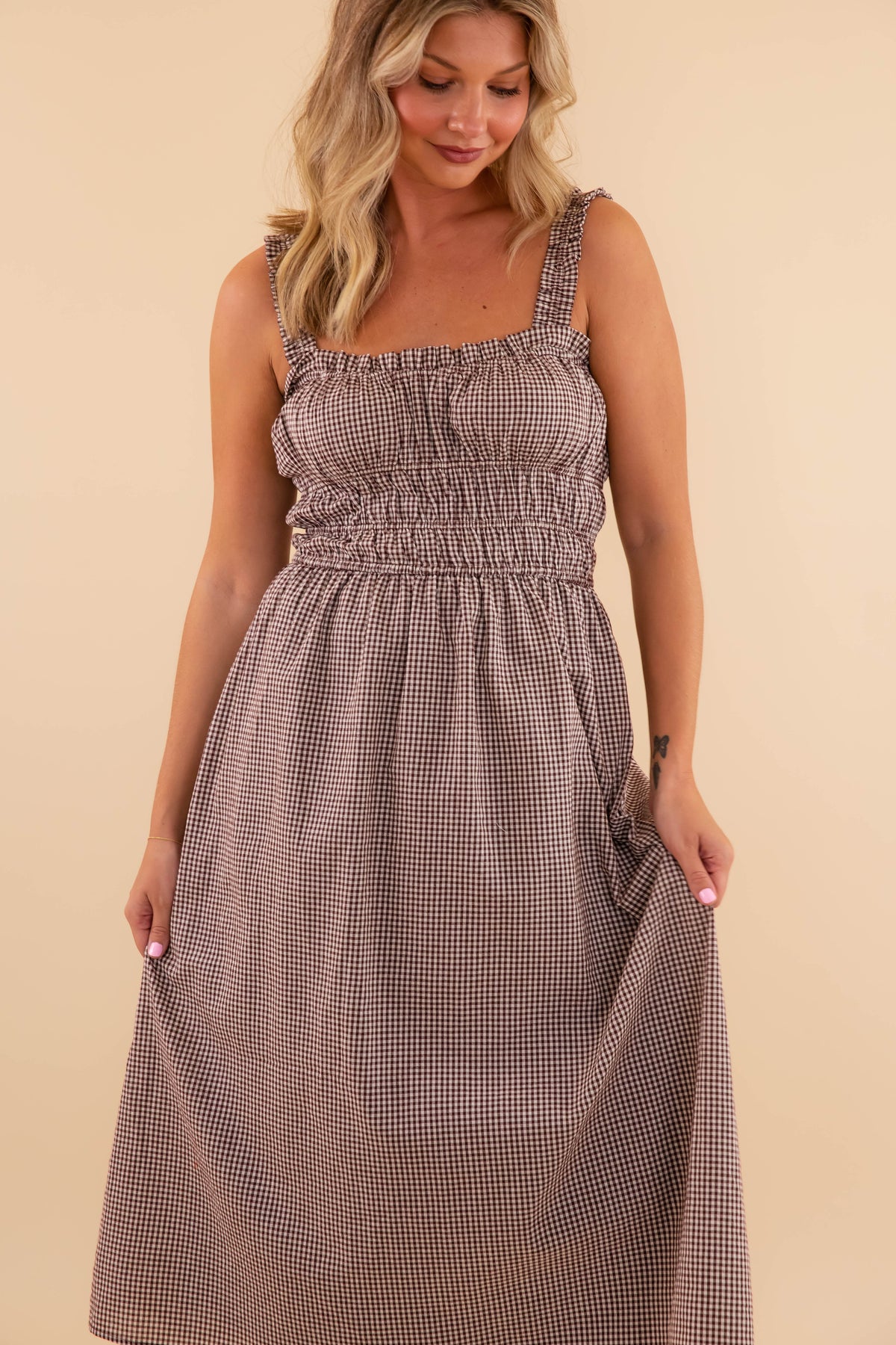 Slip into effortless elegance with the Rest Assured Dress, where comfort meets style. This charming gingham midi features delicate ruffled shoulder straps that add a touch of whimsy, while the elastic waist ensures a flattering fit all day long. Perfect for casual outings, garden parties, or lazy weekends, this dress lets you look put-together without the fuss. Twirl, relax, and feel fabulous.