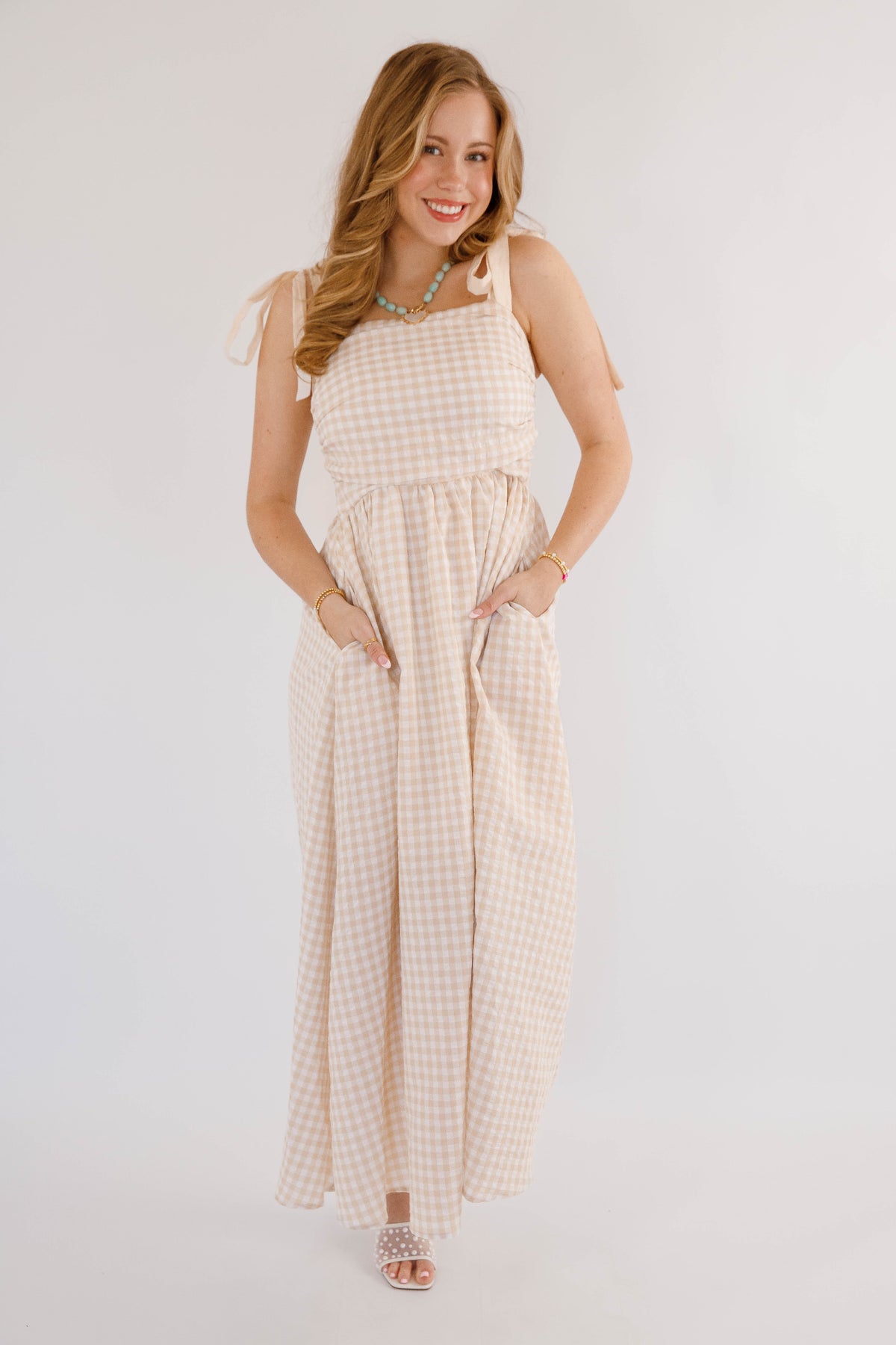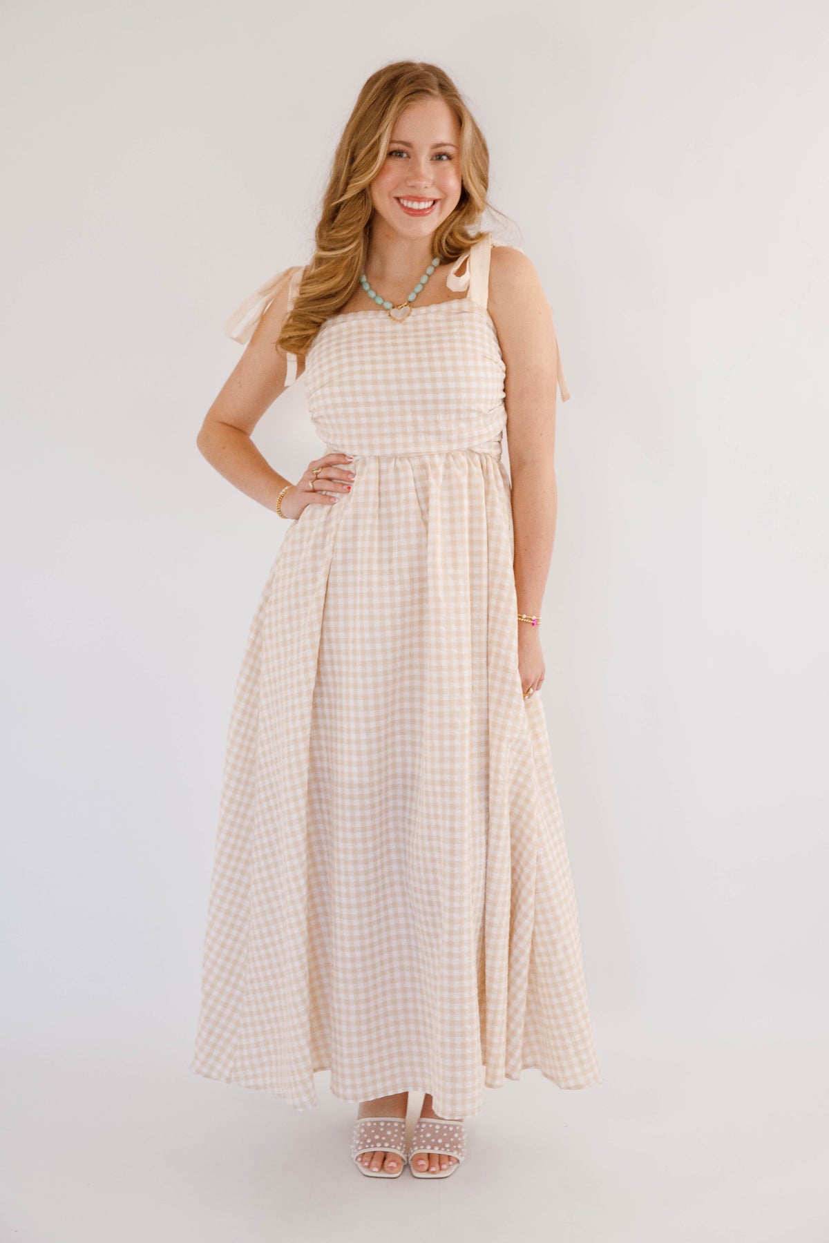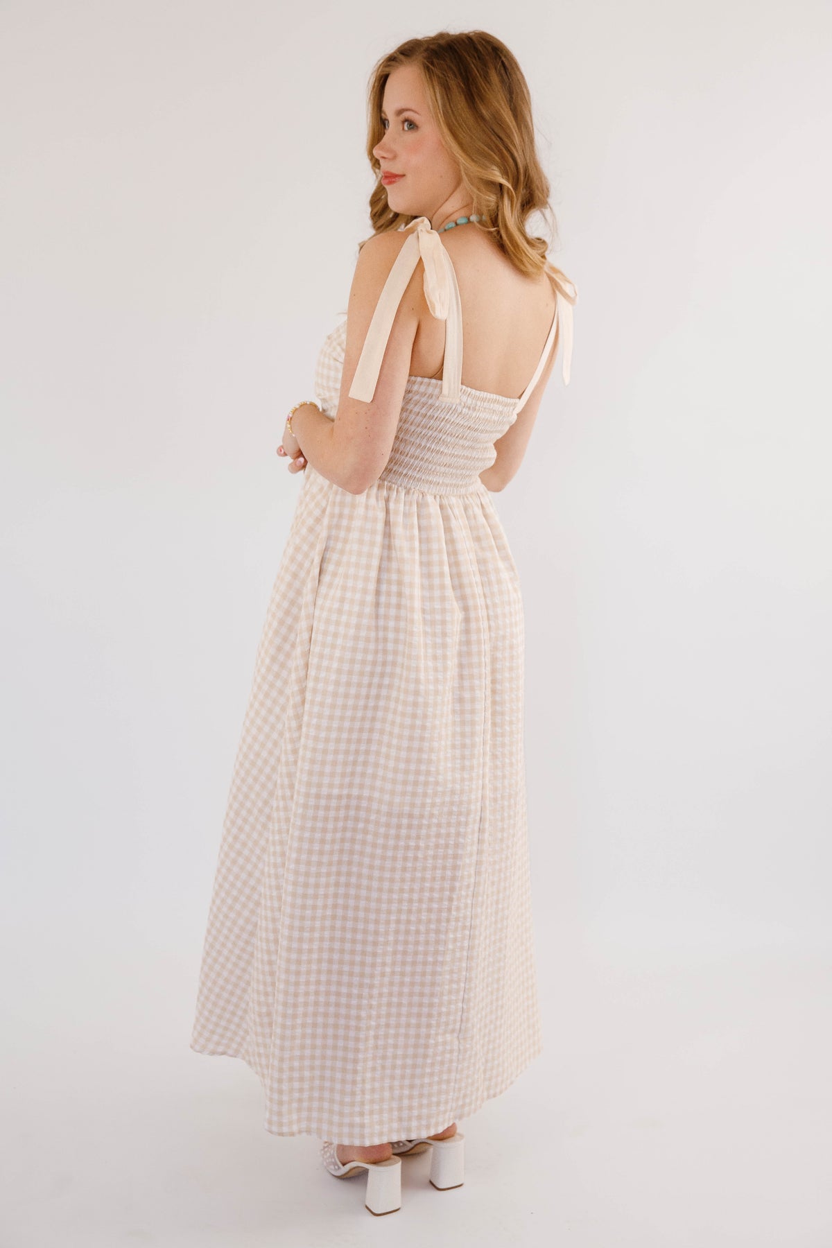 Beige Gingham Maxi Dress- Neutral Vacation Beach Dress- Cloud Ten Tan Gingham Dress