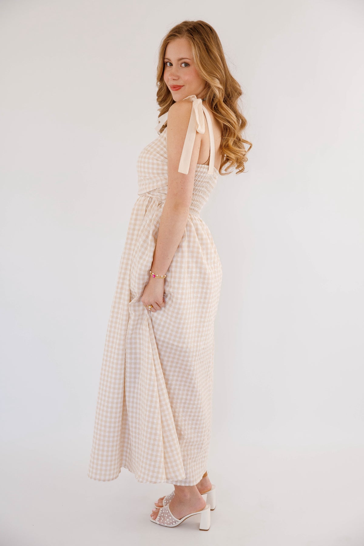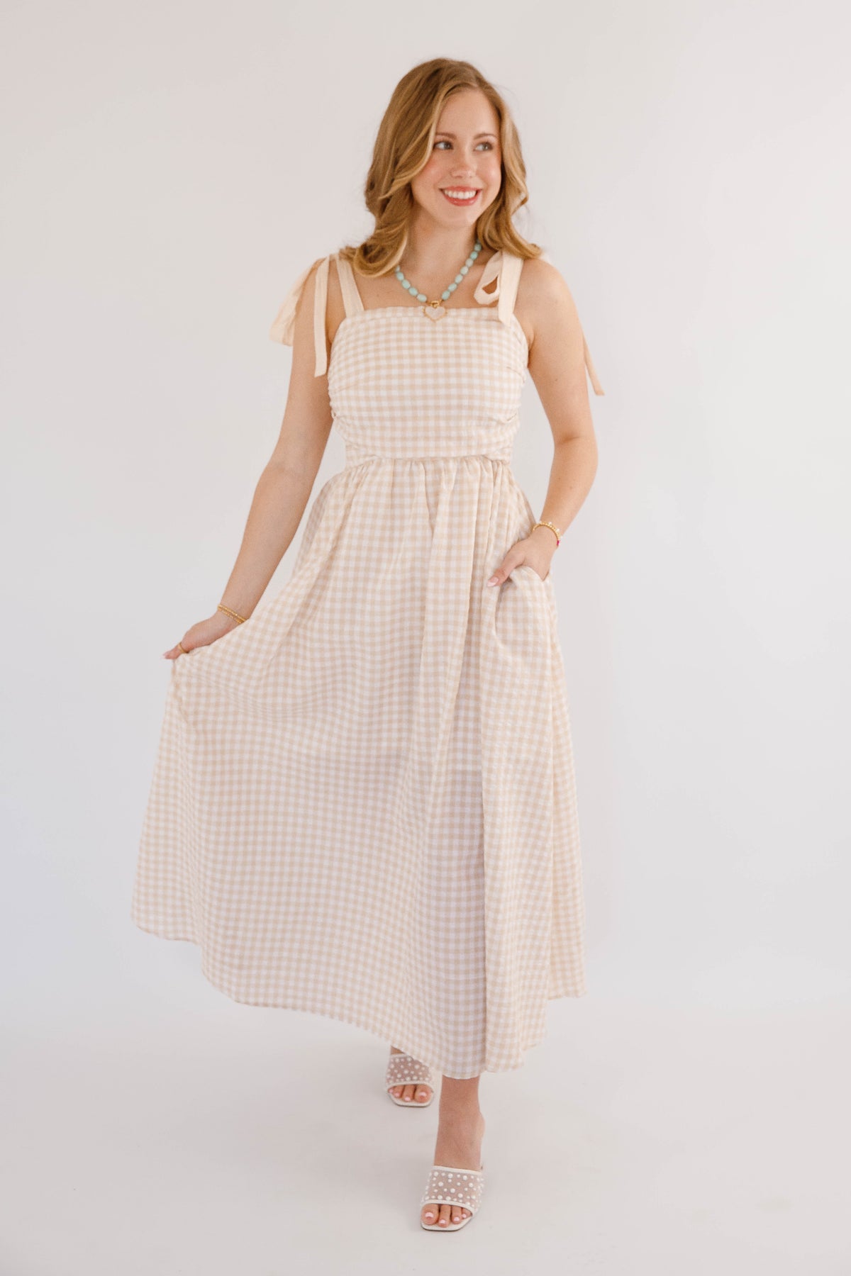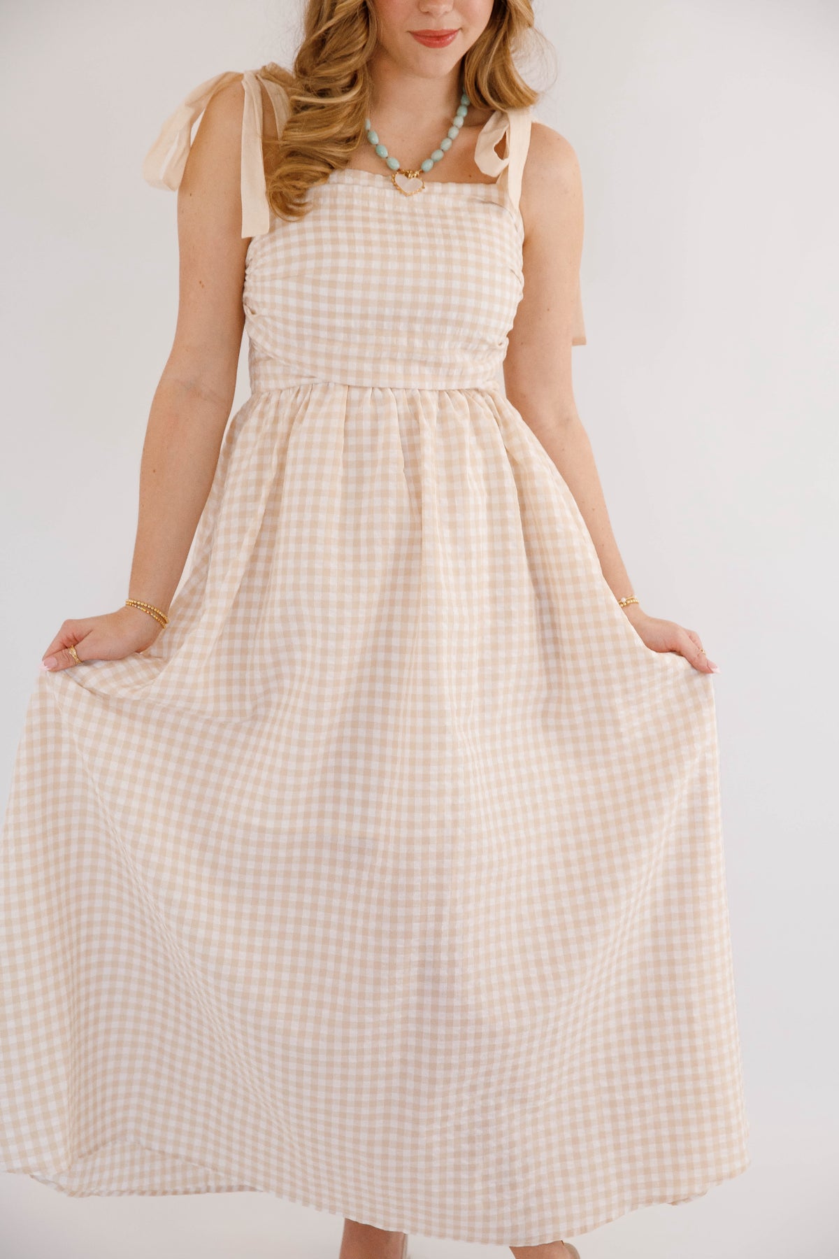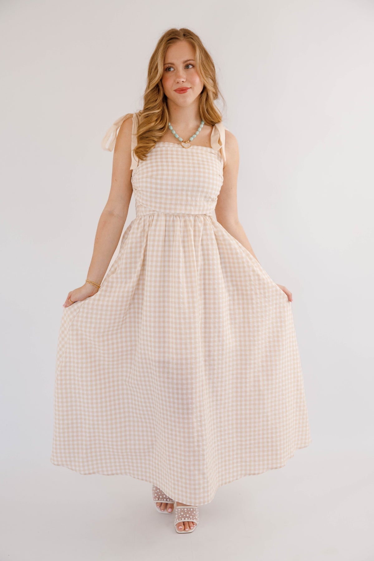 Beige Gingham Maxi Dress- Neutral Vacation Beach Dress- Cloud Ten Tan Gingham Dress