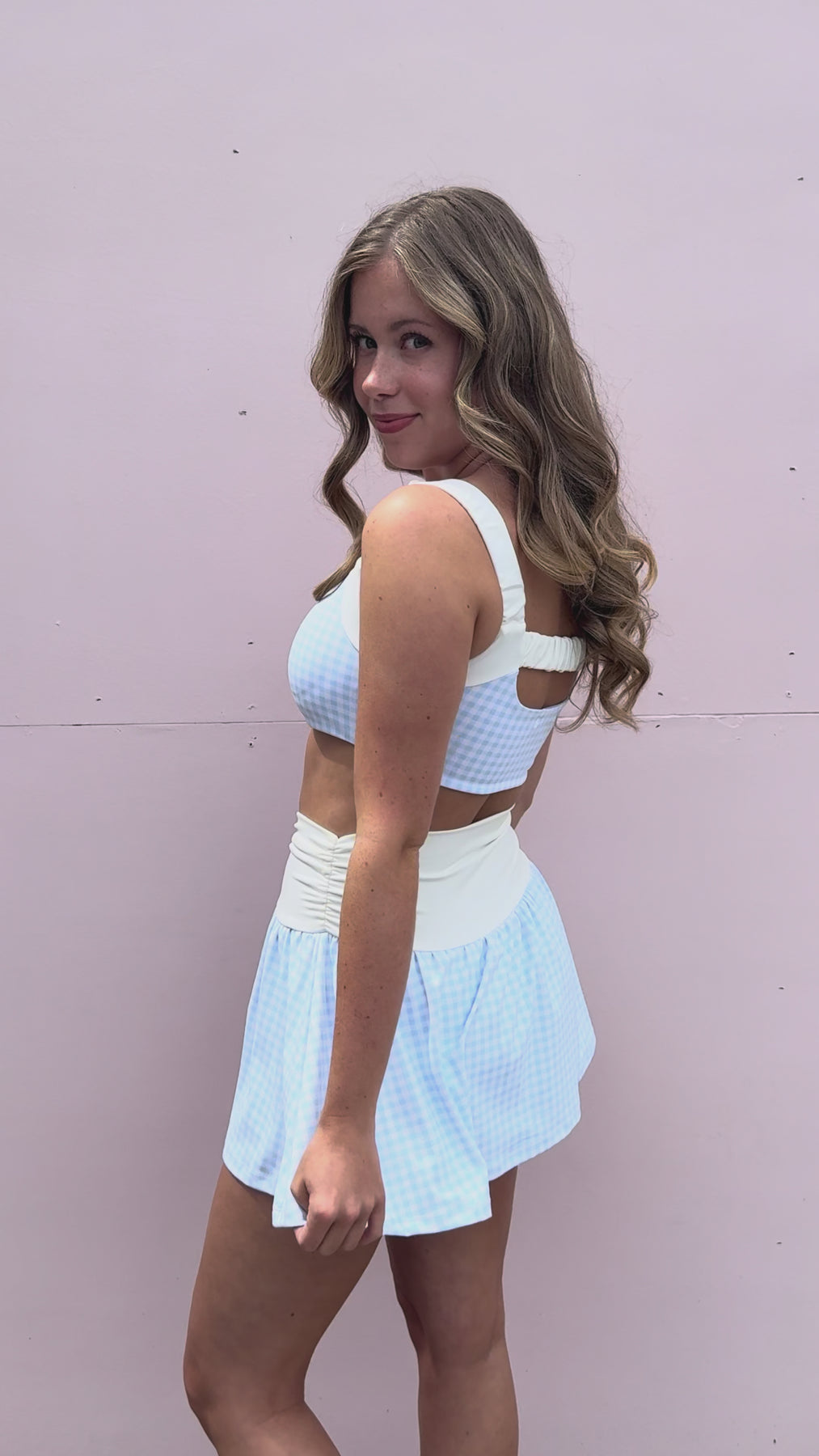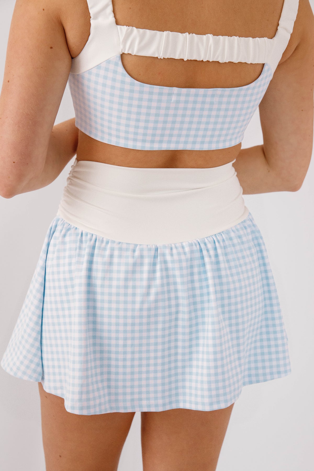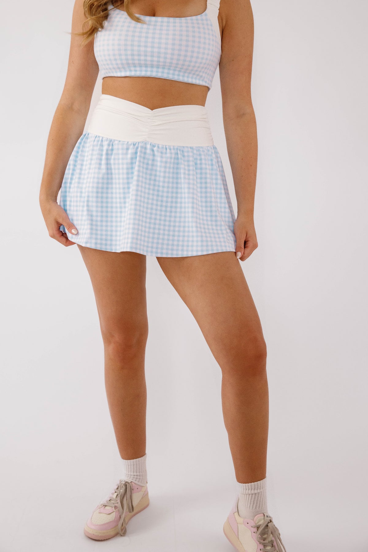 Feminine and effortlessly polished, this blue gingham skort is the perfect blend of comfort and charm. Designed with a flattering ruched waistband and a soft, flowy silhouette, it offers a playful skirt look with the ease of built-in shorts underneath. The delicate gingham print adds a timeless, fresh feel—perfect for spring and summer styling. Waist is elastic for a flexible fit.