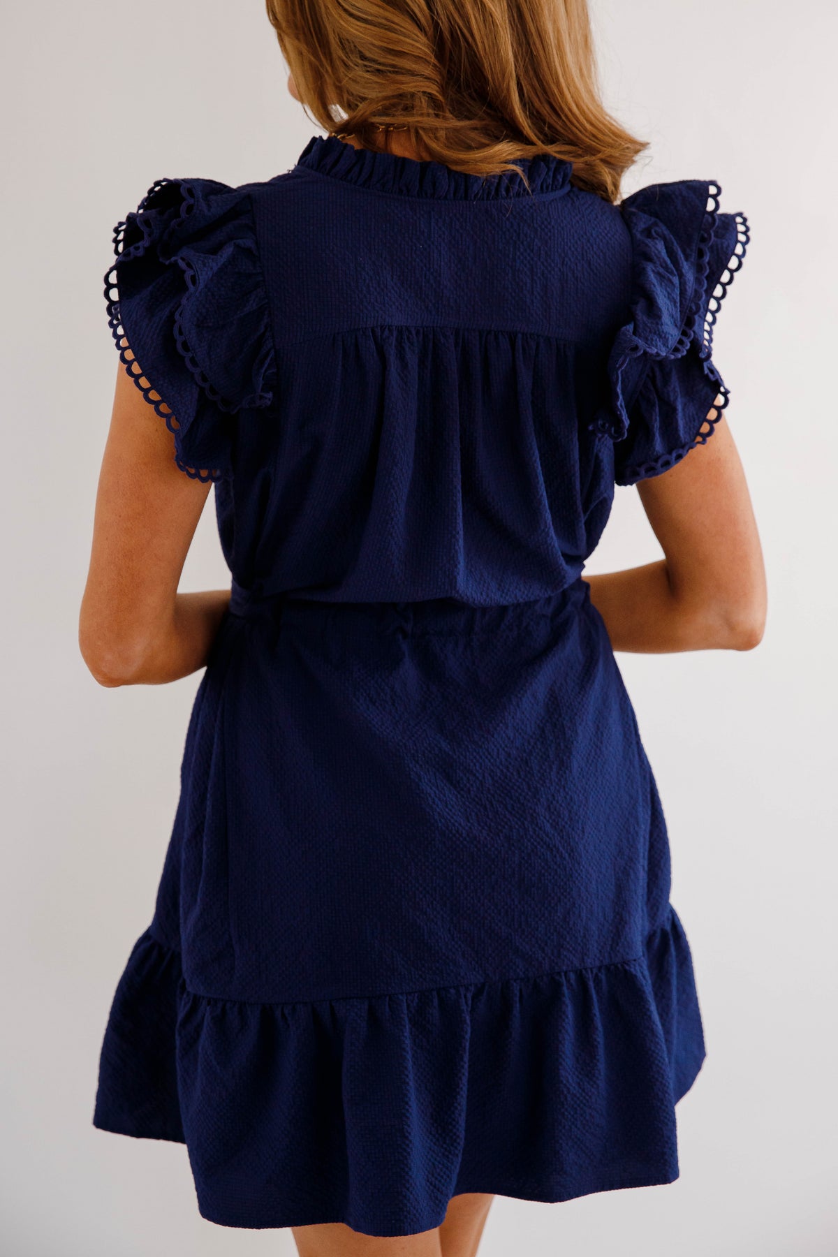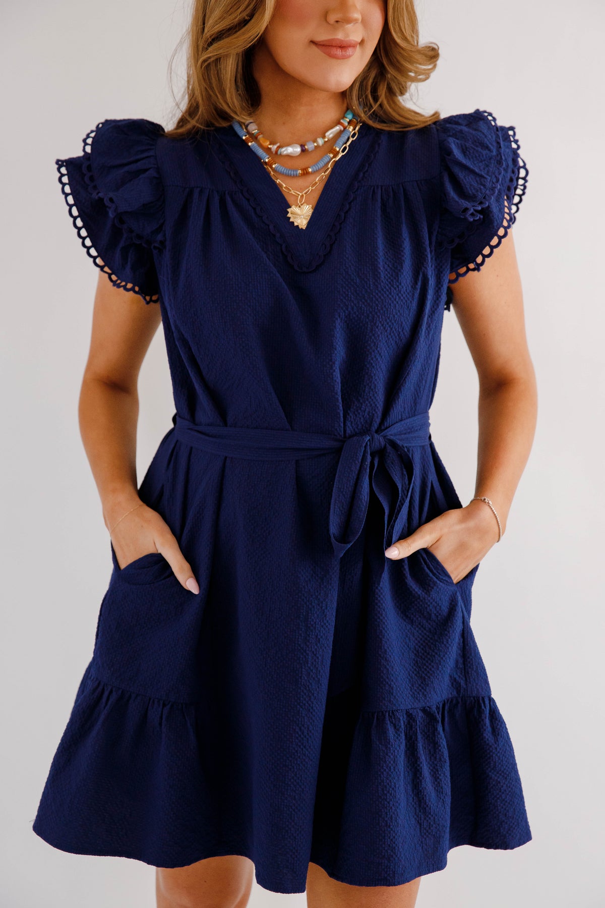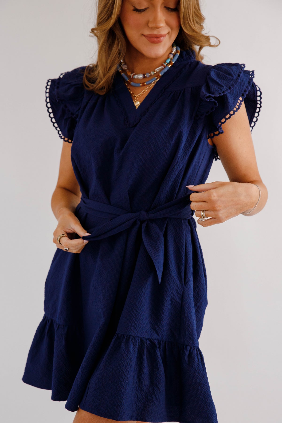 Embrace effortless elegance in this navy seersucker dress, designed with timeless charm and modern comfort. A flattering V-neck features delicate scalloped trim, while romantic ruffle cap sleeves add a touch of feminine flair. The adjustable waist tie lets you customize the fit to your preference, creating a silhouette that feels uniquely yours. Whether you're heading to brunch or a garden party, this versatile piece transitions seamlessly from day to evening.