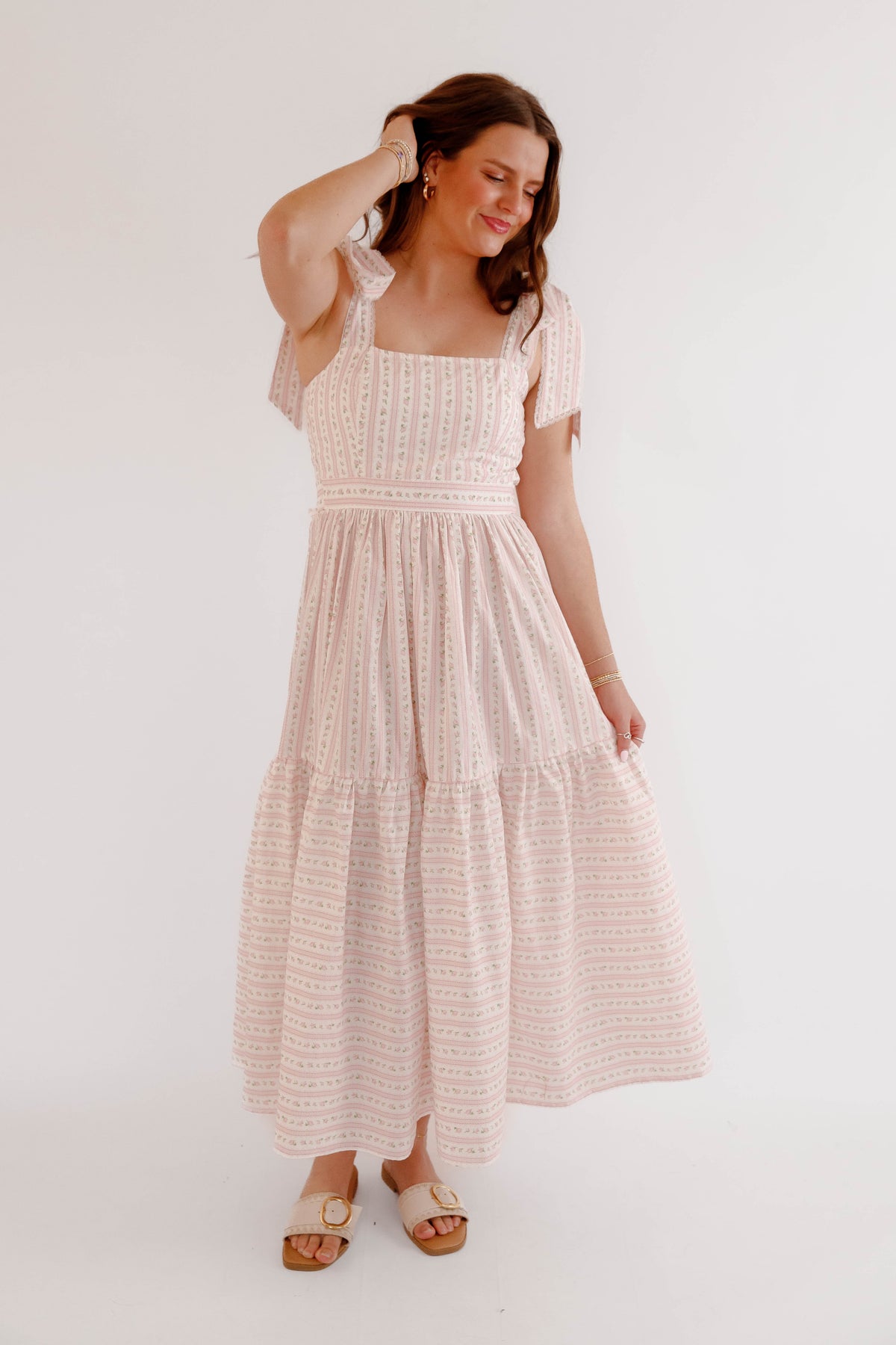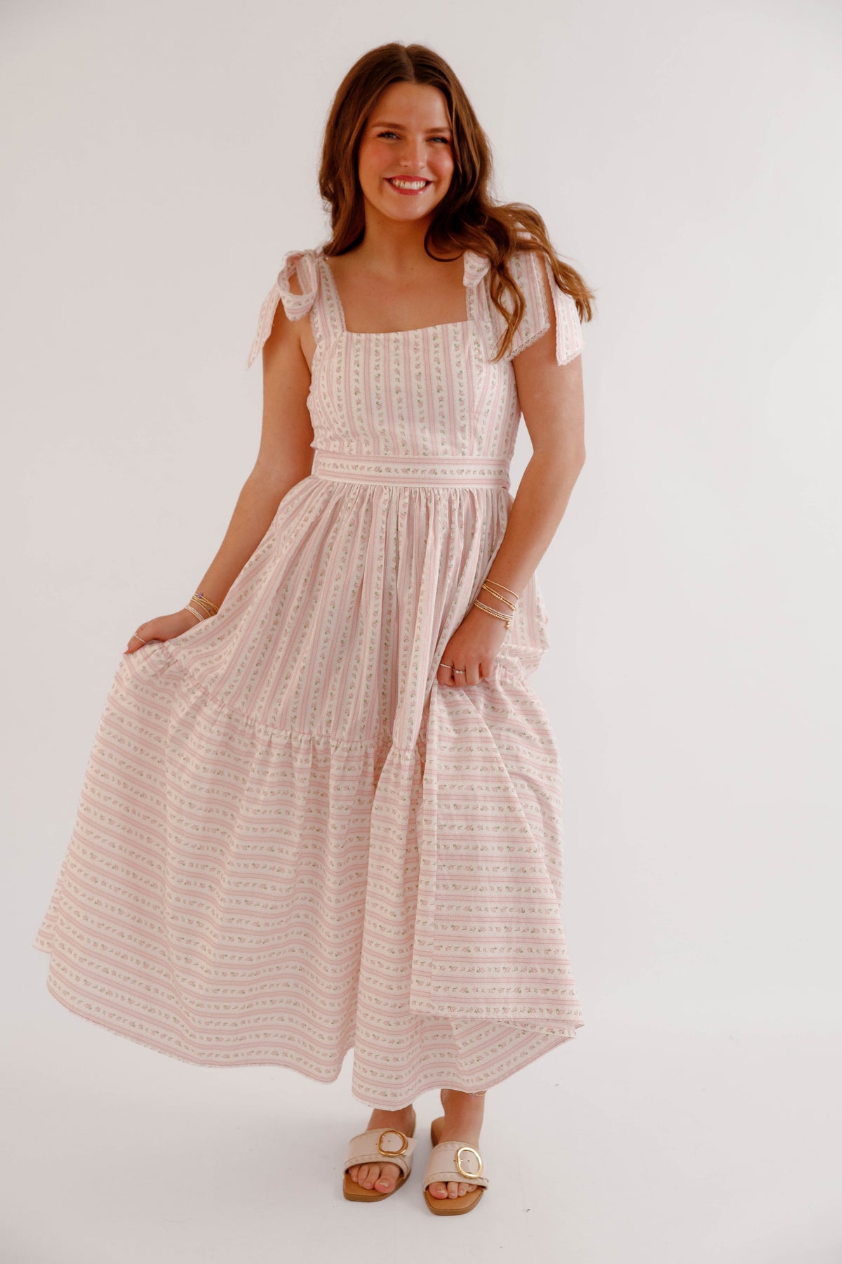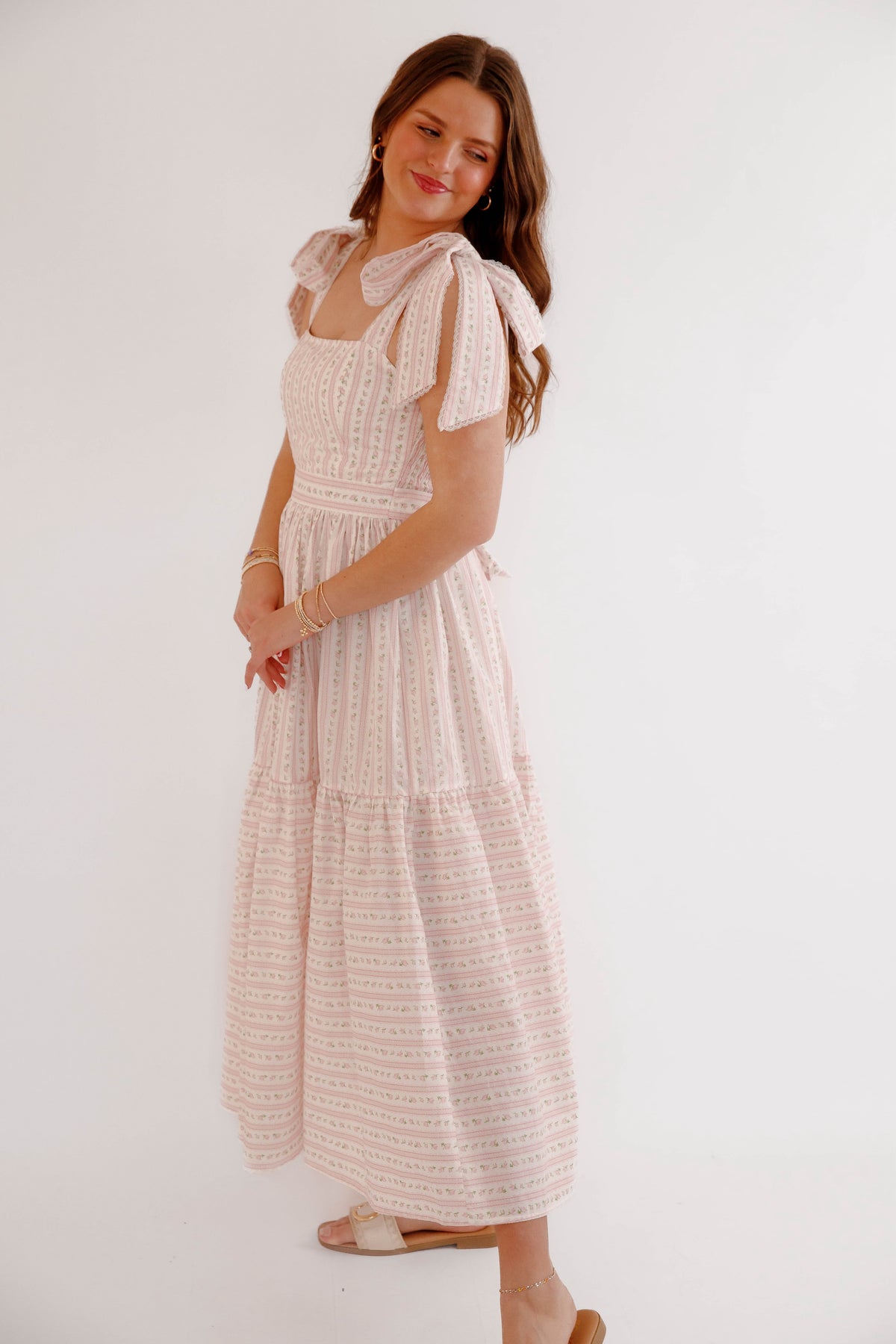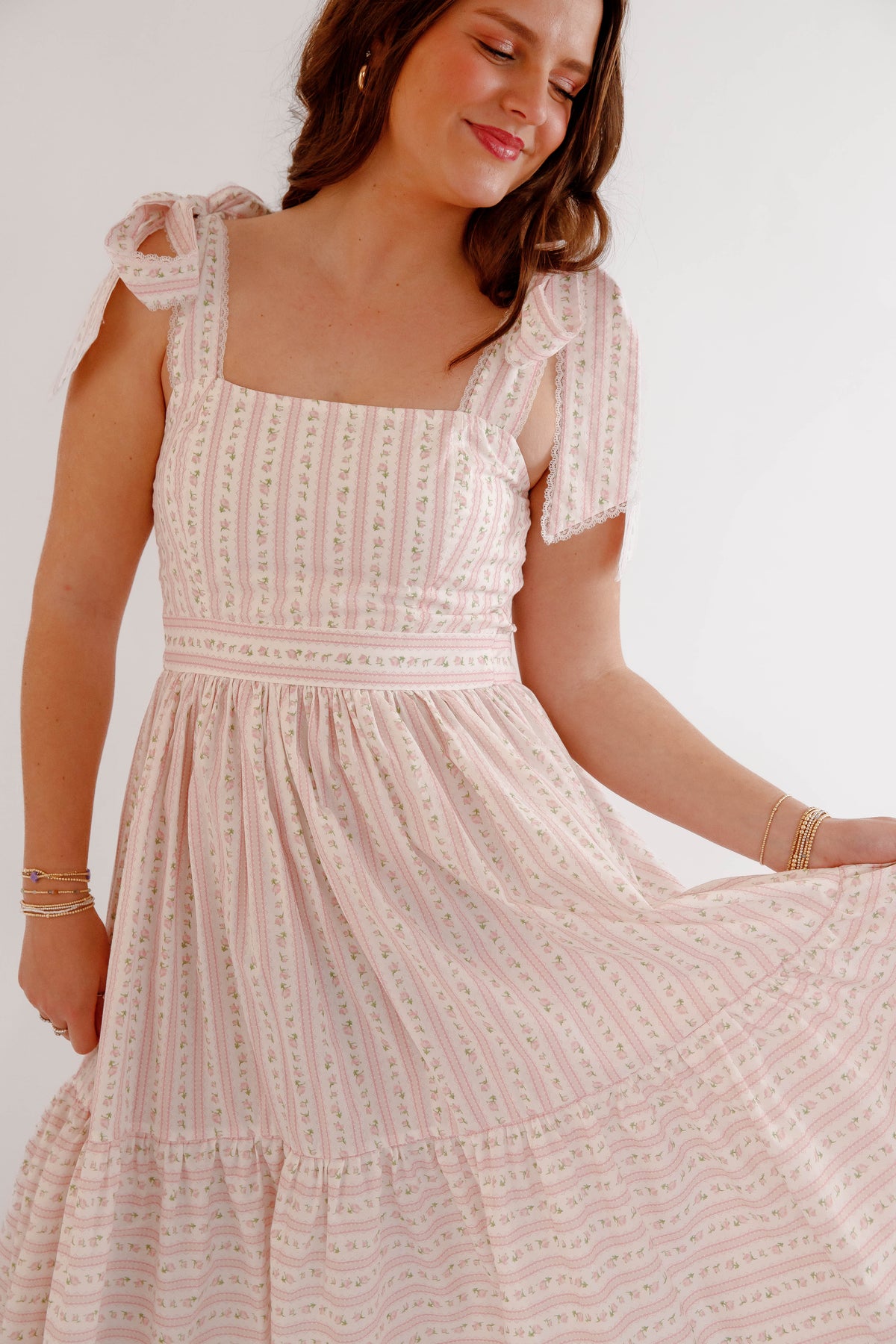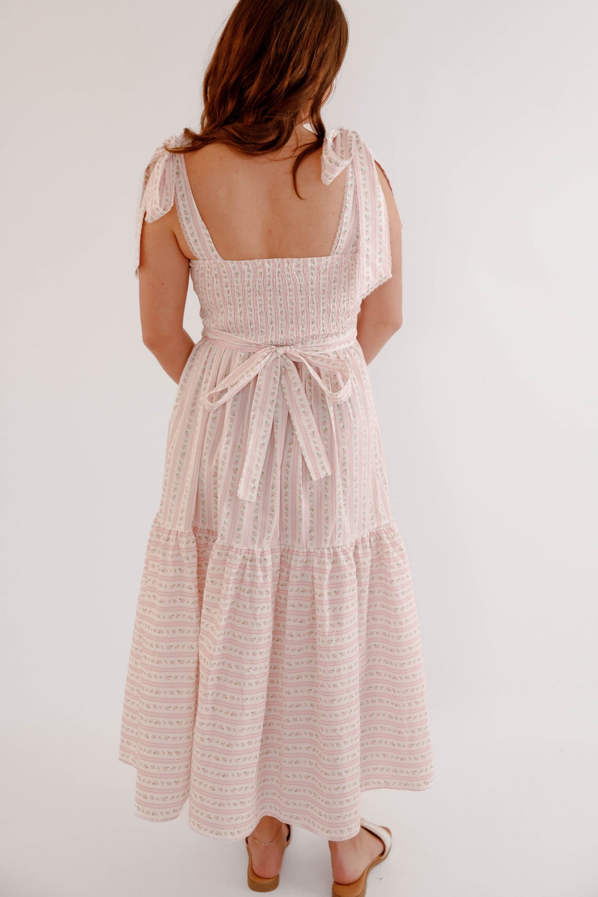 This pink floral bow shoulder midi dress is the perfect piece for spring and summer styling. Designed with a flattering square neckline and delicate bow tie shoulder straps, this dress offers a soft, feminine silhouette that feels both timeless and playful. The subtle pink floral pattern paired with delicate vertical detailing creates a vintage-inspired cottagecore aesthetic, while the fitted bodice and flowing tiered midi skirt provide comfort and beautiful movement. The back of the dress is smocked for a flexible fit.
