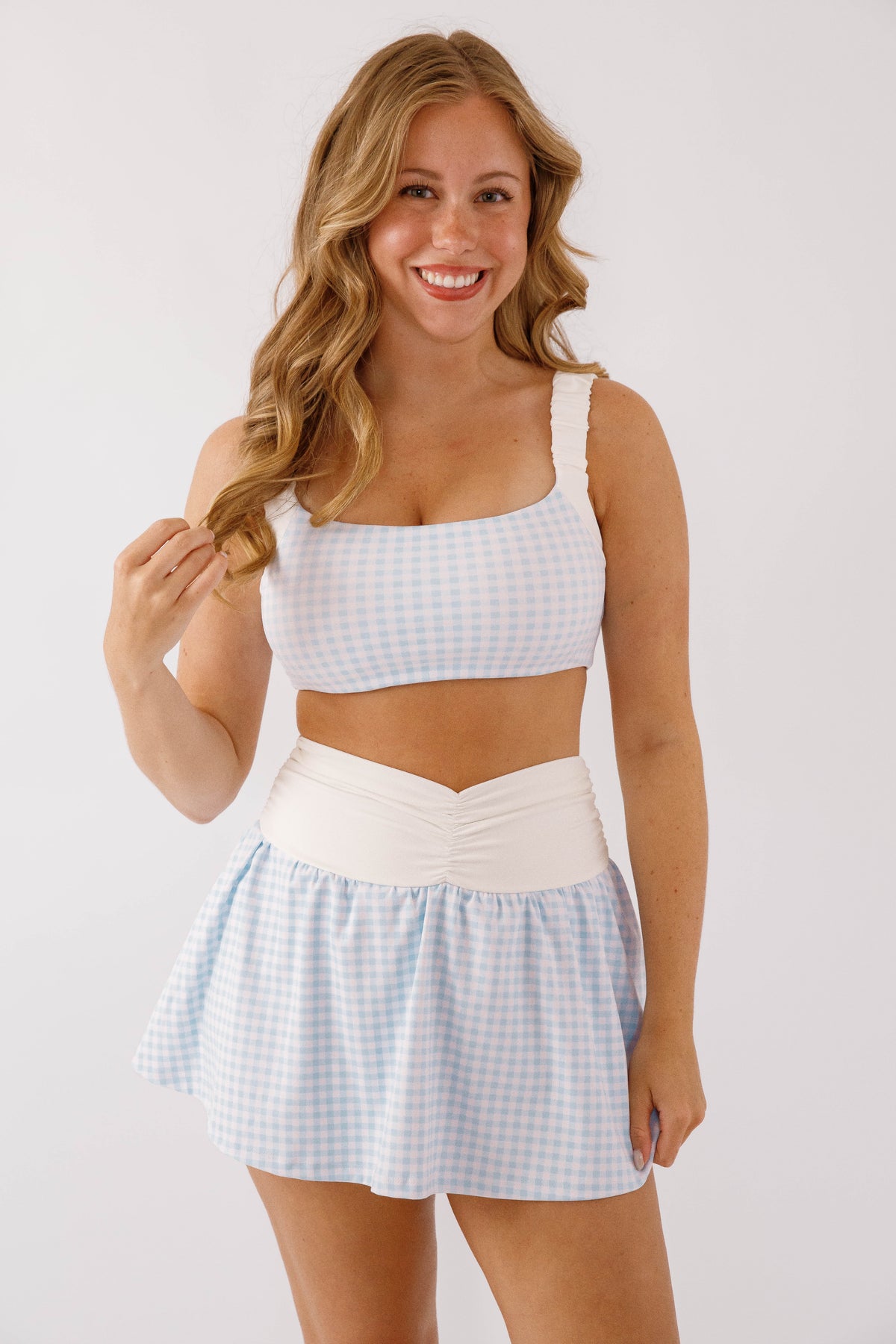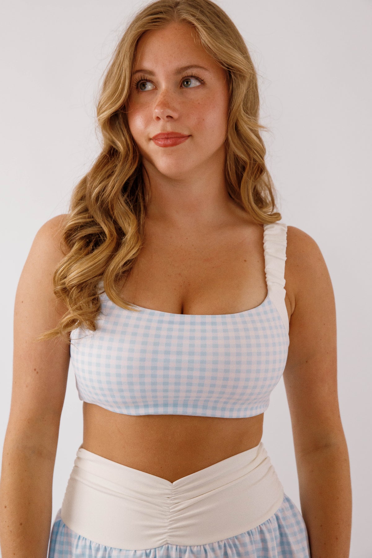 Sporty meets chic with this blue and white gingham sports bra, designed for both movement and style. Featuring a flattering square neckline and supportive wide straps, it offers a comfortable, secure fit for low to medium impact activities. The classic gingham print adds a playful, elevated touch, making it perfect for workouts, athleisure looks.
