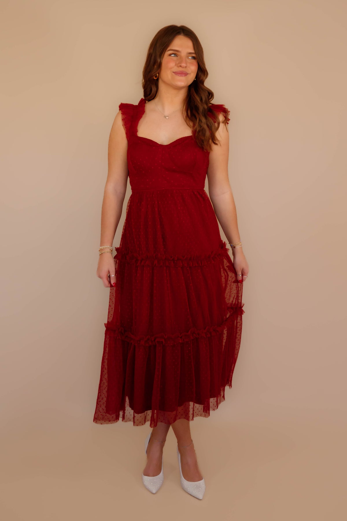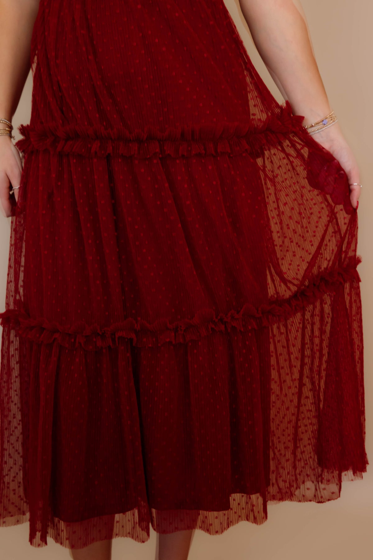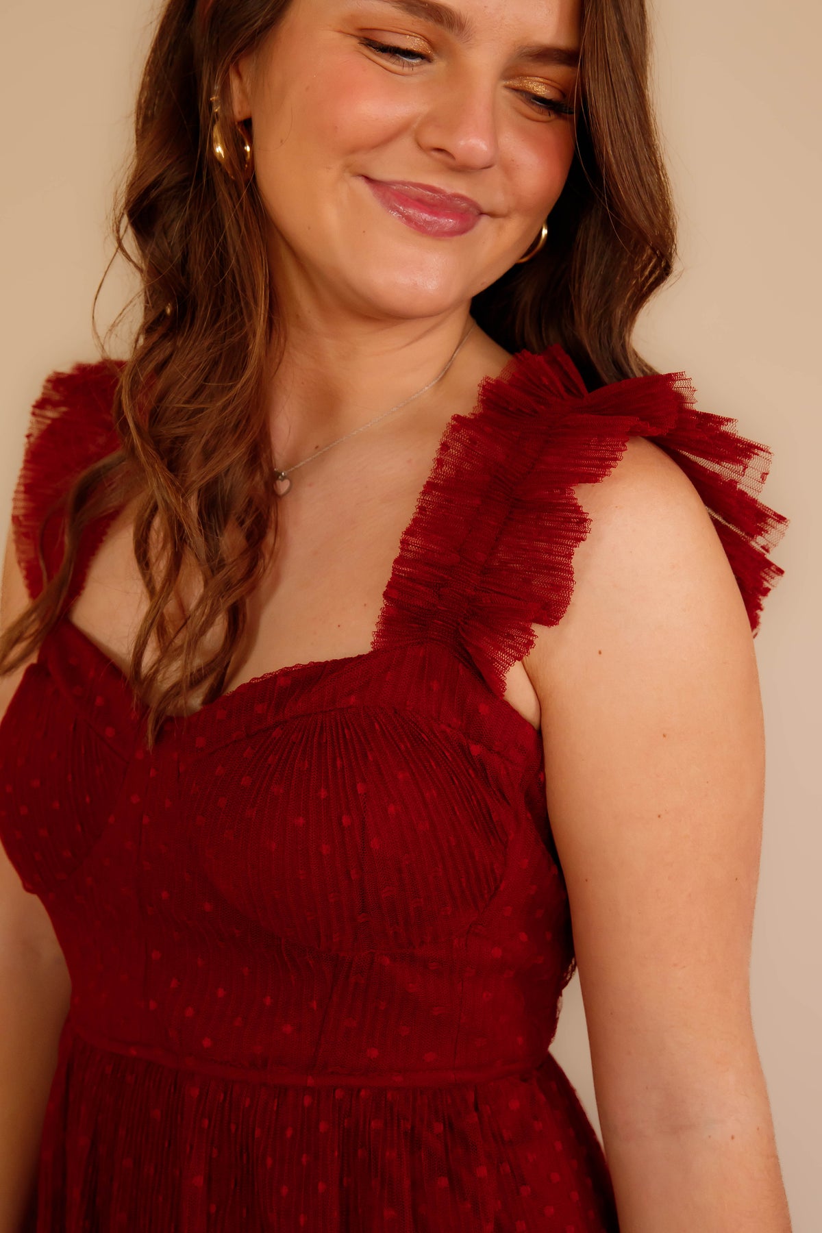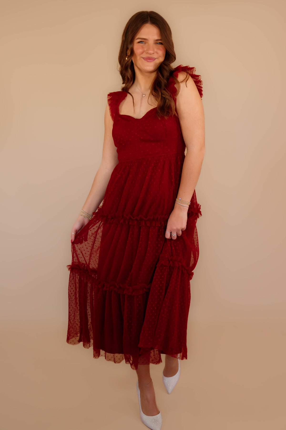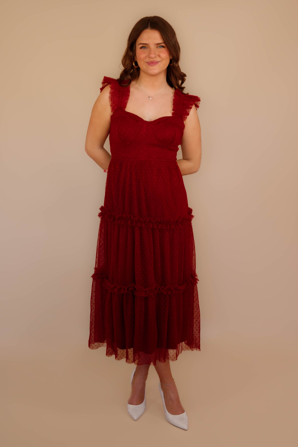 Discover the dress that transforms any occasion into something memorable! This wine swiss dot midi dress combines timeless elegance with modern details that truly stand out. The sweetheart neckline creates an instantly flattering frame, while elastic ruffle straps add playful sophistication. Tiered ruffles cascade down the skirt for graceful movement and visual interest, and the back smocking ensures a personalized, comfortable fit that adapts to your body. From casual gatherings to special celebrations, this versatile piece is the answer to looking polished and put-together effortlessly!