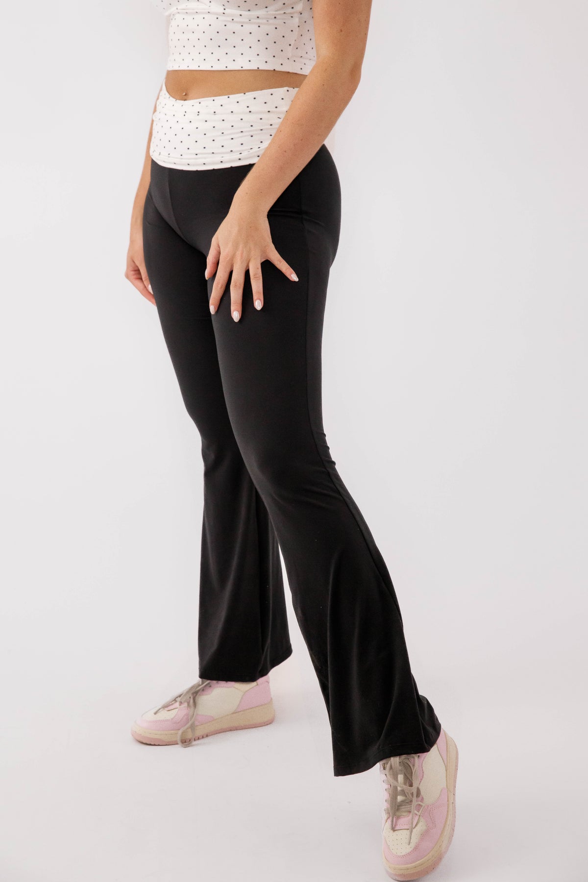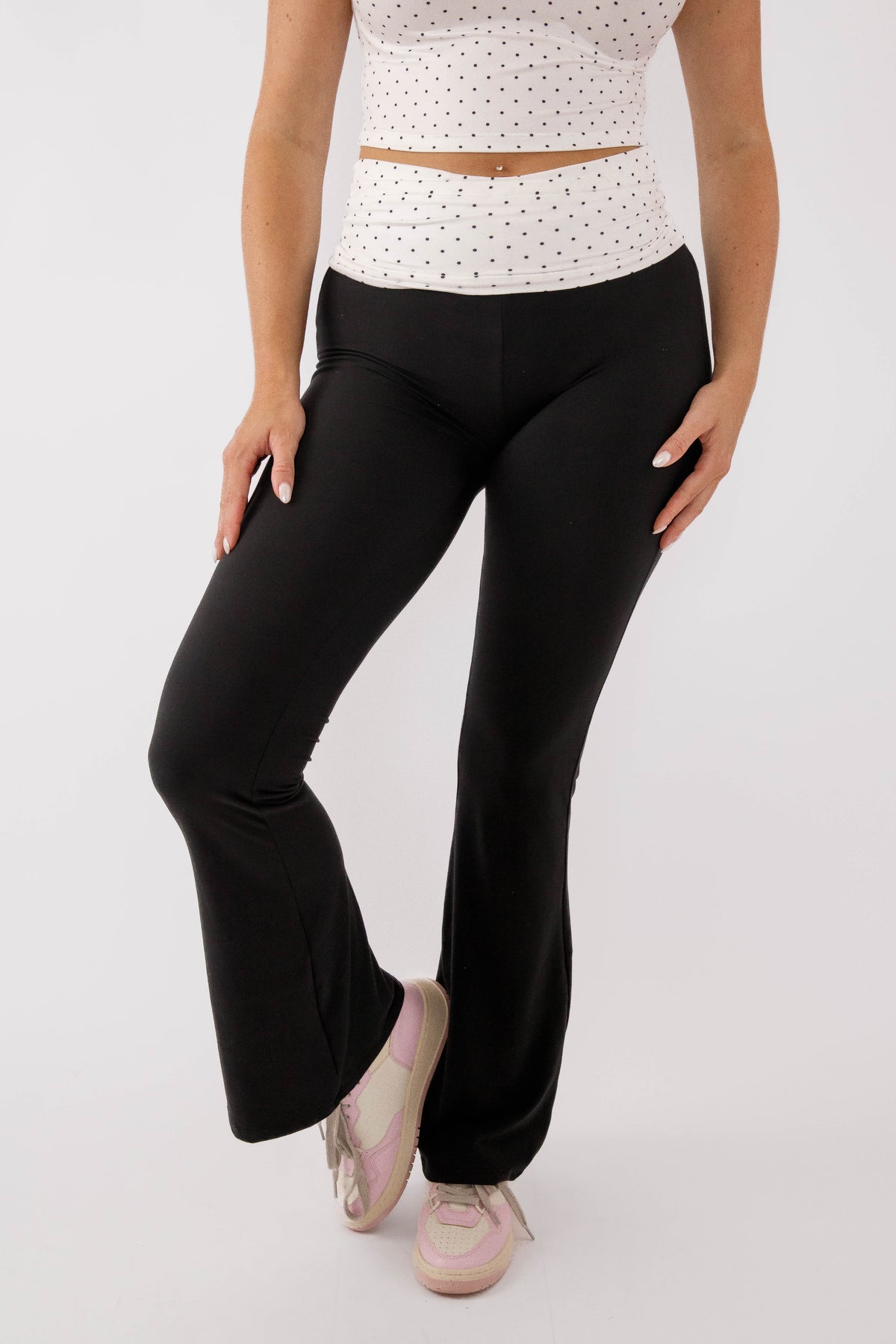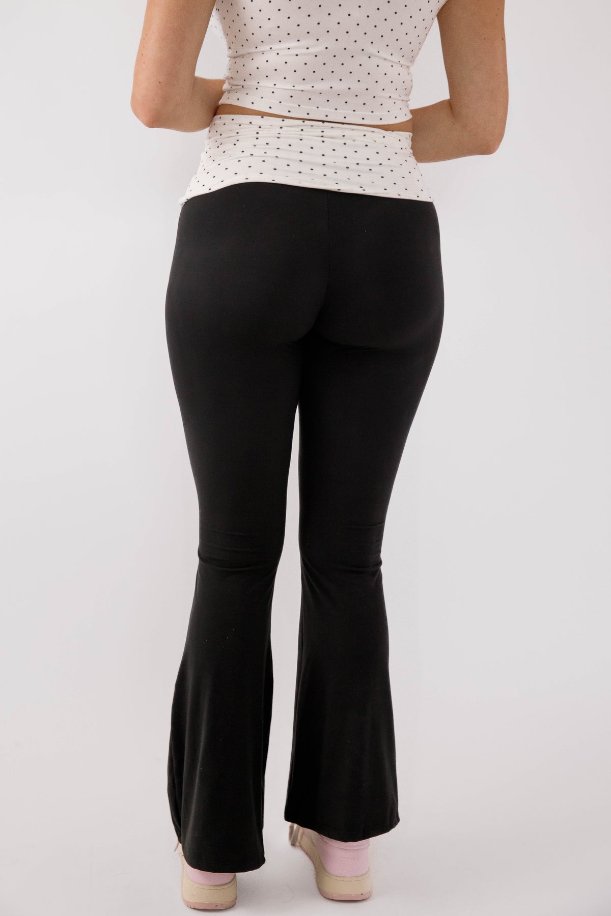 Sleek, sculpting, and effortlessly versatile, these black flared pants are designed to move with you from workouts to everyday wear. Featuring a flattering high-rise waistband with a soft contrast panel detail, they provide a smooth, supportive fit that enhances your shape.