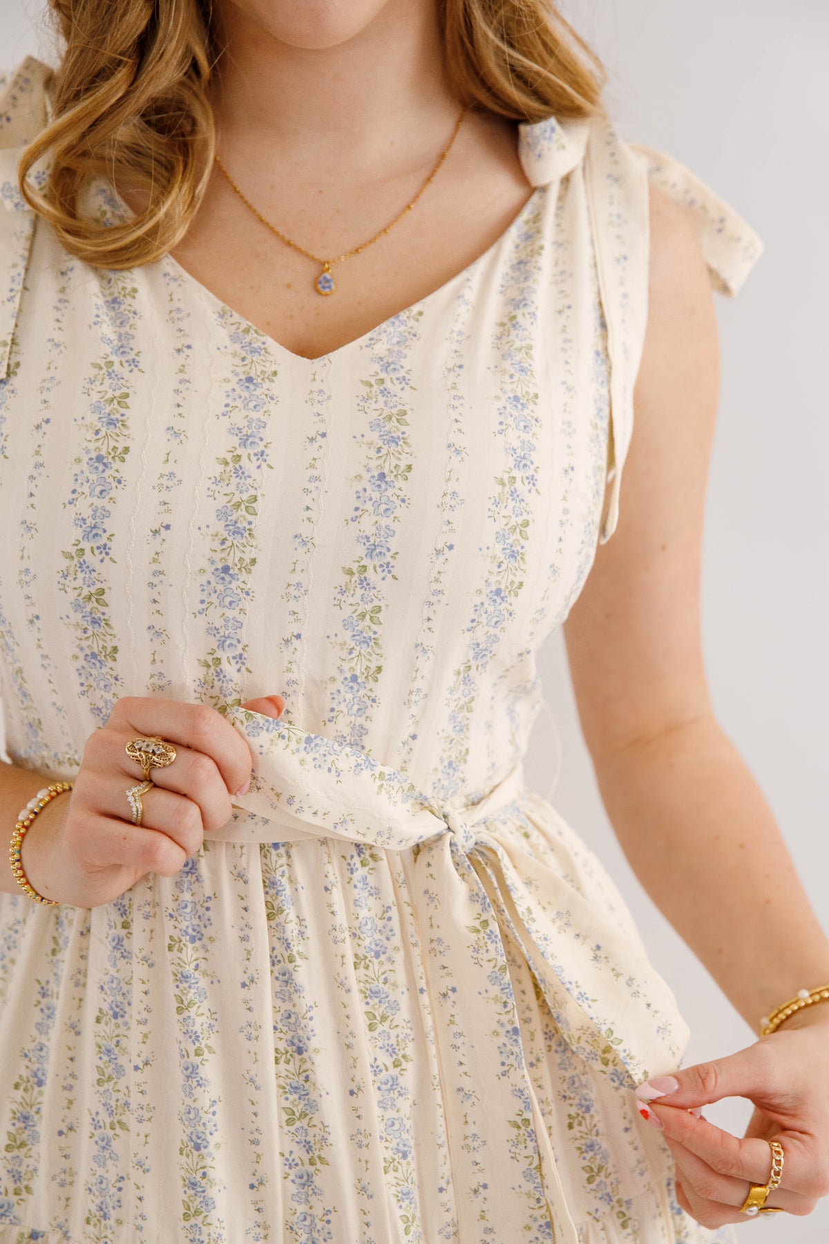 Embrace effortless spring style with this charming blue striped floral maxi dress. Featuring a romantic tiered skirt and adjustable tie straps, it offers a flattering silhouette enhanced by a cinched waist tie. The hidden side zipper ensures a seamless look, while the structured fabric provides a polished finish. Perfect for garden parties, weddings, or casual outings.