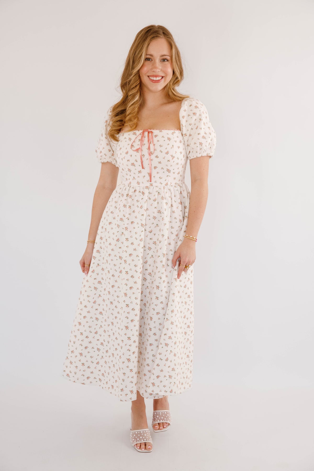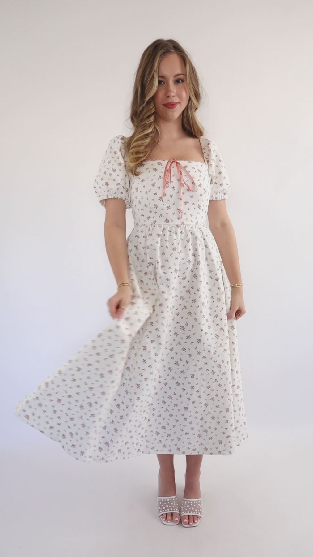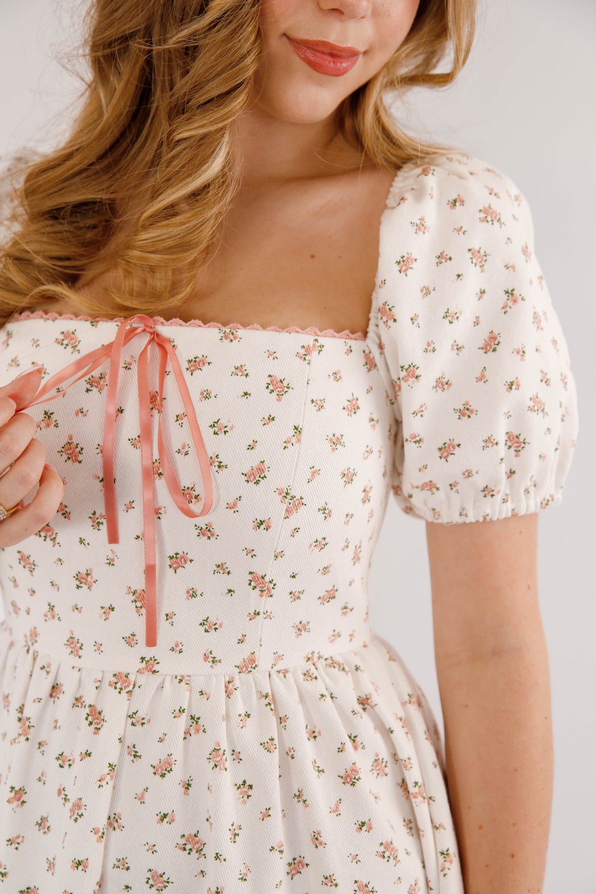 Elevate your wardrobe with this charming midi dress featuring a delicate floral print on classic denim fabric. The elastic sleeves offer comfortable movement, while scalloped trim adorns the chest with an adjustable ribbon tie for a personalized fit. A smocked back adds texture and visual interest, complemented by a discreet hidden zipper for easy wear. Perfect for casual outings or dressed-up occasions, this piece combines vintage-inspired details with modern comfort.