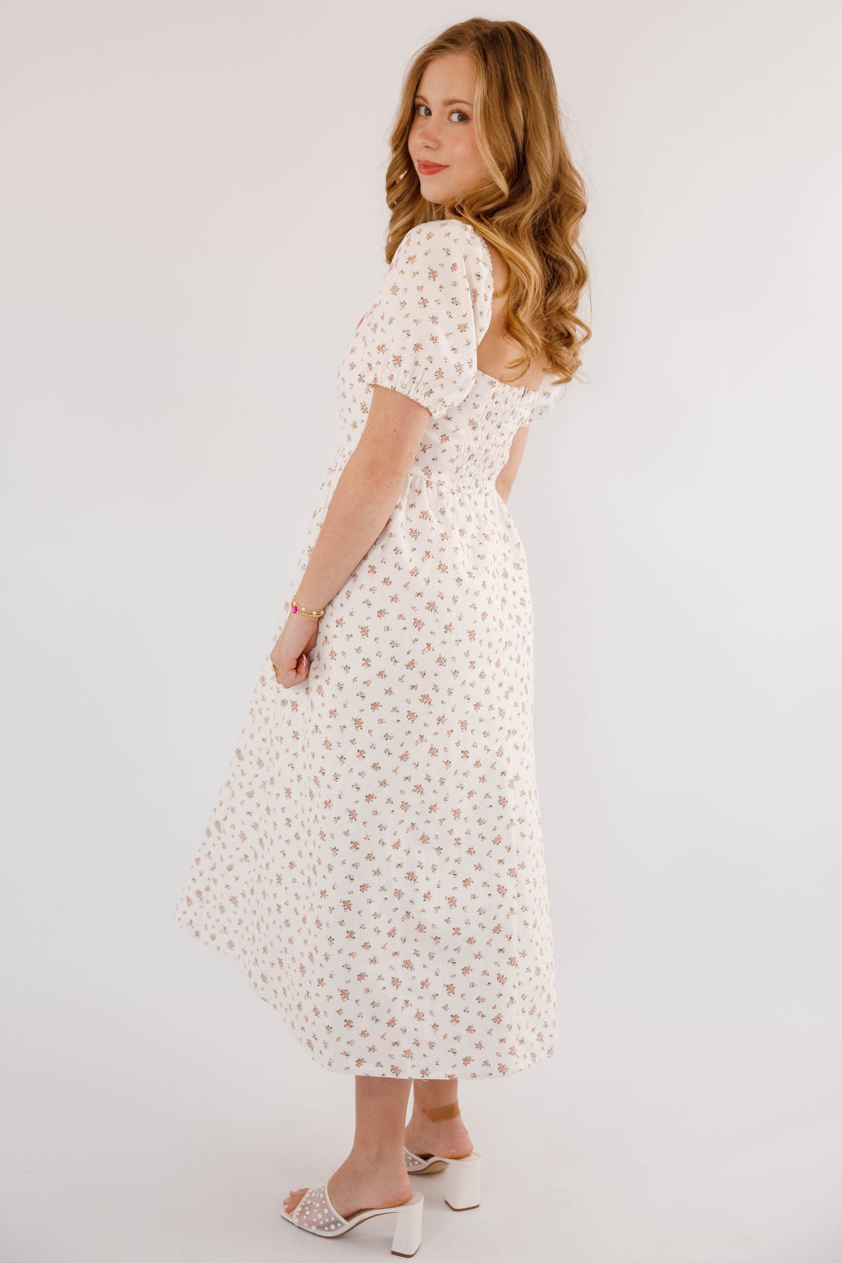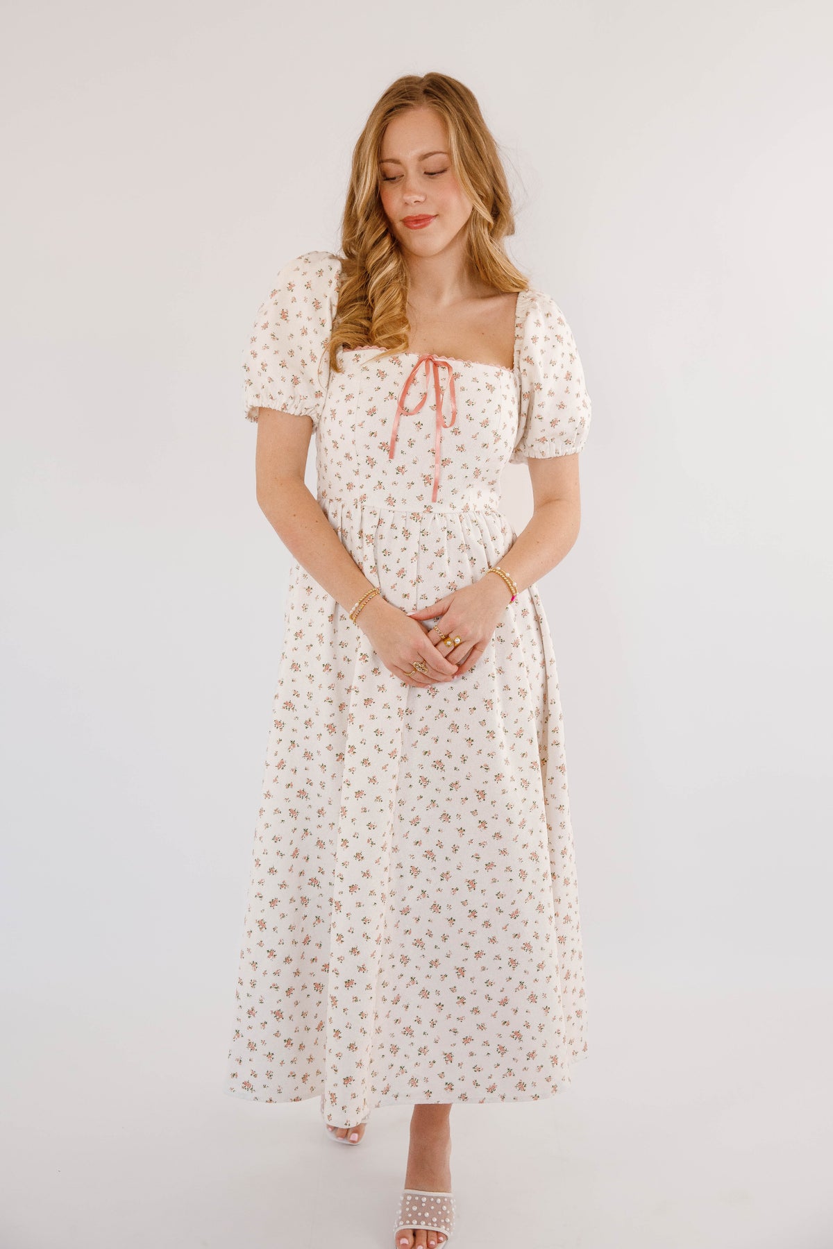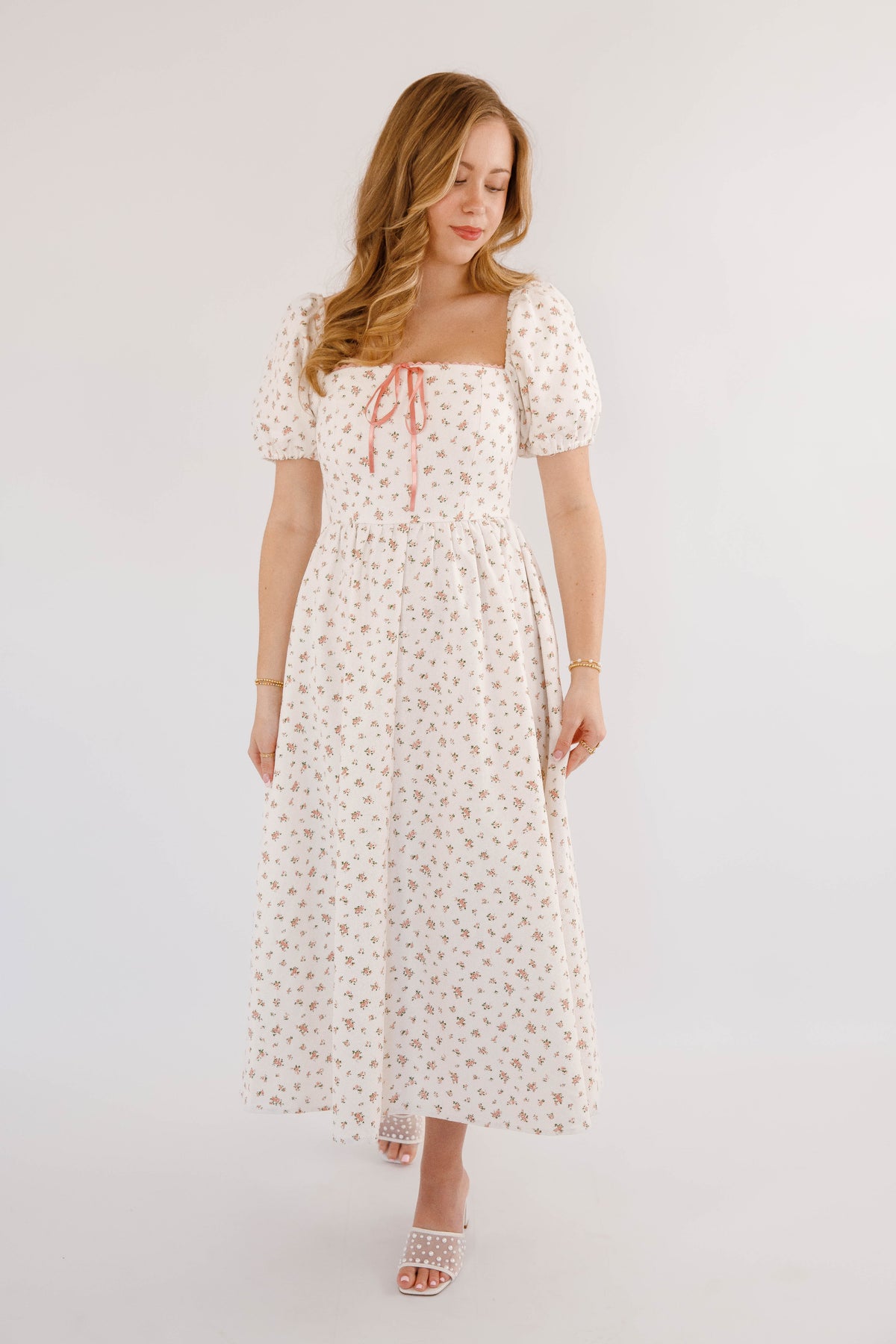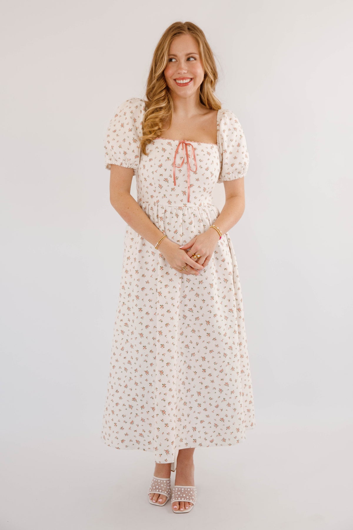 Elevate your wardrobe with this charming midi dress featuring a delicate floral print on classic denim fabric. The elastic sleeves offer comfortable movement, while scalloped trim adorns the chest with an adjustable ribbon tie for a personalized fit. A smocked back adds texture and visual interest, complemented by a discreet hidden zipper for easy wear. Perfect for casual outings or dressed-up occasions, this piece combines vintage-inspired details with modern comfort.